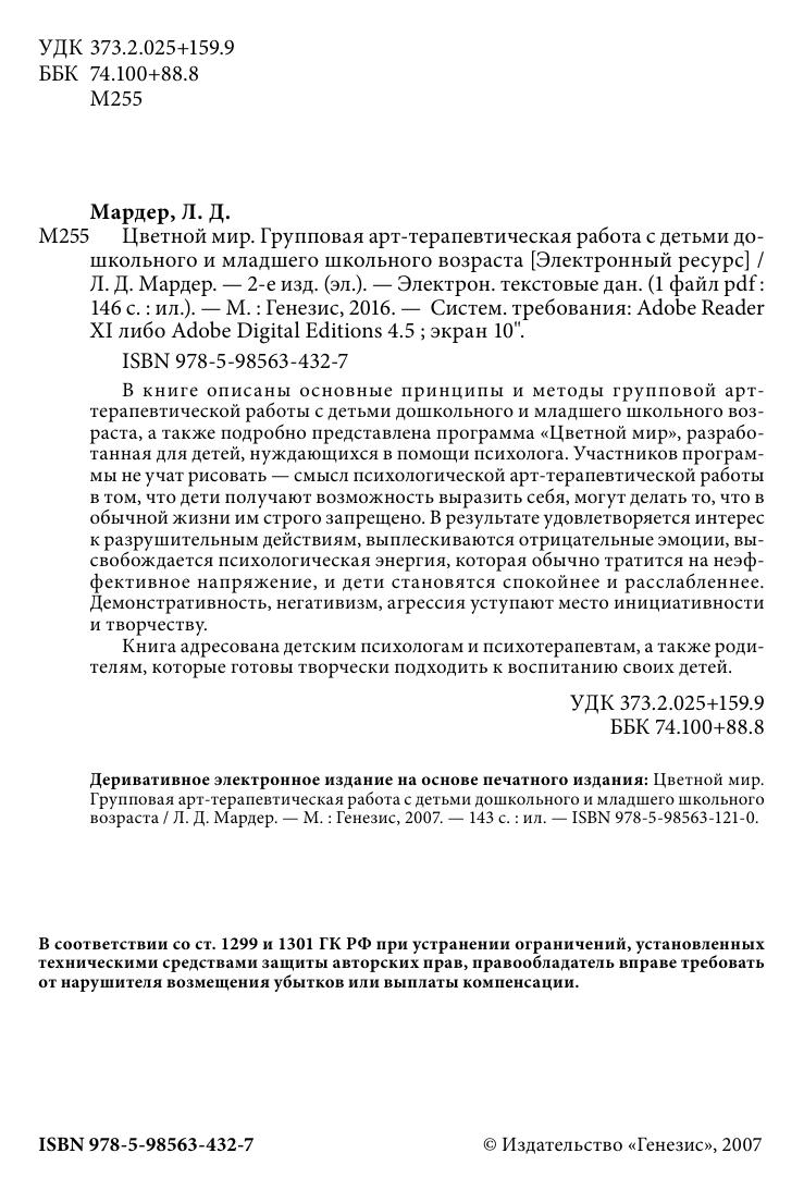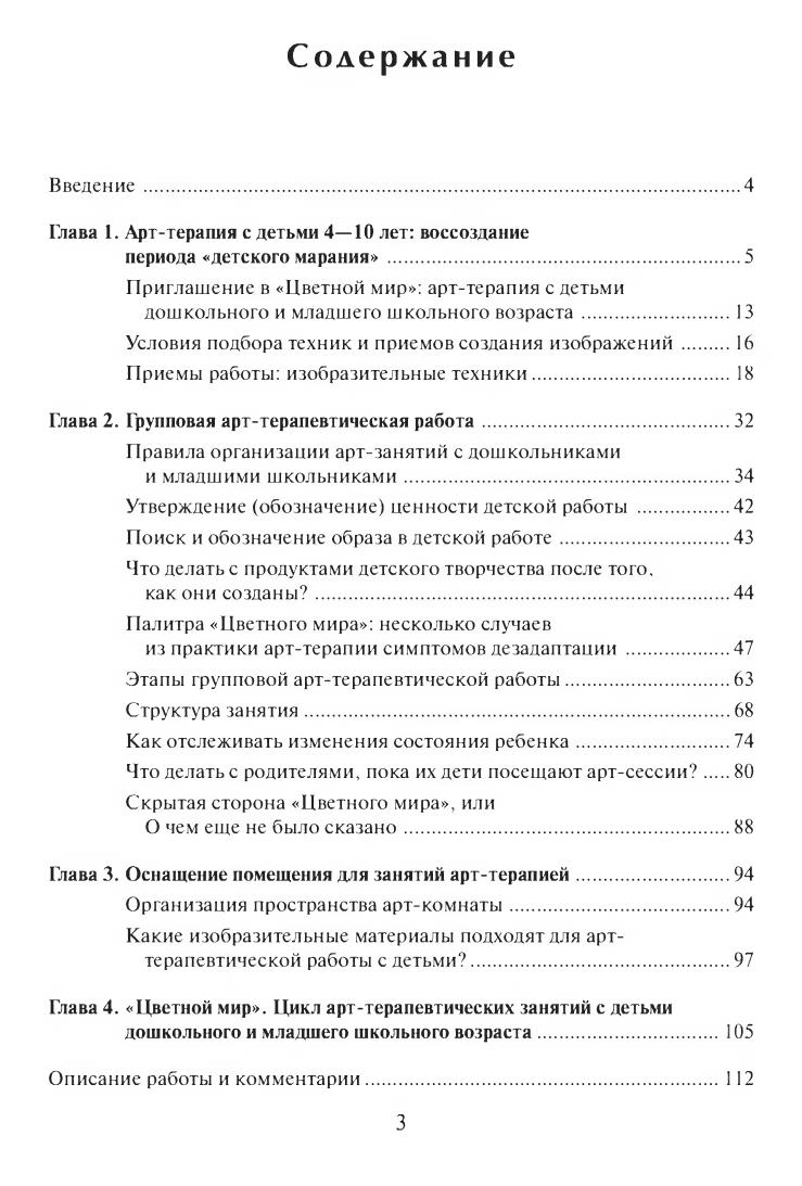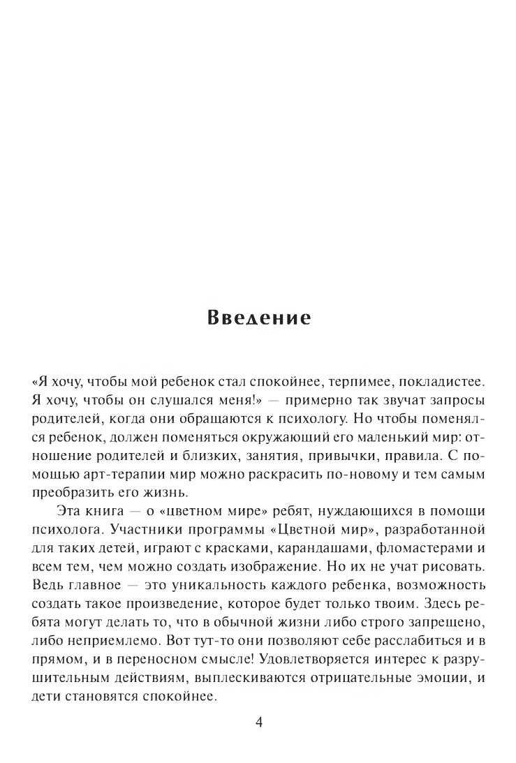 В книге описаны основные принципы и методы групповой арт-терапевтической работы с детьми дошкольного и младшего школьного возраста, а также подробно представлена программа «Цветной мир», разработанная для детей, нуждающихся в помощи психолога. Участников программы не учат рисовать — смысл психологической арт-терапевтической работы в том, что дети получают возможность выразить себя, могут делать то, что в обычной жизни им строго запрещено. В результате удовлетворяется интерес к разрушительным действиям, выплескиваются отрицательные эмоции, высвобождается психологическая энергия, которая обычно тратится на неэффективное напряжение, и дети становятся спокойнее и расслабленнее. Демонстративность, негативизм, агрессия уступают место инициативности и творчеству.