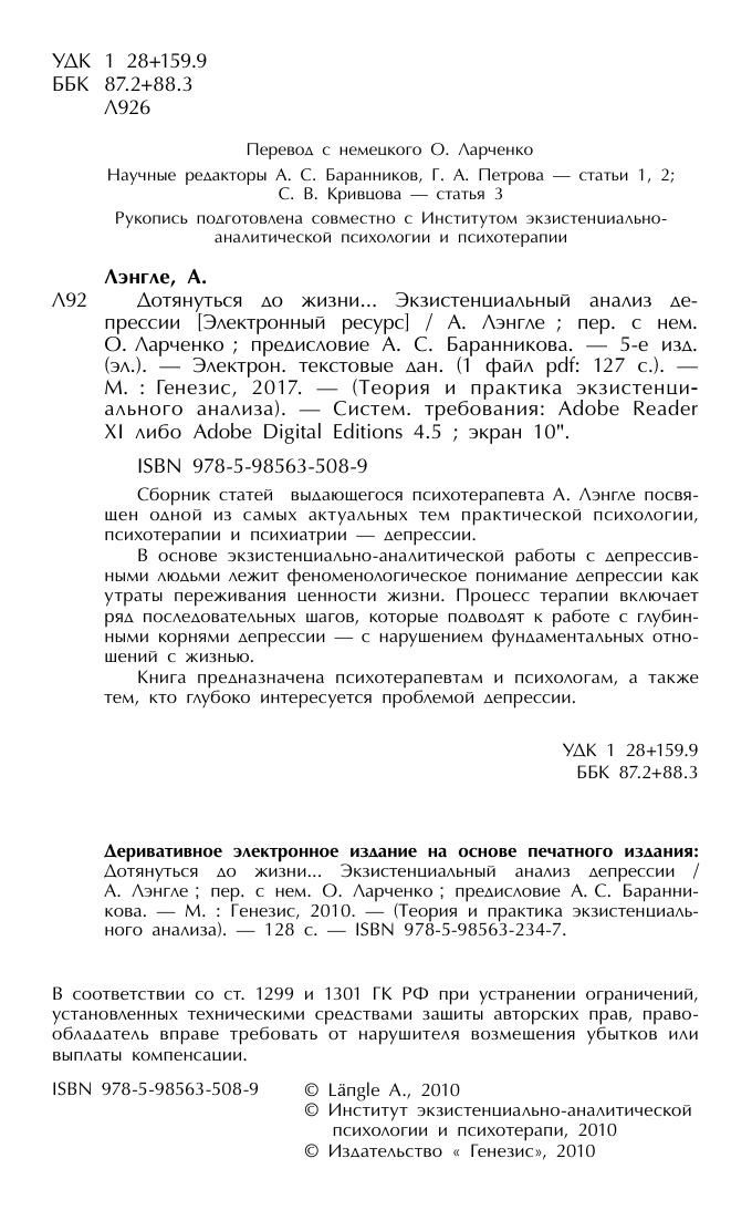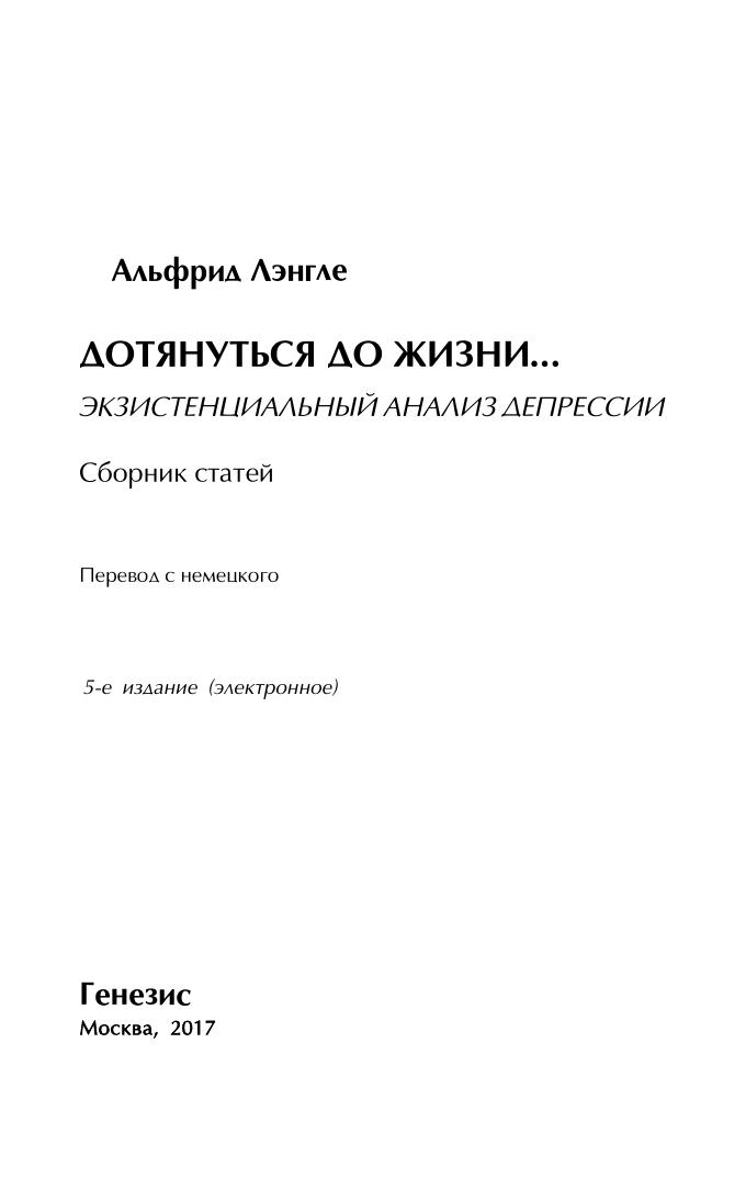 Сборник статей выдающегося психотерапевта А. Лэнгле посвящен одной из самых актуальных тем практической психологии, психотерапии и психиатрии — депрессии.