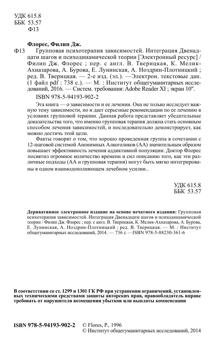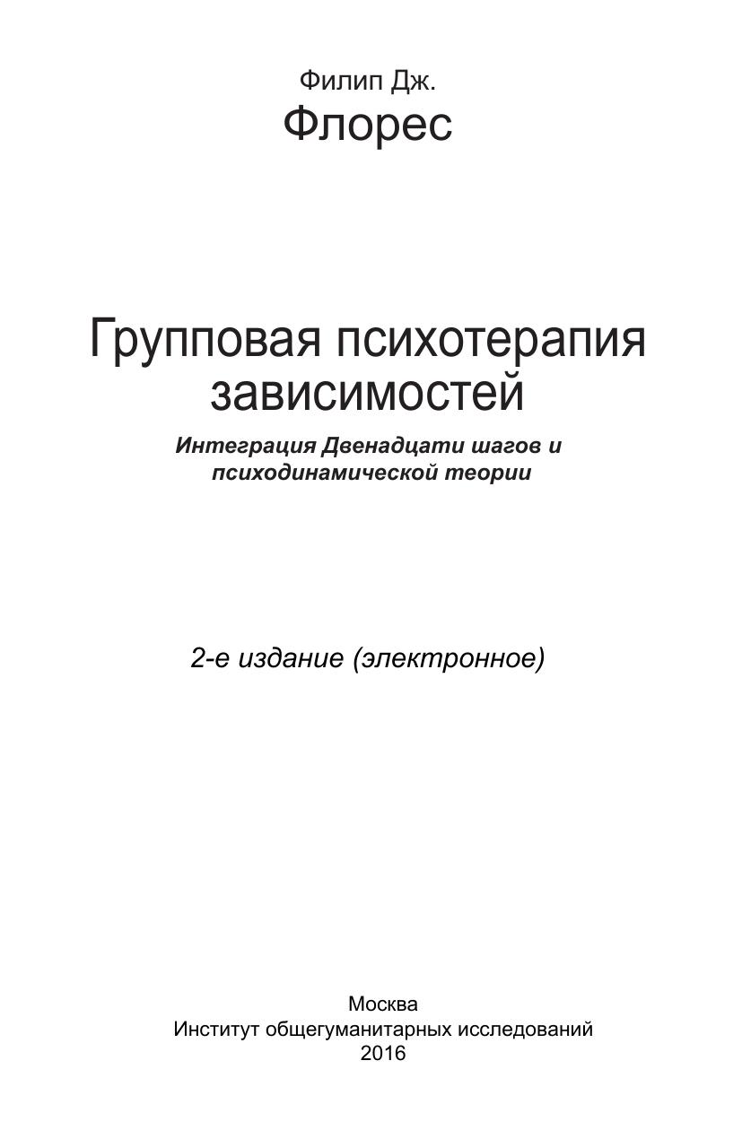 Факты говорят о том, что хорошо проведенная группа в сочетании с 12-шаговой системой Анонимных Алкоголиков (АА) значительным образом повышает эффективность лечения аддиктивной популяции. Доктор Флорес посвятил огромное количество времени и сил описанию того, как эти различные подходы (АА и групповая терапия) могут быть мягко интегрированы в одном взаимодополняющем лечебном усилии.