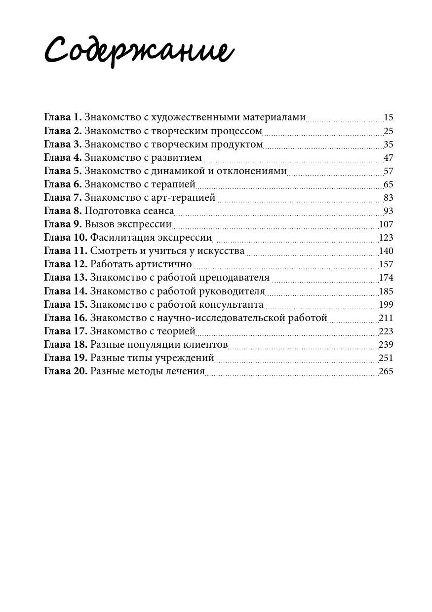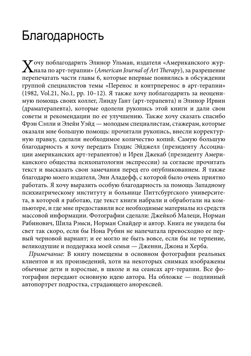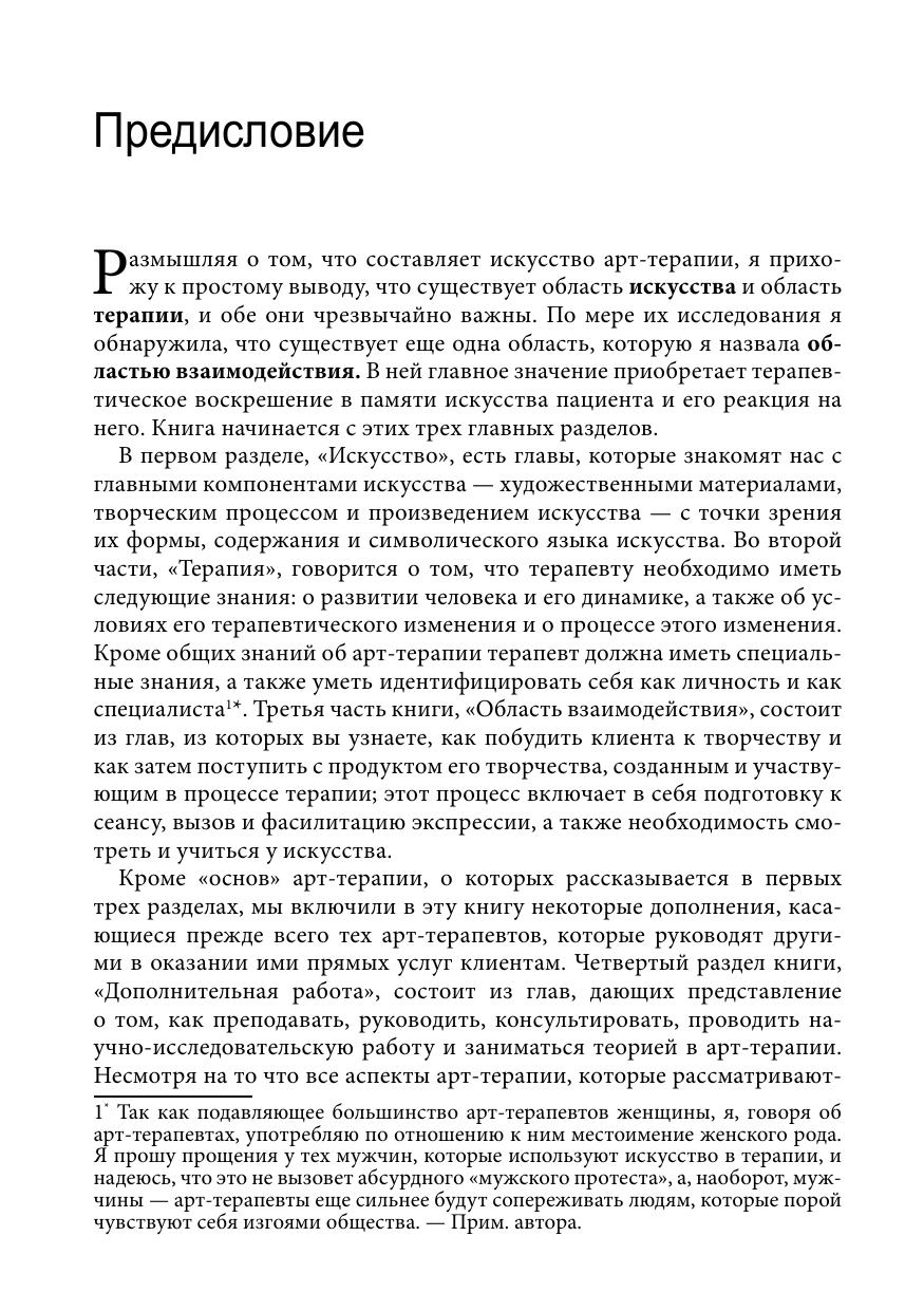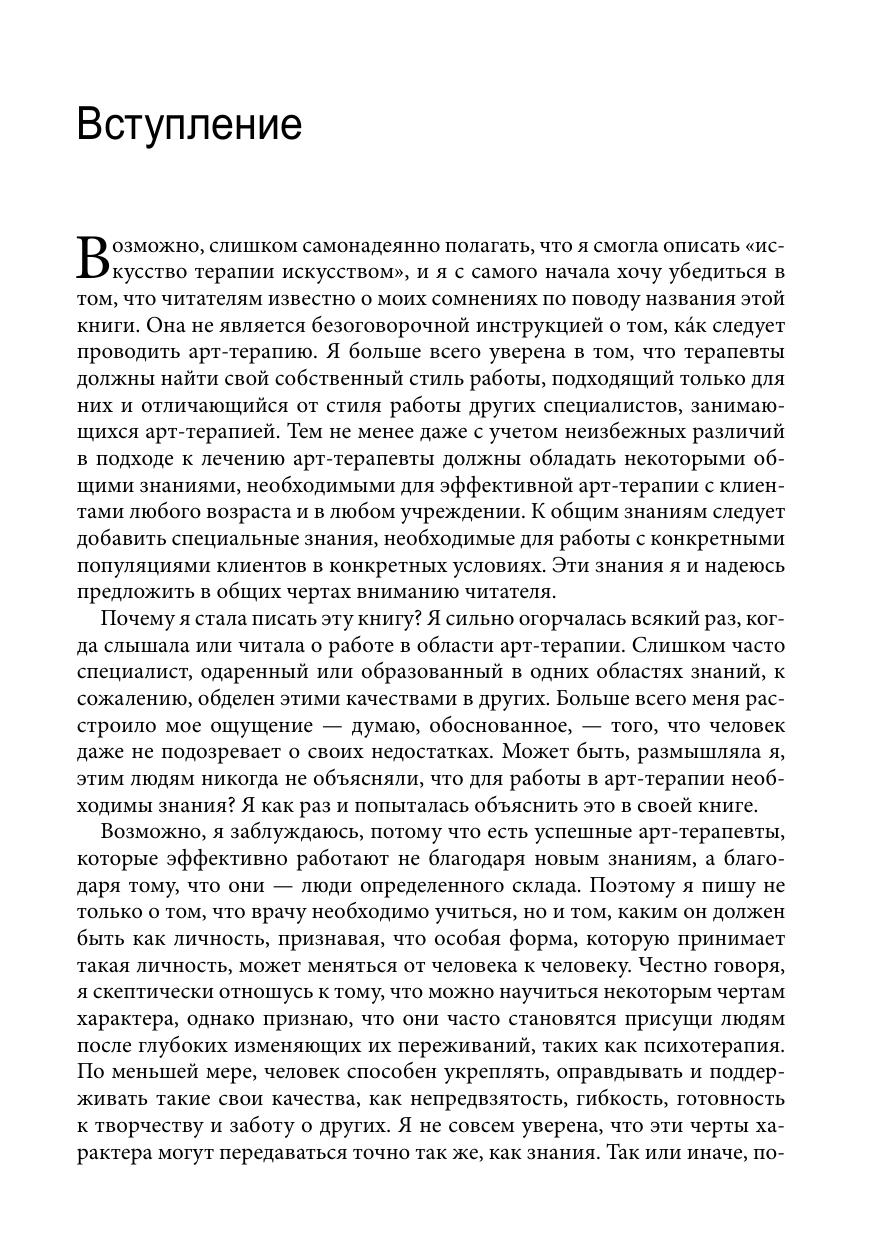 Автор демонстрирует тонкий и деликатный подход к арт-терапии, представляя основные методики лечения эмоционально, увлеченно и с большой долей здравого смысла. Автор анализирует специальные знания, необходимые для более продуктивной работы с людьми любого возраста и в разных условиях; в то же время она большое внимание уделяет решению проблем, с которыми сталкиваются и терапевты, и их клиенты в качестве создателей произведений изобразительного искусства.