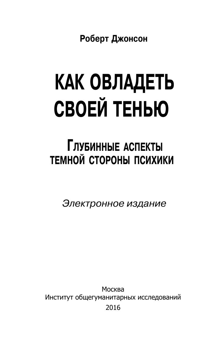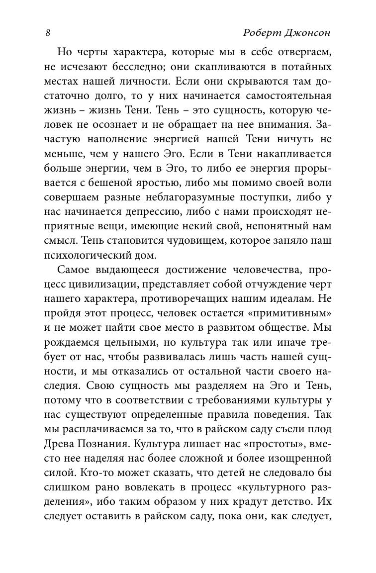 В этой книге Р.Джонсон показывает, что нам необходимо «овладеть» своей тенью — скрытой, темной стороной психики. Следуя за автором, мы видим, как возникает тень; как она взаимодействует с другими частями личности и с внешним миром; видим, что она вбирает в себя. Джонсон утверждает: если мы не примем свою тень, если не начнем уважать ее, — то не сможем достичь целостности. Ведь скрытые, подавленные части психики никуда не исчезают и могут внезапно (и часто болезненно) проявиться.