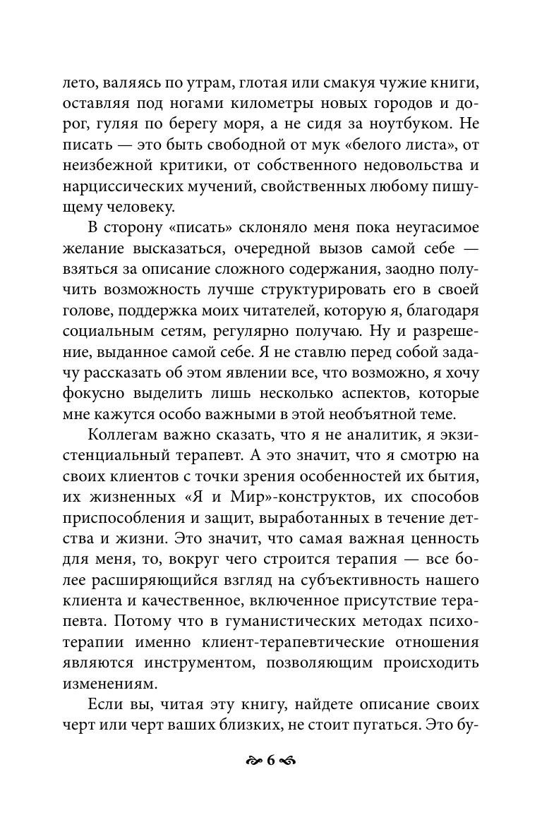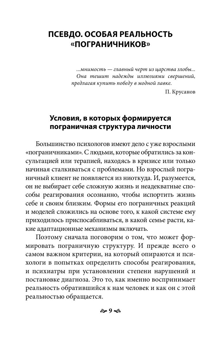 Первая часть книги посвящена феноменологии: анализу условий, в которых формируются такие особенности психики, способов обхождения «пограничника» с собой, с окружающими, с миром. Во второй части описаны особенности психотерапевтической помощи таким клиентам.