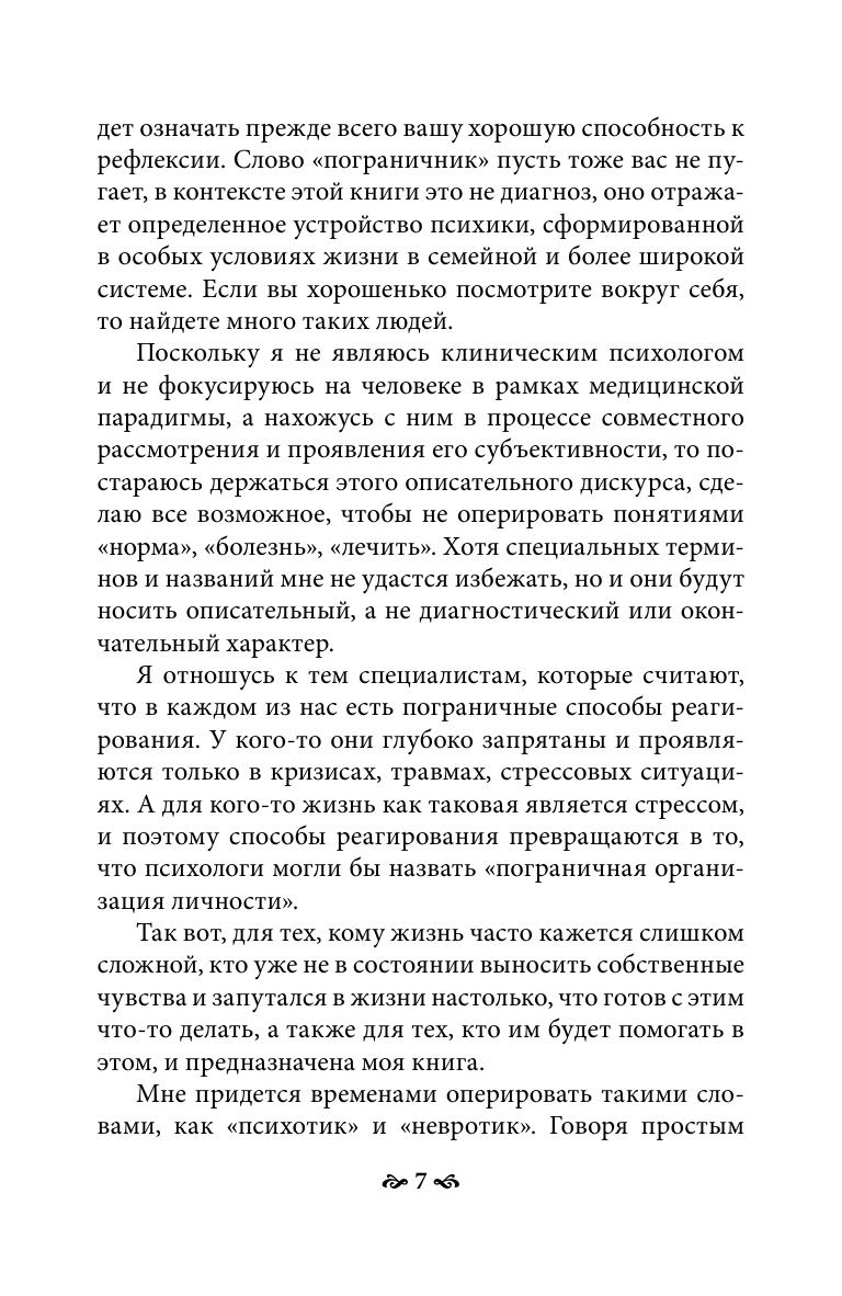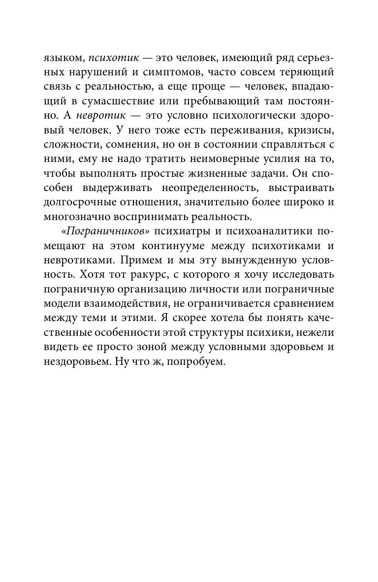 По мнению автора, у каждого из нас есть пограничные способы реагирования, но у кого-то они глубоко запрятаны, а для кого-то стрессом является жизнь как таковая, и потому эти способы превращаются в «пограничную организацию личности». Психиатры и психоаналитики помещают «пограничников» между невротиками (условно психически здоровыми людьми) и психотиками (психически нездоровыми). Задача автора — понять качественные особенности структуры психики таких людей.