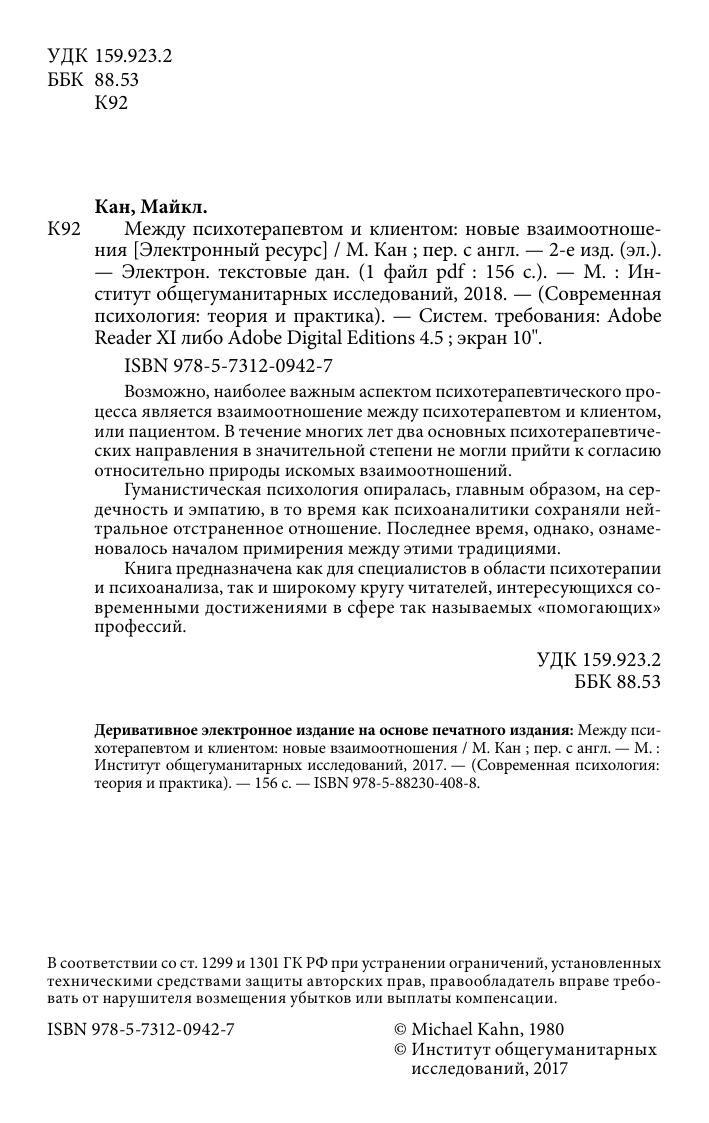 Книга предназначена как для специалистов в области психотерапии и психоанализа, так и широкому кругу читателей, интересующихся современными достижениями в сфере так называемых "помогающих" профессий.