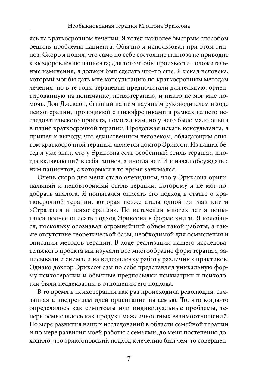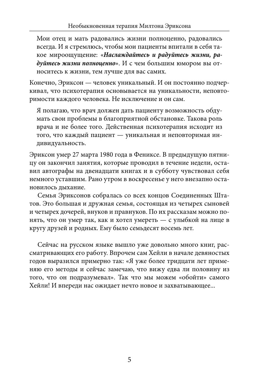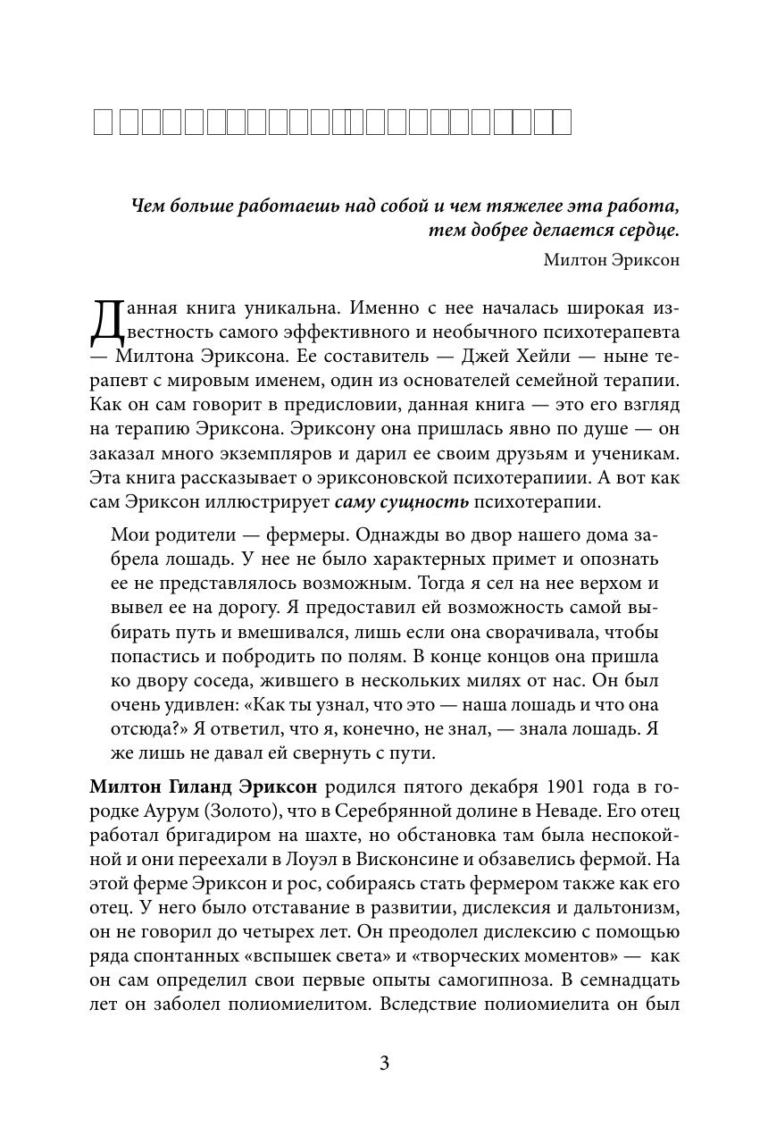 «Золотой Ключик». Может быть, так надо было назвать эту книгу? Ведь она открывает волшебную дверцу в мир сокрытых человеческих возможностей. И просто и доступно показывает и объясняет закономерности нашей жизни. Но автор назвал ее Необыкновенной терапией, так как она рассказывает о терапии самого эффективного и необыкновенного психотерапевта и психиатра ХХ-го столетия — Милтона Эриксона. Доброго и гениального целителя и учителя, некоторое представление о величии и мужестве которого можно получить даже из краткой биографии, приведенной в «Предисловии переводчика». Полное же прочтение этой книги приводит к необыкновенному целительному результату. Видимо, поэтому эта книга сразу стала популярной в Америке и Европе.