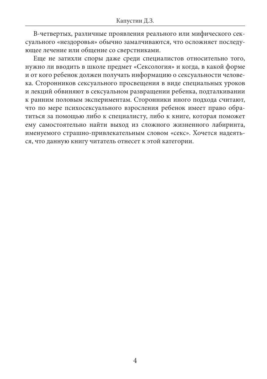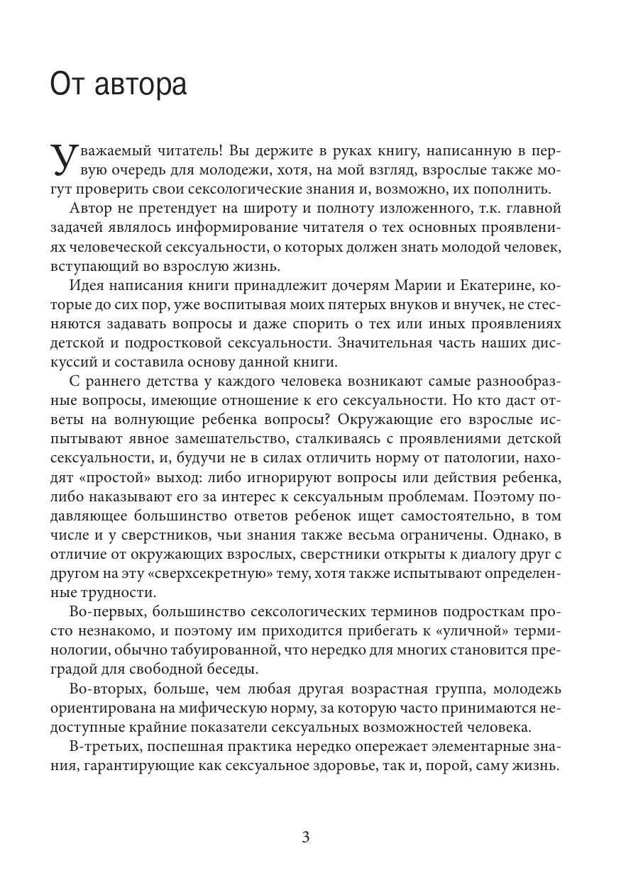 Книга написана специалистом, более 40 лет работающим в такой важной и трудной специальности как сексопатология, имеющего к тому же опыт издания 10 научно-популярных произведений на тему интимных взаимоотношений. Она в определенной мере является итогом не только практической деятельности автора как врача, но и как педагога, имеющего многолетний опыт преподавания в учебных заведениях Республики Беларусь. В книге изложены основные проявления человеческой сексуальности в ее нормальных и отклоняющихся вариантах, представлены сексуальные мифы и заблуждения, освещены вопросы детской сексуальности, приведен толковый словарь сексологических терминов. Автор надеется, что книга поможет читателю сориентироваться и в поисках другой информации, столь важной и полезной в жизни каждого человека. Книга предназначена широкому кругу читателей, как профессионалам, оказывающим помощь людям с нарушениями семейно-сексуальных взаимоотношений, так и родителям, испытывающим затруднения в попытках понять свое место в процессе полового воспитания детей.