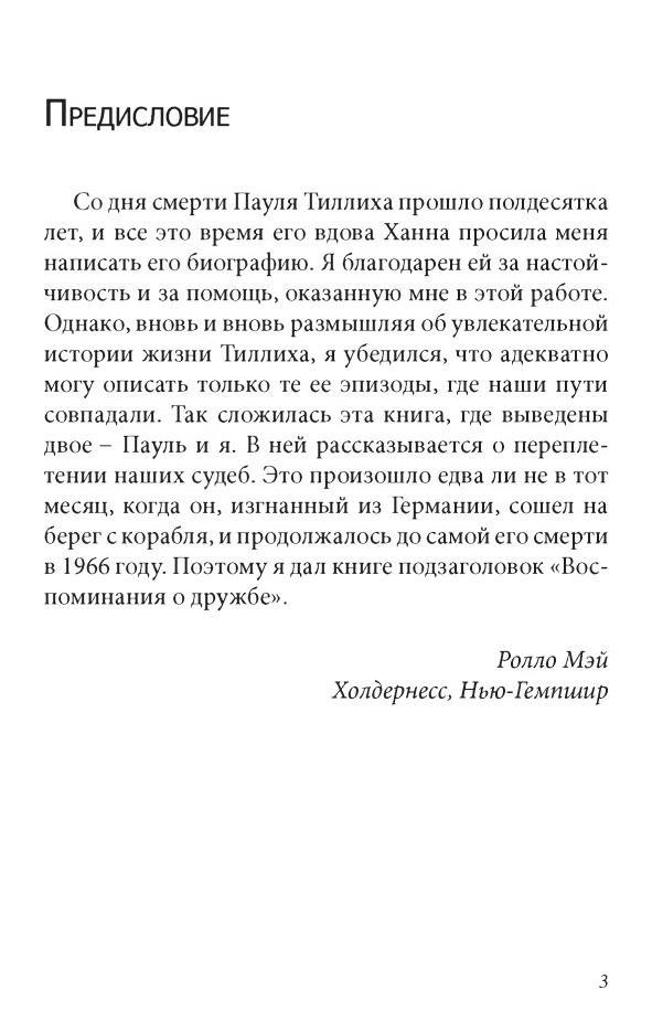 Книга Ролло Мэя (1909–1994), ведущего представителя американской экзистенциальной психологии, посвящена Паулю Йоханнесу Тиллиху (1886–1965), теологу и философу, наставнику и другу автора. Основываясь на многолетнем опыте общения с Тиллихом, материалах, предоставленных его вдовой, а также на его сочинениях и рассуждениях современников, Мэй рисует портрет Тиллиха: останавливается на событиях, определивших его биографию, анализирует важнейшие понятия его учения, рассматривает его личность (в том числе с экзистенциальной точки зрения). Через книгу красной нитью проходит мысль о неразрывной связи философии Тиллиха с жизнью в различных ее проявлениях; примером этому, по мнению автора, стали личность и судьба самого ученого.