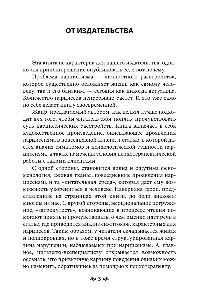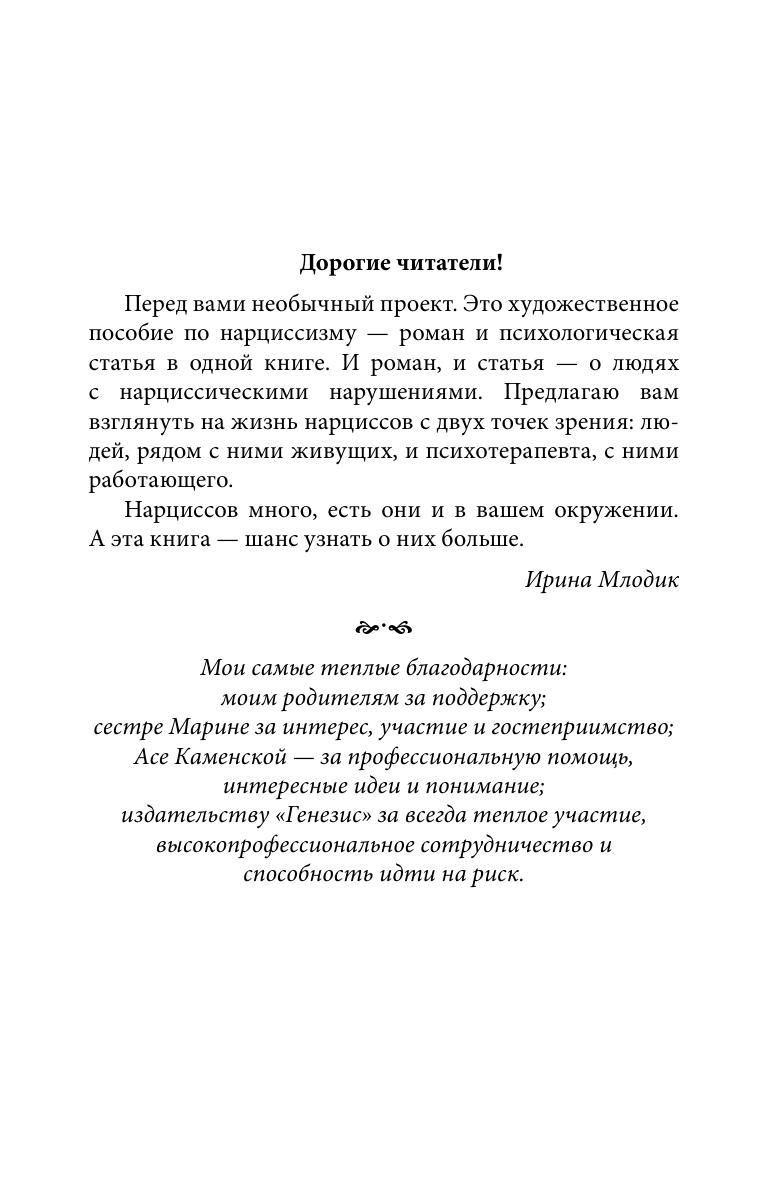 Книга включает в себя роман и психологическую статью. И роман, и статья — о людях с нарциссическими нарушениями. Обычно нарциссом принято называть самовлюбленного, эгоистичного человека — почти все помнят миф о Нарциссе, погибшем от любви к себе. В психологии же речь идет о нарциссическом характере, который лишь отдаленно напоминает бытовое представление.