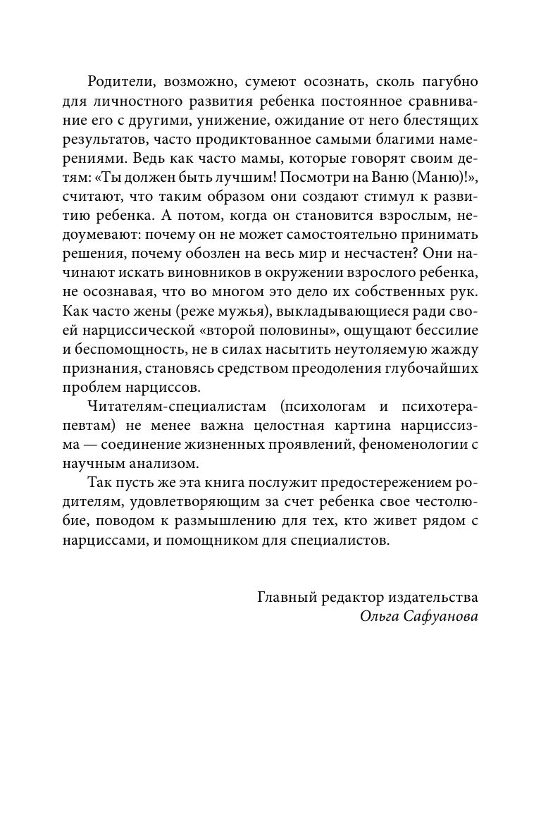 Автор предлагает взглянуть на жизнь нарциссов с двух сторон: с точки зрения людей, рядом с ними живущих, и с точки зрения психотерапевта, с ними работающего.