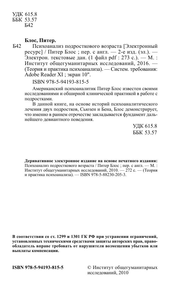 В данной книге, на основе историй психоаналитического лечения двух подростков, Сьюзен и Бена, Блос демонстрирует, что именно в раннем отрочестве закладывается фундамент дальнейшего девиантного поведения.