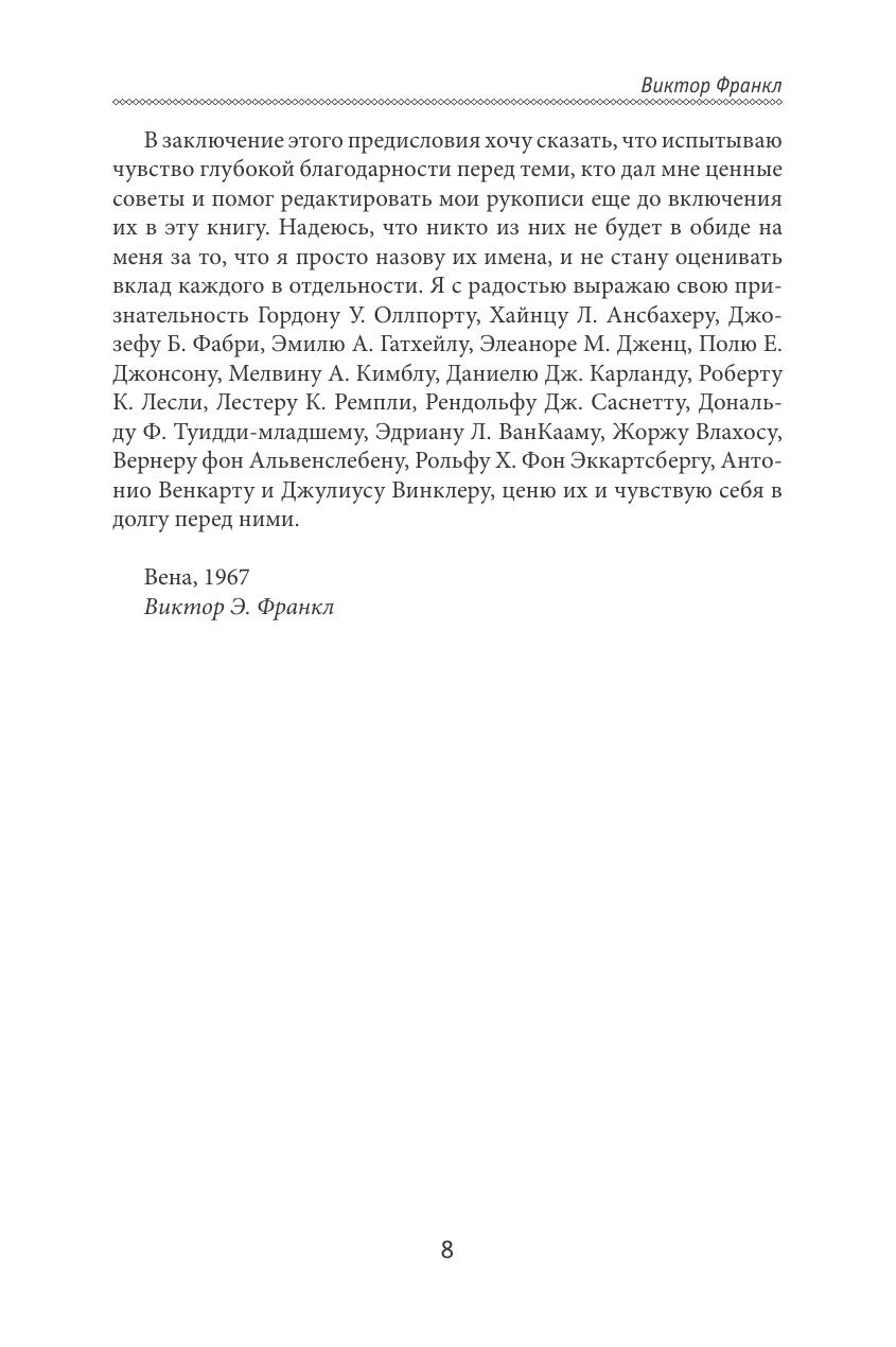Виктор Франкл — выдающийся психолог современности, основатель третьей после фрейдовского психоанализа и индивидуальной психологии Адлера Венской школы психотерапии, жизнеспособность которой была подтверждена личным опытом автора, сумевшего пережить все ужасы концлагерей, сохранив себя как личность. Страшный, трагический опыт Франкла дал толчок развитию терапевтической системы, которая смогла сделать светлее, осмысленнее и ценнее жизнь миллионов людей по всему миру. Один из самых важных выводов, сделанных им на основе опыта, приобретенного в живой лаборатории концентрационных лагерей заключался в том, что ориентация на смысл спасает жизнь. Смысл стал краеугольным камнем разработанной им концепции и его представления о человеке.