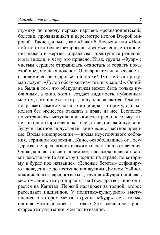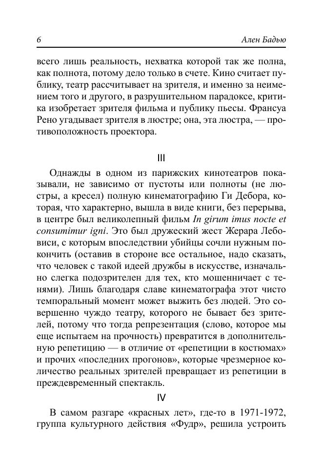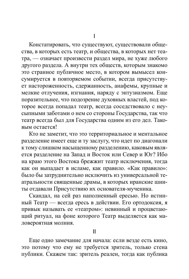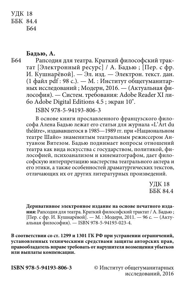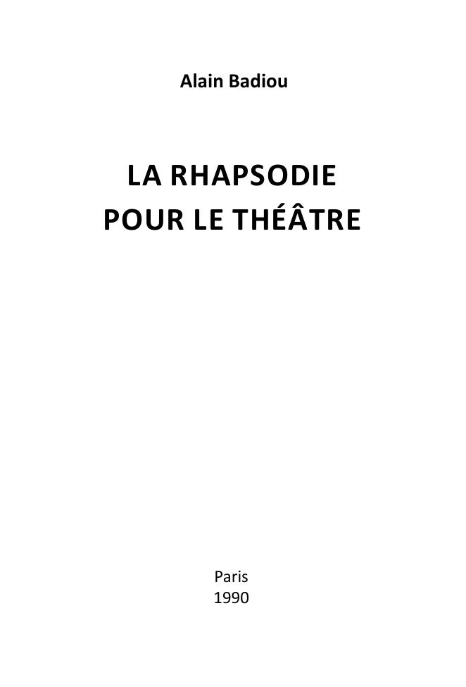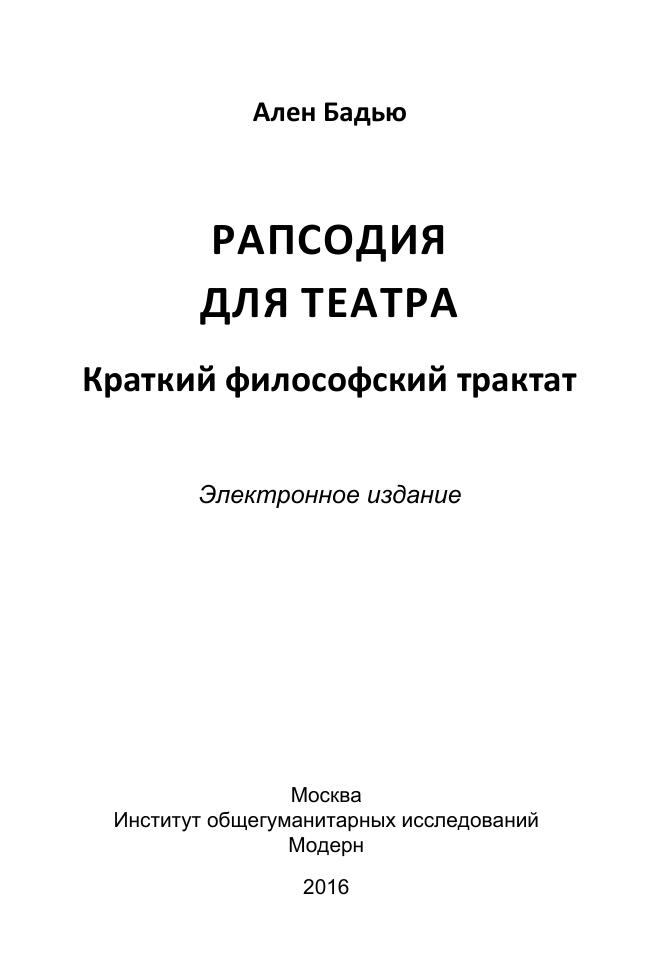 В основе книги прославленного французского философа Алена Бадью лежат его статьи для журнала «L’Art du théâtre», издававшегося в 1985-1989 гг. при «Национальном театре Шайо» знаменитым театральным режиссером Антуаном Витезом. Бадью поднимает вопросы отношений театра как вида искусства с государством, политикой, философией, психоанализом и кинематографом, дает философскую интерпретацию мастерства театрального актера и его этики, а также особенностей драматургических текстов, отличающих их от других литературных произведений.