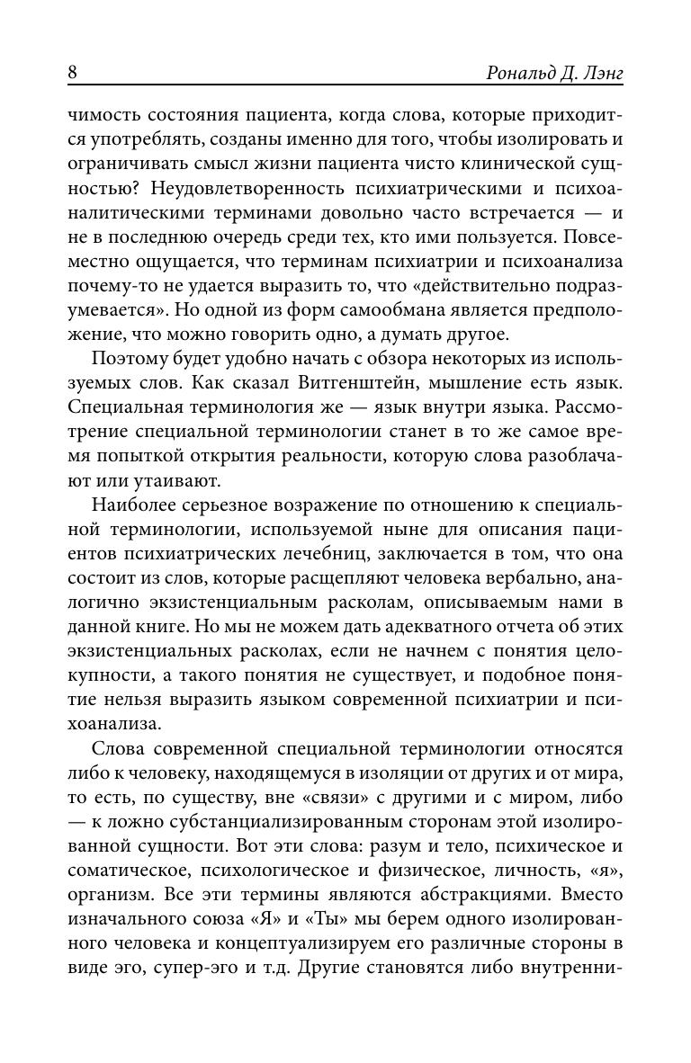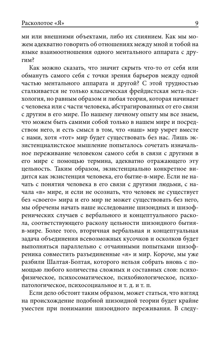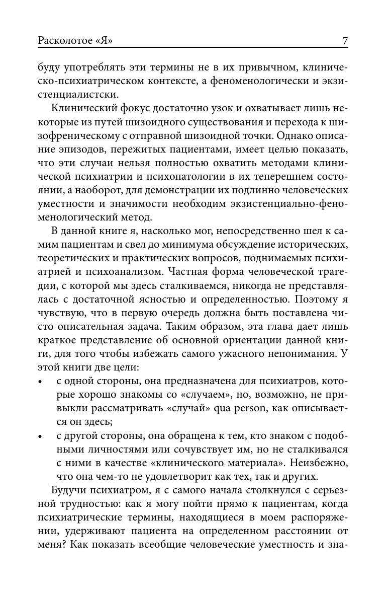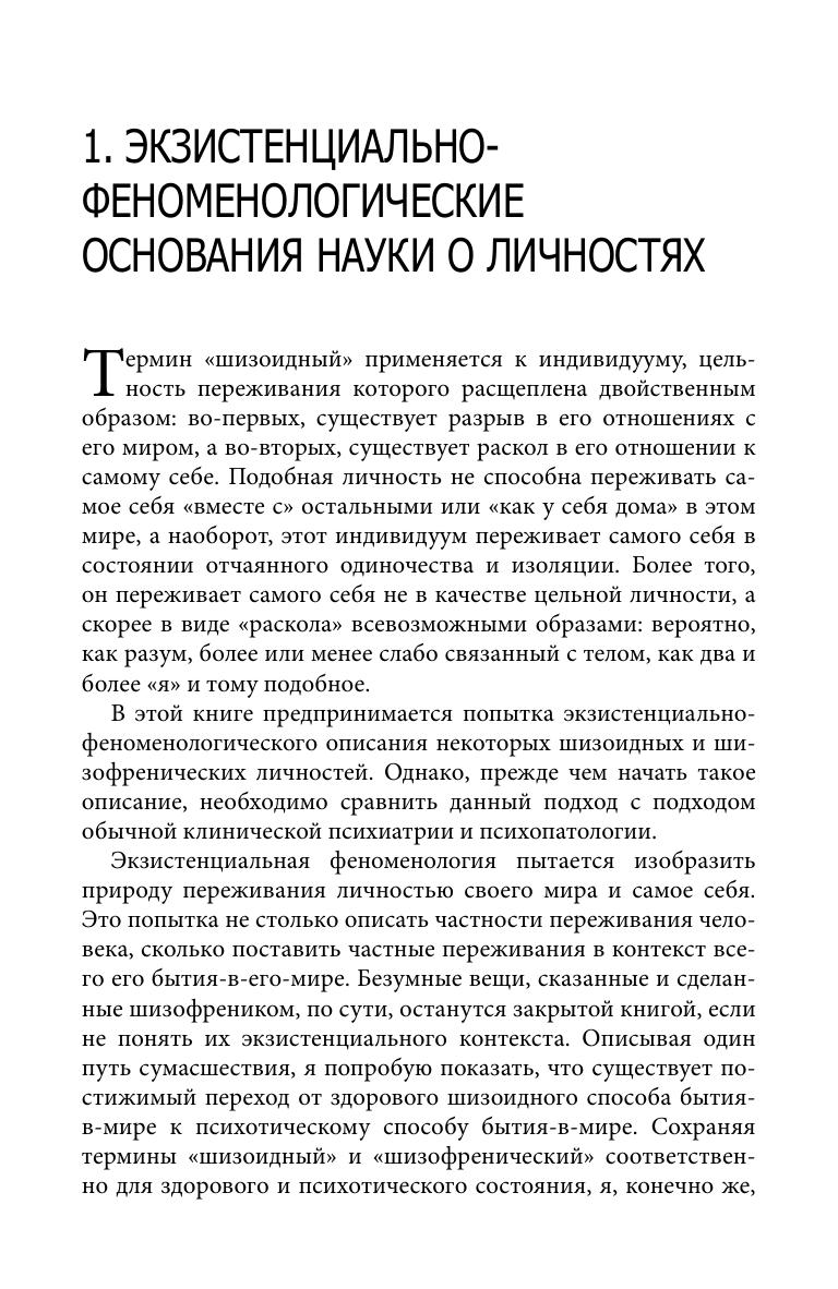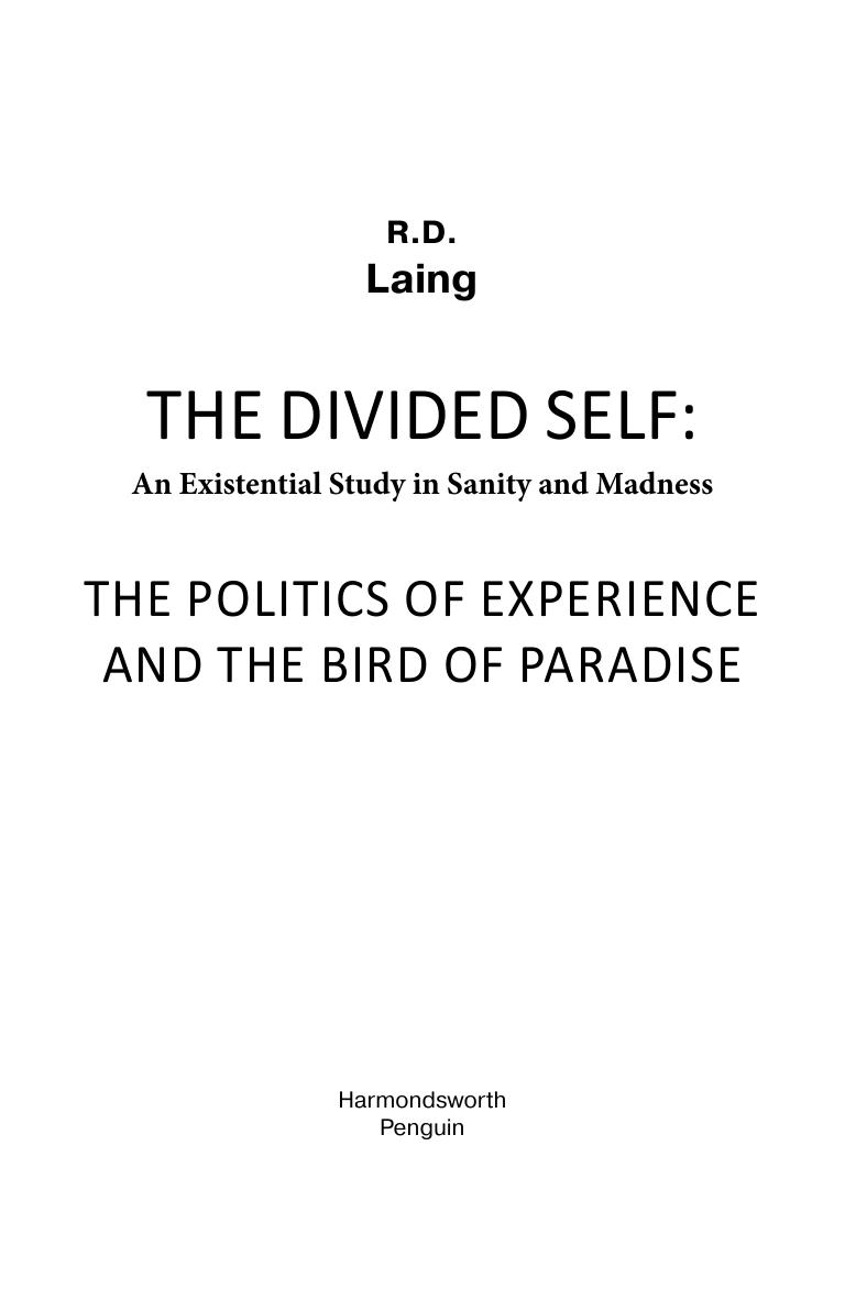 В «Расколотом "Я"» он делает попытку не просто изложить свои взгляды на психиатрию, но дать читателю почувствовать внутренний мир шизофреника, парадоксальный и логичный одновременно.