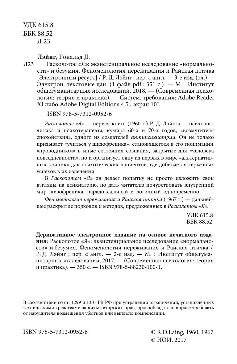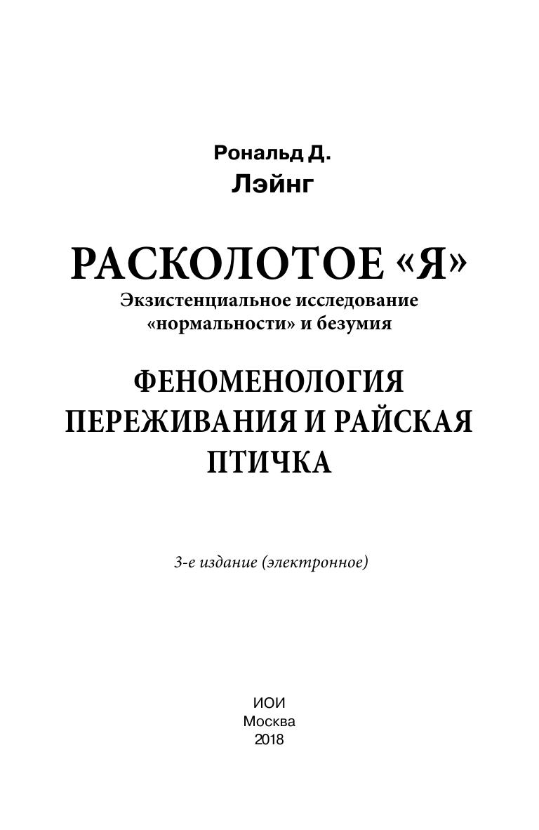 «Расколотое "Я"» — первая книга (1960 г.) Р. Д. Лэйнга — психоаналитика и психотерапевта, кумира 60-х и 70-х годов, «возмутителя спокойствия», одного из создателей антипсихиатрии. Он не только призывает «учиться у шизофреника», становящегося в его понимании «проводником» в иные состояния сознания, закрытые для «человека повседневности», но и организует одну из первых в мире «альтернативных клиник» для психотических пациентов, где добивается серьезных успехов в их излечении.
