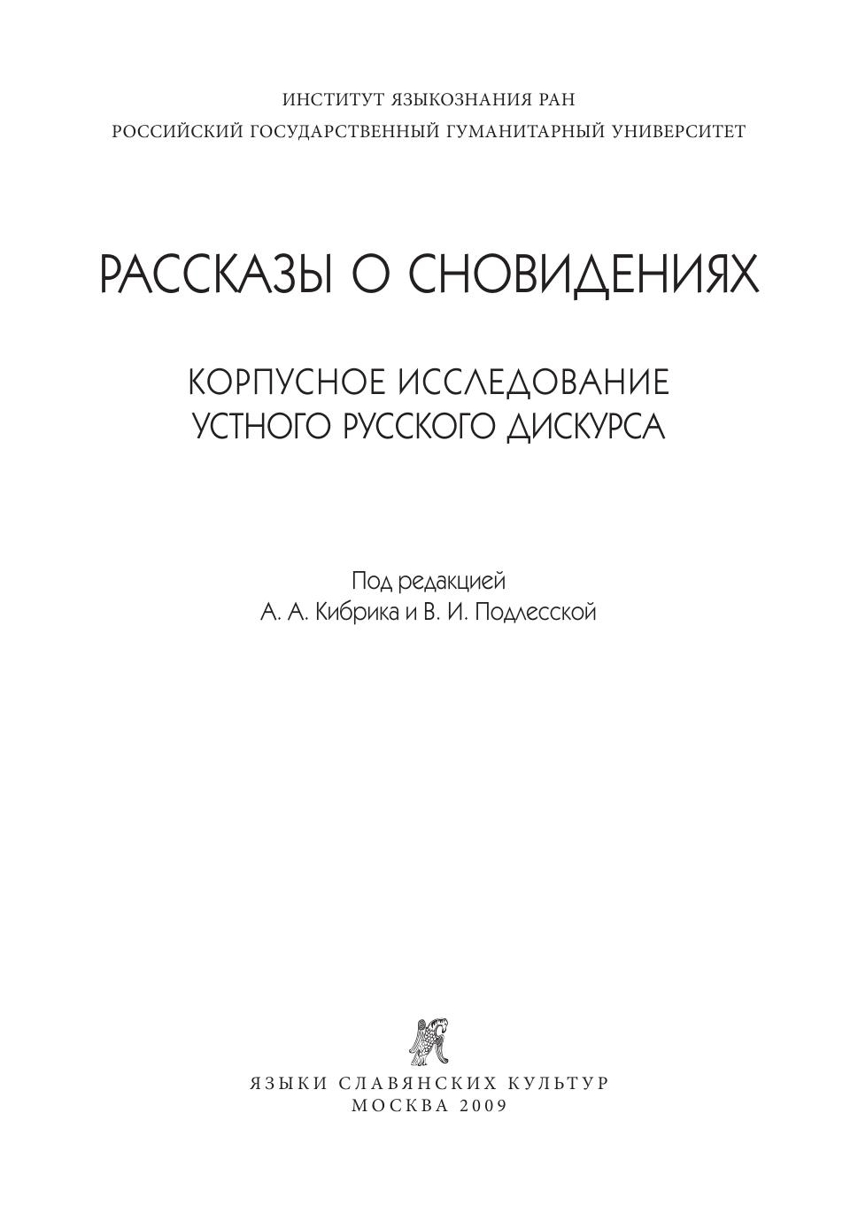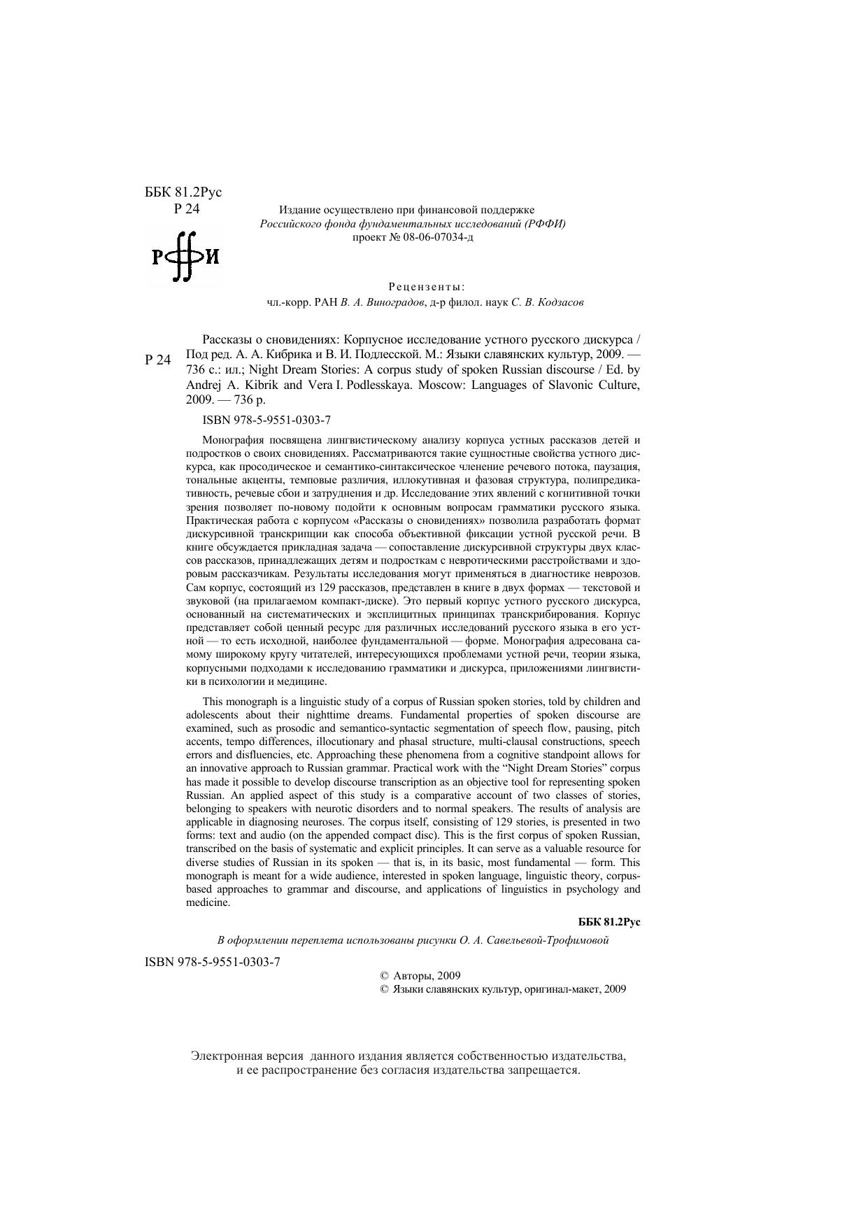 Монография посвящена лингвистическому анализу корпуса устных рассказов детей и подростков о своих сновидениях. Рассматриваются такие сущностные свойства устного дискурса, как просодическое и семантико-синтаксическое членение речевого потока, паузация, тональные акценты, темповые различия, иллокутивная и фазовая структура, полипредикативность, речевые сбои и затруднения и др. Исследование этих явлений с когнитивной точки зрения позволяет по-новому подойти к основным вопросам грамматики русского языка. Практическая работа с корпусом «Рассказы о сновидениях» позволила разработать формат дискурсивной транскрипции как способа объективной фиксации устной русской речи. В книге обсуждается прикладная задача – сопоставление дискурсивной структуры двух классов рассказов, принадлежащих детям и подросткам с невротическими расстройствами и здоровым рассказчикам. Результаты исследования могут применяться в диагностике неврозов. Это первый корпус устного русского дискурса, основанный на систематических и эксплицитных принципах транскрибирования. Корпус представляет собой ценный ресурс для различных исследований русского языка в его устной – то есть исходной, наиболее фундаментальной – форме. Монография адресована самому широкому кругу читателей, интересующихся проблемами устной речи, теории языка, корпусными подходами к исследованию грамматики и дискурса, приложениями лингвистики в психологии и медицине.