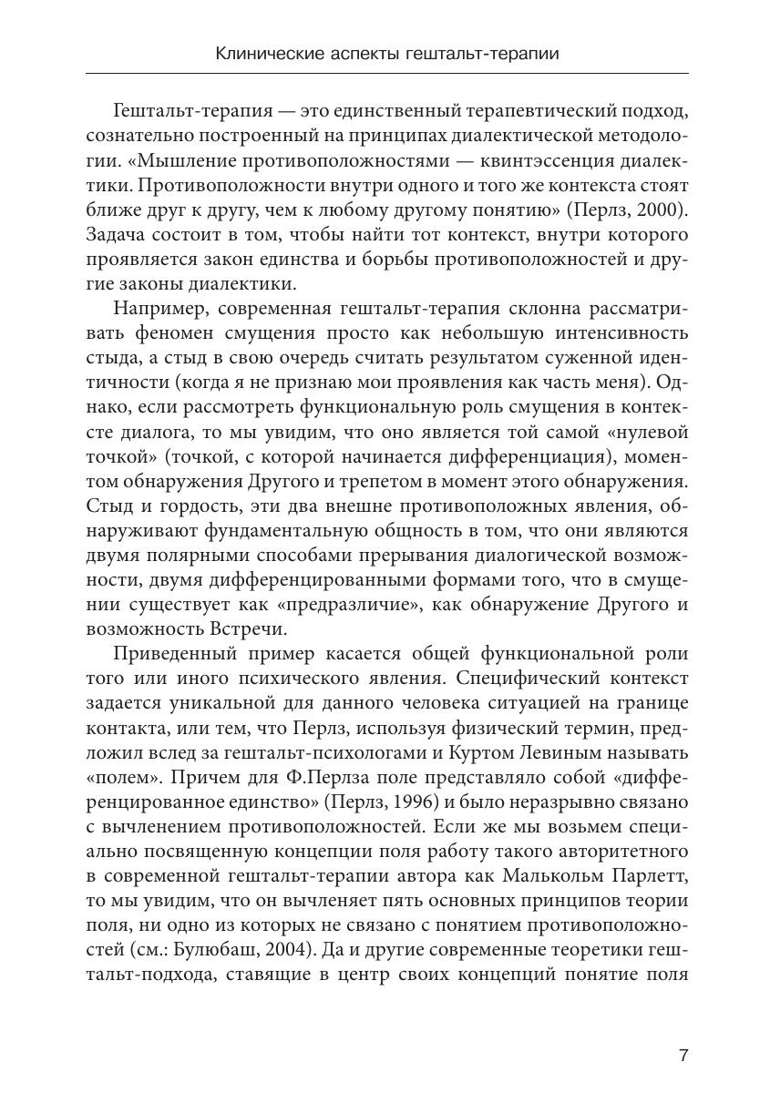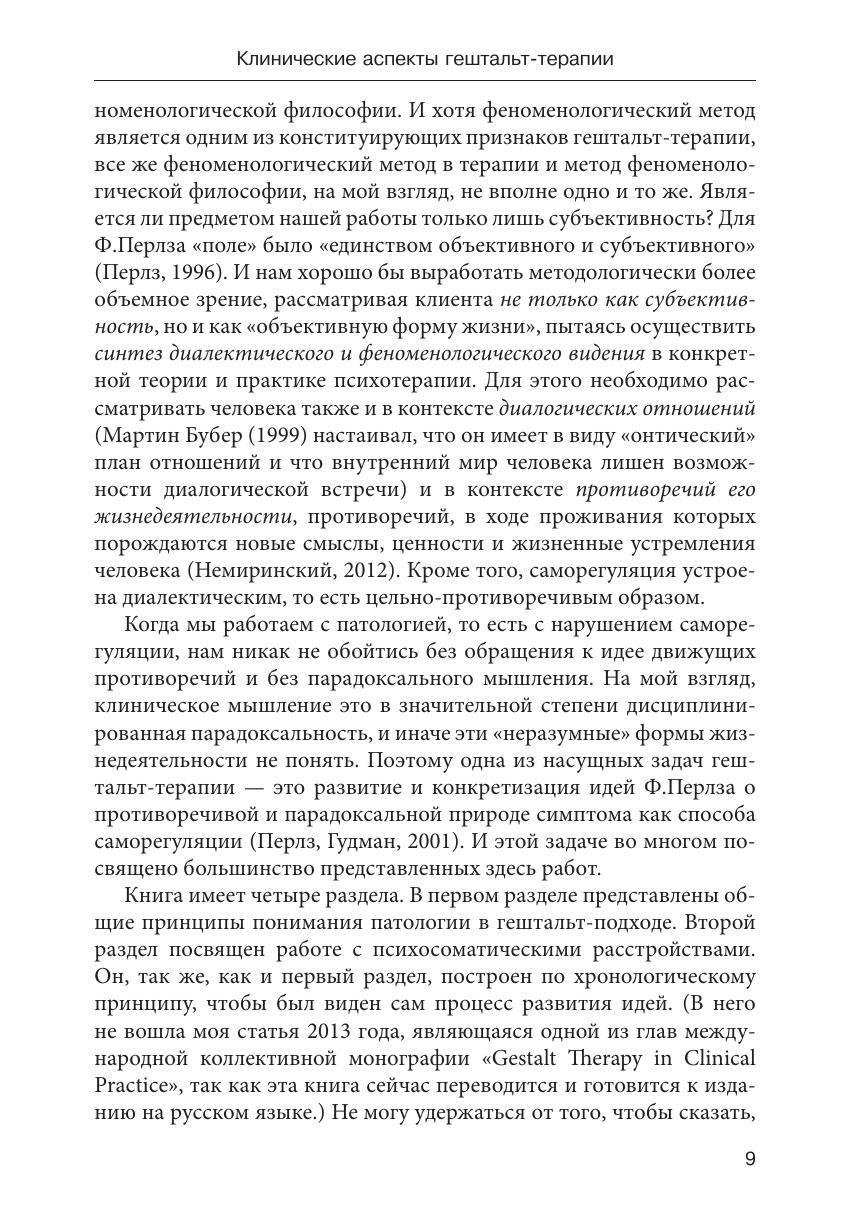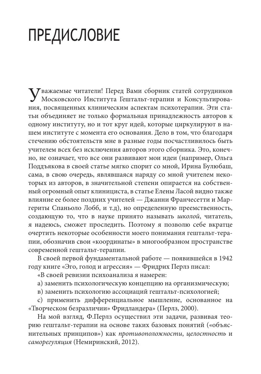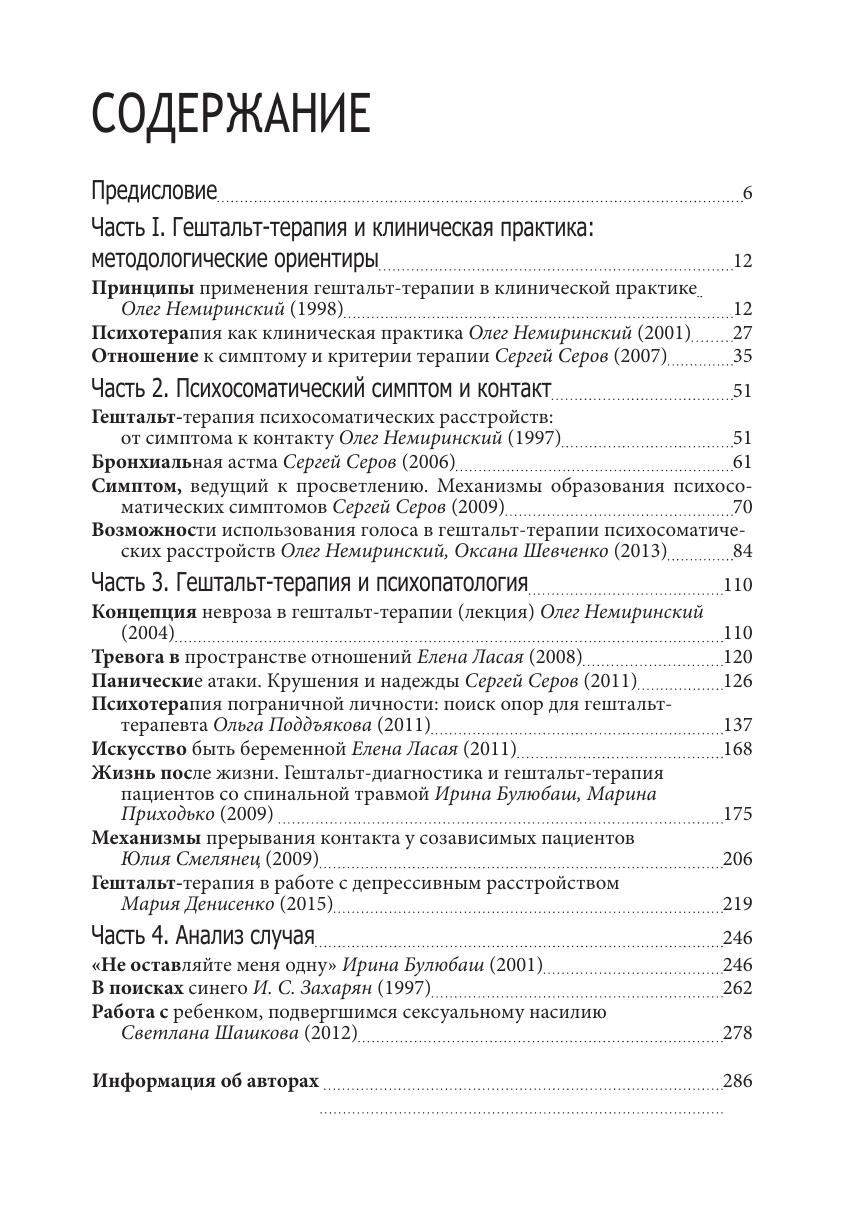 Данная книга является сборником статей сотрудников Московского института гештальт-терапии и консультирования с 1997 по 2015 год, посвященных клиническим аспектам гештальт-терапии. В статьях основателя и руководителя института О.В.Немиринского и его учеников, многие из которых уже давно являются известными в широком русскоязычном пространстве психотерапевтами и гештальт-тренерами, затрагиваются проблемы психотерапии неврозов, психосоматических расстройств, депрессий, тревожных состояний и другие важные для этой области вопросы, а также приводятся увлекательные анализы случаев. В сборнике отражаются достижения современной гештальт-терапии и, одновременно, выражается во многом оригинальный взгляд на теорию и практику психотерапевтической работы.