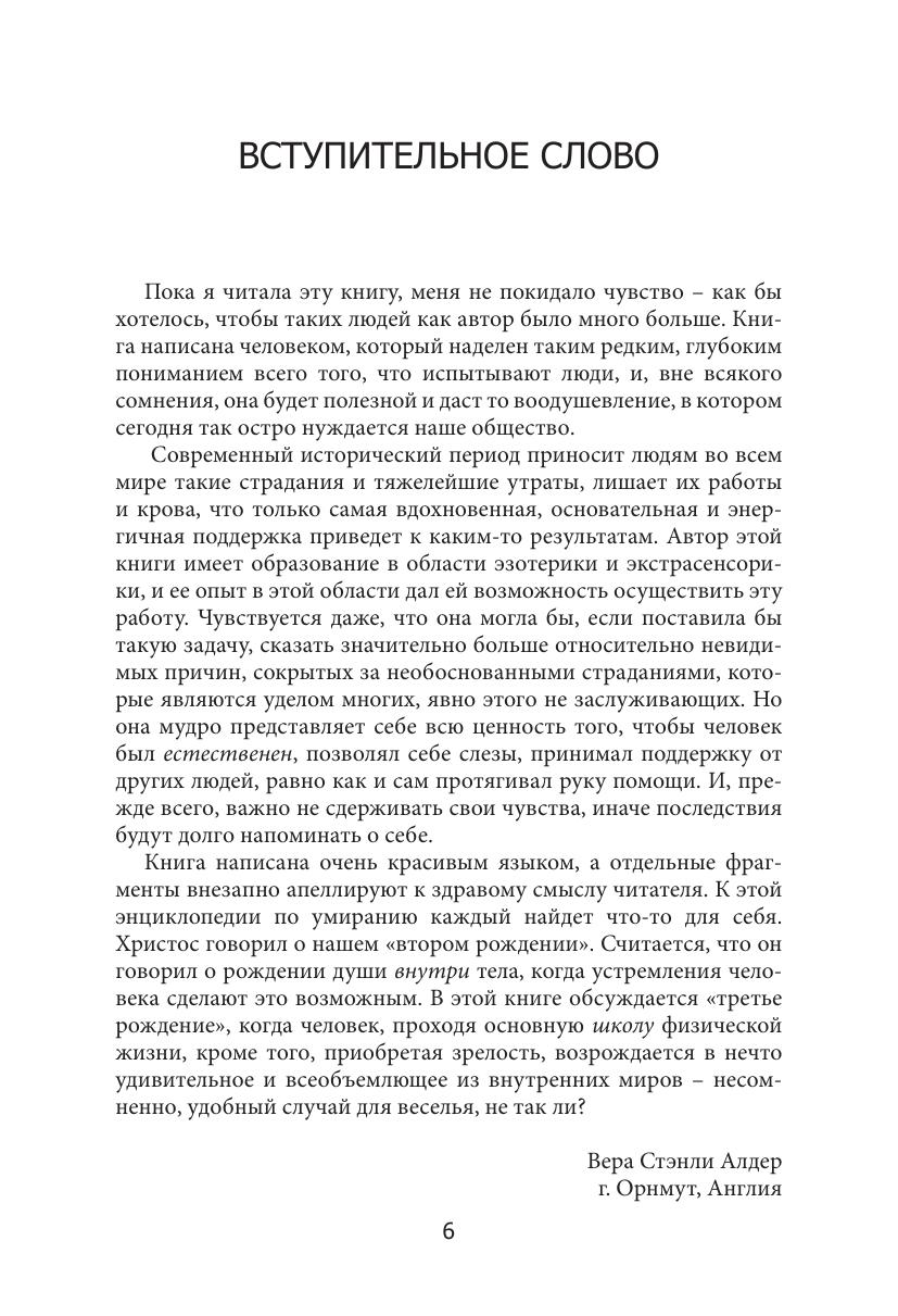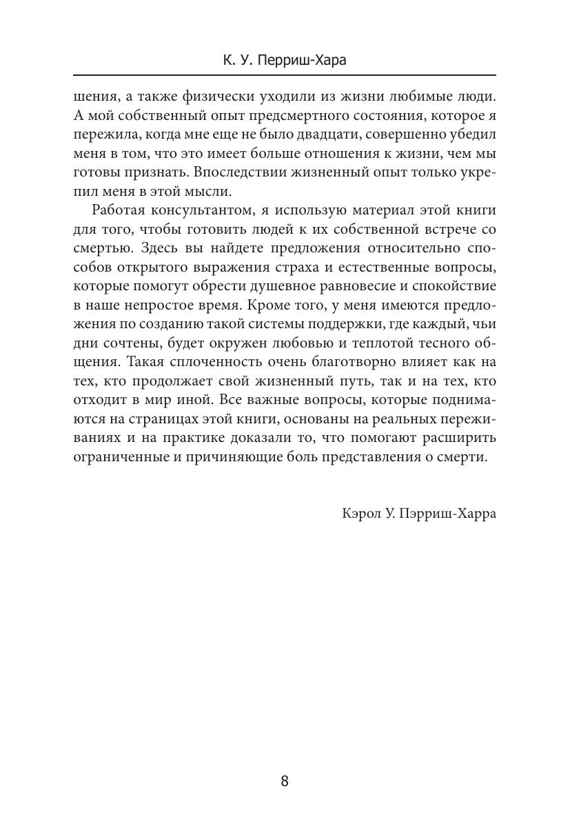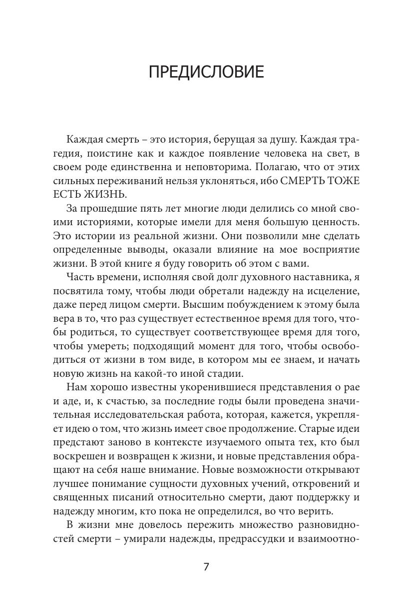 Автору удалось создать точное и полное оптимизма практическое руководство по непростому искусству умирания. Автор почерпнула многое из медицинских источников, а также привнесла 4 необычных момента: свой собственный опыт переживания клинической смерти, своё восприятие как экстрасенса, смерть собственных детей и свои воззрения как уважаемого духовного учителя.