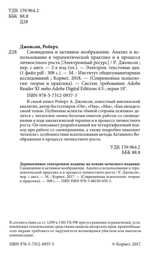 В своей книге Роберт А.Джонсон, известный юнгианский аналитик, автор бестселлеров «Он», «Она», «Мы», «Как овладеть своей тенью. Глубинные аспекты тёмной стороны психики» делится с читателем своим богатым опытом работы со сновидениями в ходе аналитической терапии и в процессе личностного роста. Он описывает разработанный им четырёжфазовый подход при работе со сновидениями, а также подробно знакомит читателя с особенностями использования метода Активного Воображения в процессе личностного роста.