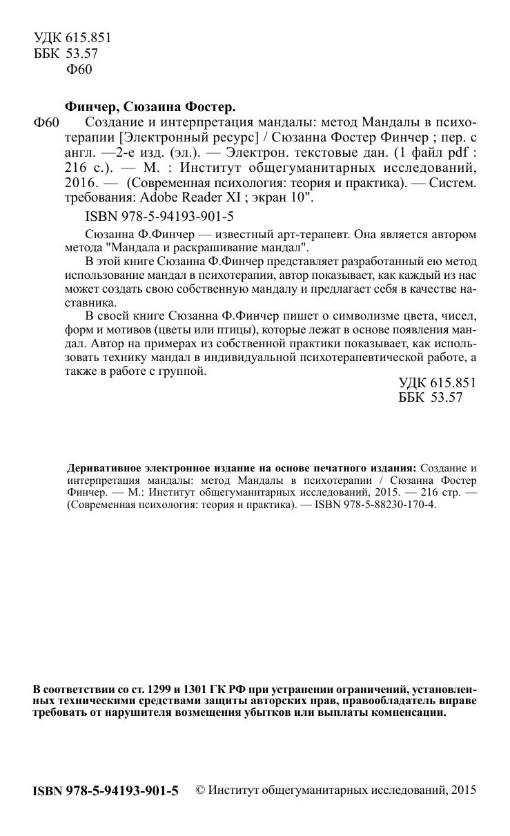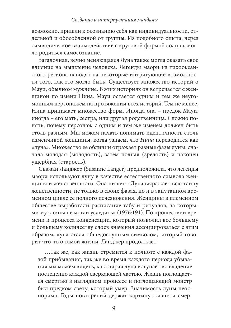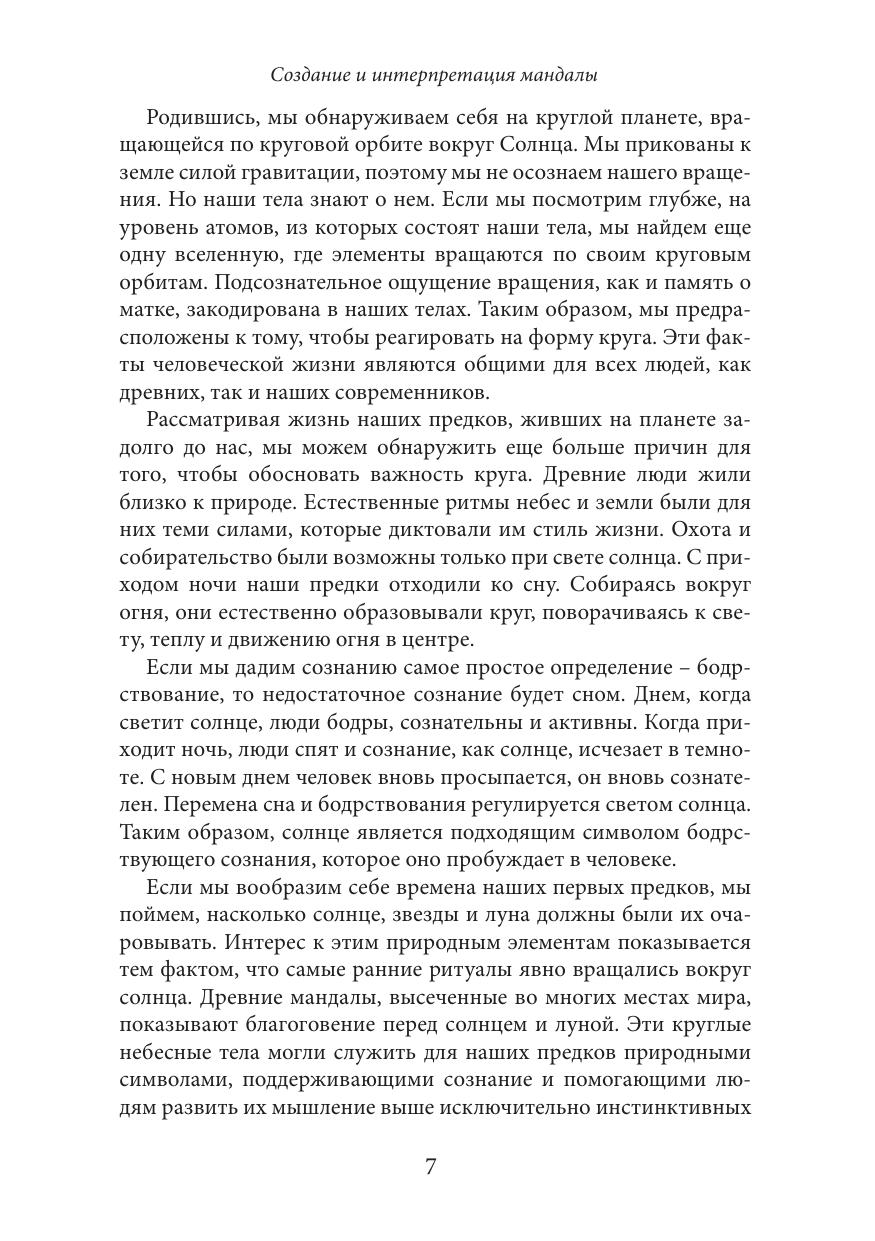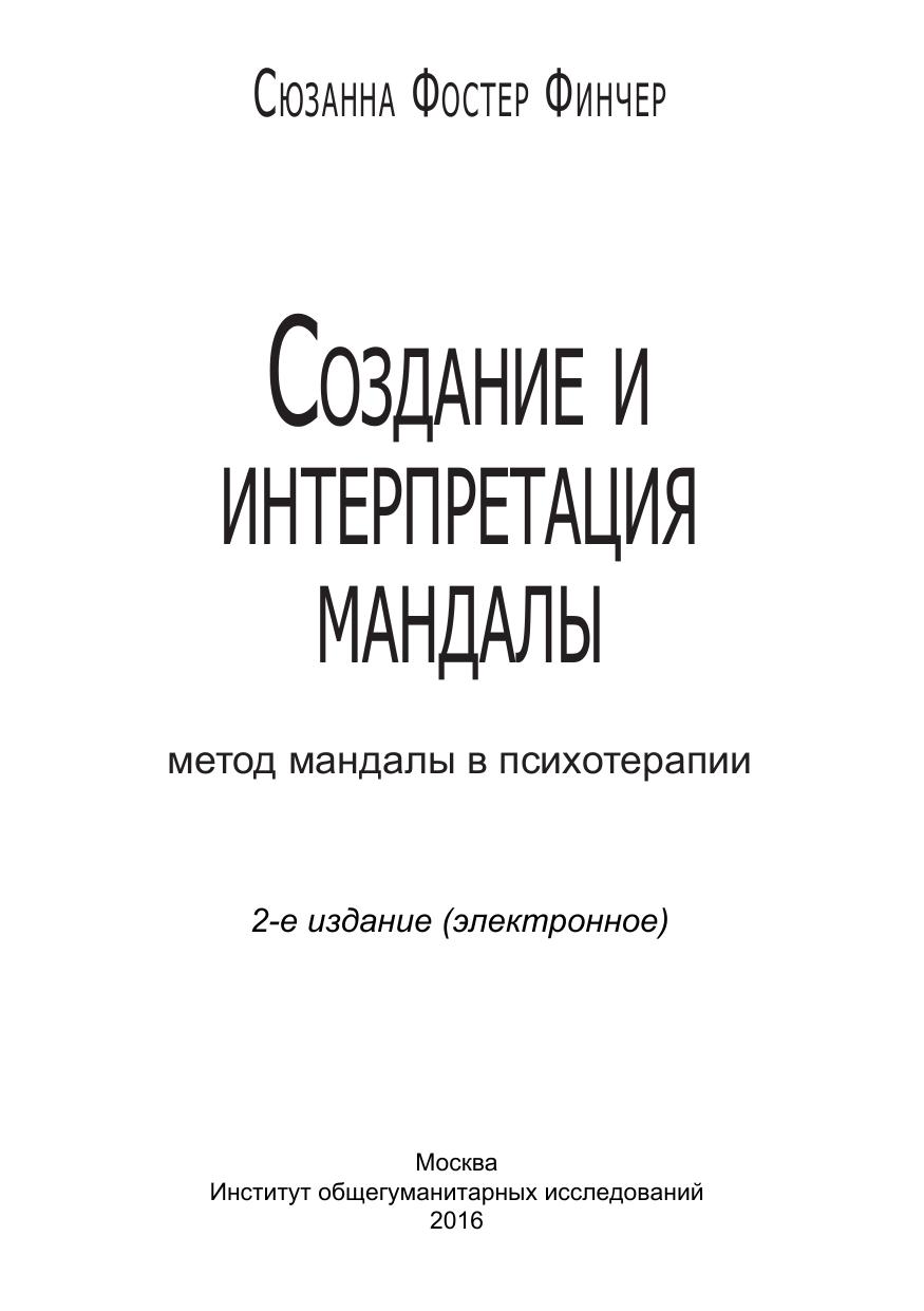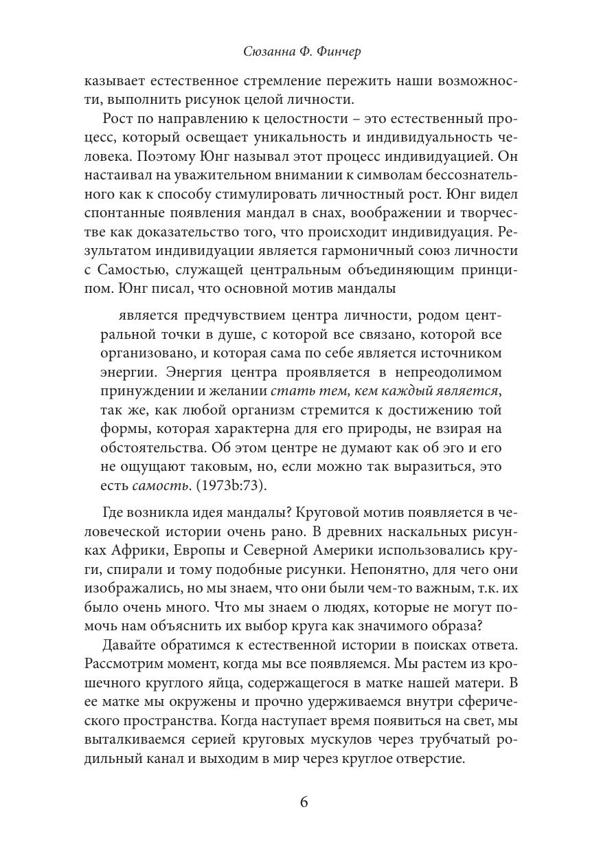 В своей книге Сюзанна Ф.Финчер пишет о символизме цвета, чисел, форм и мотивов (цветы или птицы), которые лежат в основе появления мандал. Автор на примерах из собственной практики показывает, как использовать технику мандал в индивидуальной психотерапевтической работе, а также в работе с группой.