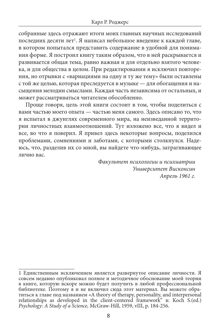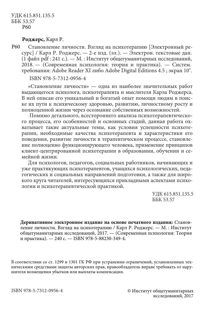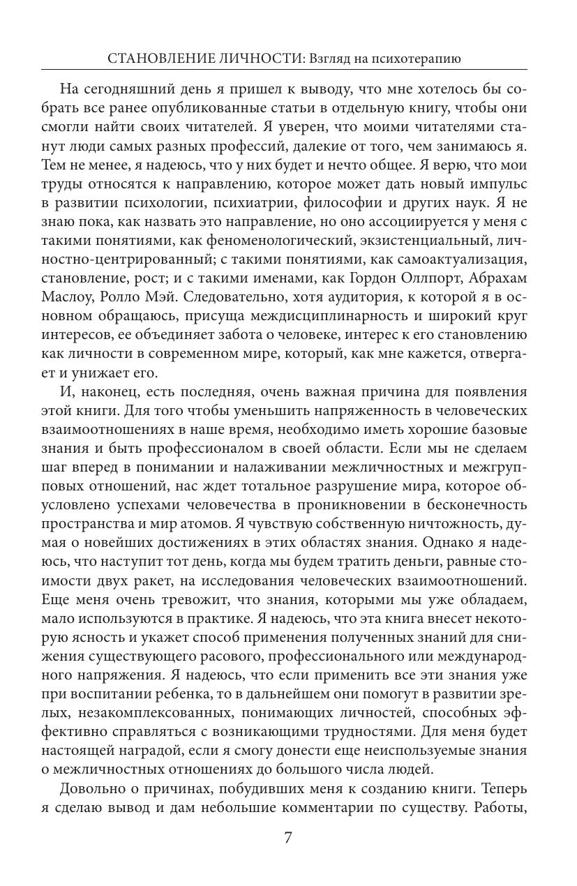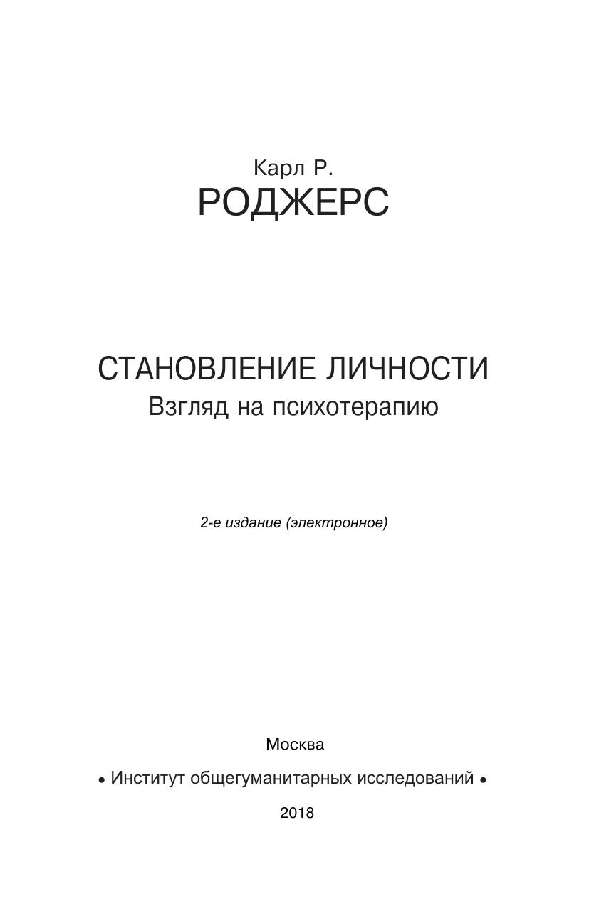 Становление личности — одна из наиболее значительных работ выдающегося психолога, психотерапевта и мыслителя Карла Роджерса. В ней описан его уникальный и богатый опыт помощи людям в поиске их пути к психическому здоровью, развитию, личностному росту и полноценной жизни через осознание собственных возможностей. Помимо детального, всестороннего анализа психотерапевтического процесса, его особенностей и основных стадий, данная работа охватывает такие актуальные темы, как условия успешности психотерапии, необходимые качества психотерапевта и характеристики его поведения, развитие личности в терапевтическом процессе, становление полноценно функционирующего человека, применение принципов клиент-центрированной психотерапии в образовании, обучении и семейной жизни.