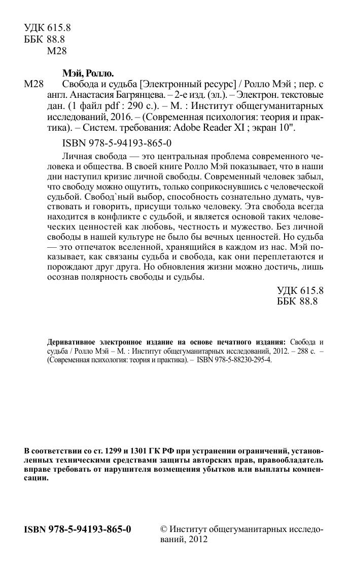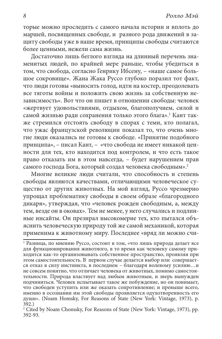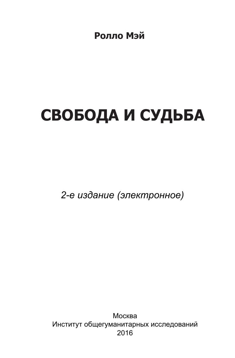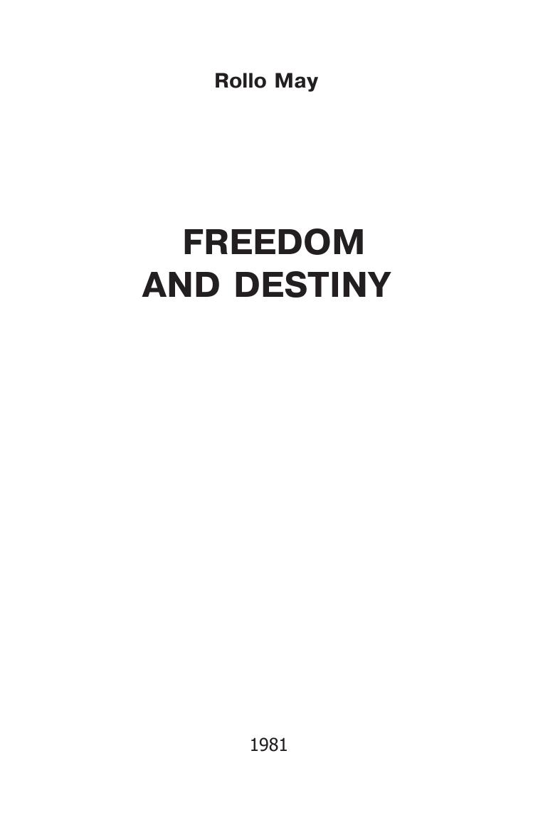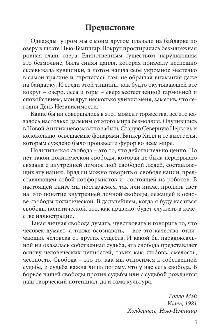 Личная свобода — это центральная проблема современного человека и общества. В своей книге Ролло Мэй показывает, что в наши дни наступил кризис личной свободы. Современный человек забыл, что свободу можно ощутить, только соприкоснувшись с человеческой судьбой. Свободный выбор, способность сознательно думать, чувствовать и говорить, присущи только человеку. Эта свобода всегда находится в конфликте с судьбой, и является основой таких человеческих ценностей как любовь, честность и мужество. Без личной свободы в нашей культуре не было бы вечных ценностей. Но судьба — это отпечаток вселенной, хранящийся в каждом из нас. Мэй показывает, как связаны судьба и свобода, как они переплетаются и порождают друг друга. Но обновления жизни можно достичь, лишь осознав полярность свободы и судьбы.