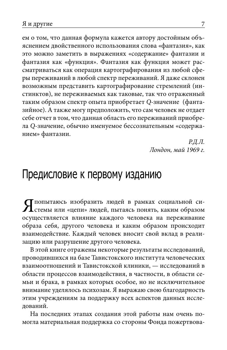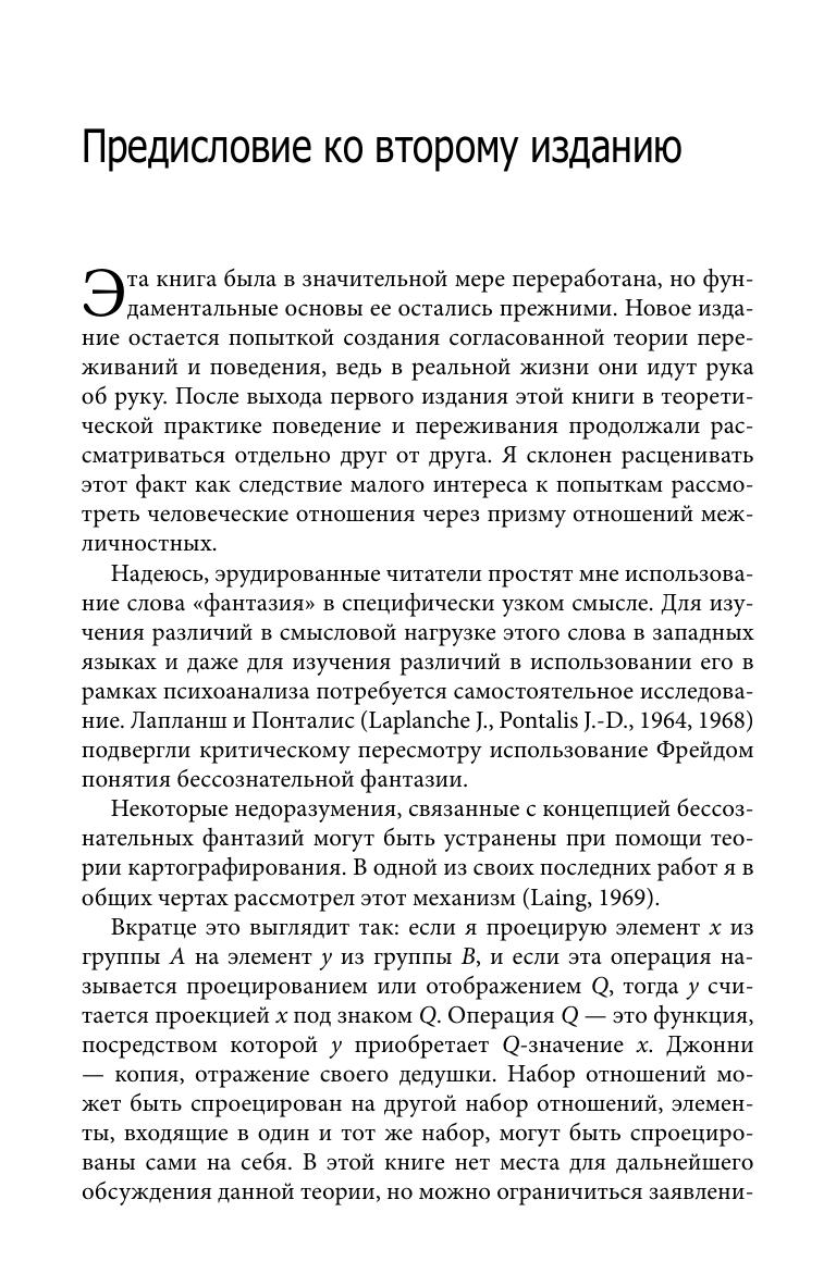 Эта книга принадлежит к числу самых известных трудов Р.Д.Лэйнга — психоаналитика и психотерапевта, кумира 60-х и 70-х годов, «возмутителя спокойствия», одного из создателей «антипсихиатрии». Она посвящена переживаниям взаимоотношений между людьми, месту в этих переживаниях так называемой «системы фантазии», соотношению фантазии и непосредственного опыта, а также тому, как влияет восприятие окружающих людей на самоидентичность человека и как оно может подорвать его доверие к собственным эмоциональным реакциям и собственному восприятию реальности. Интереснейшие рассуждения, тонкий анализ произведений Достоевского и Жана Жене, обращение автора к своему терапевтическому опыту делает книгу удивительным интеллектуальным путешествием. Прежде всего, конечно, для профессионалов в области психологии и психотерапии и студентов соответствующей специализации. Однако немало любопытного и неожиданного найдут здесь и те читатели, которых просто интересует безграничный мир отношений между людьми.