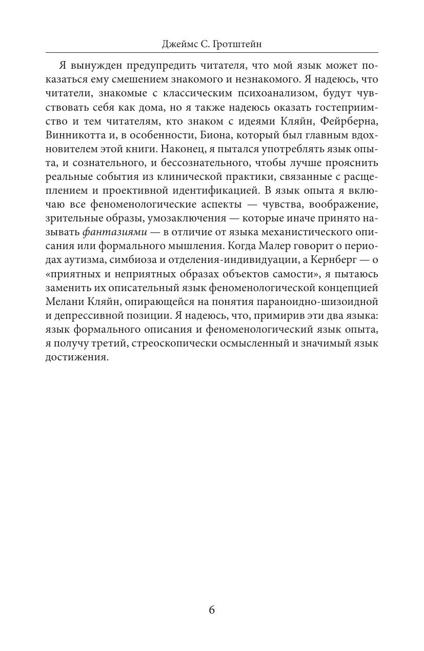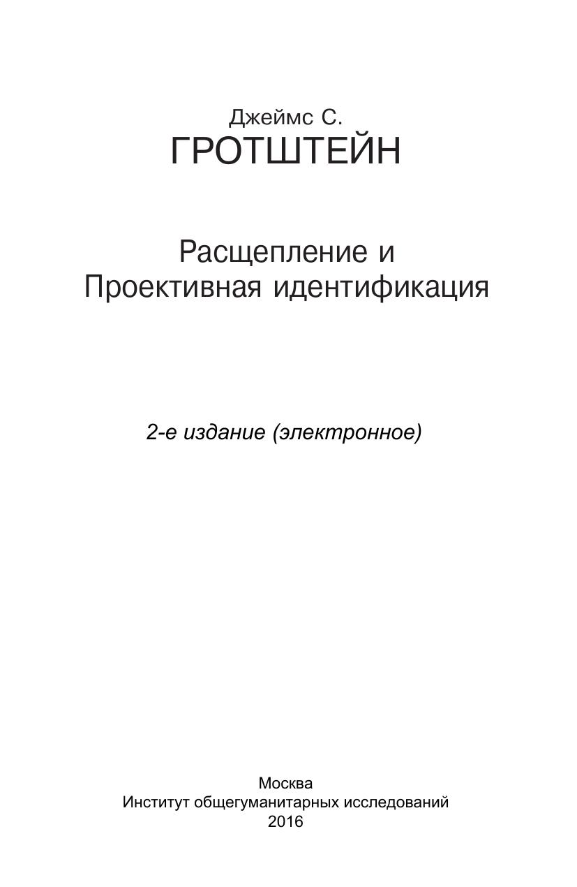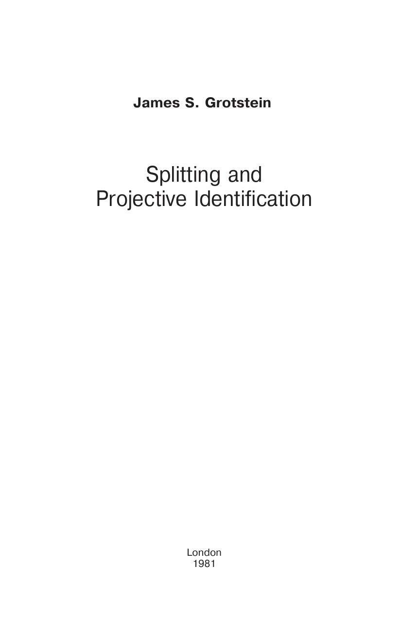 Джеймс Гротштейн пишет удивительно ясно. В своей книге он показывает два основных механизма защиты. Он настаивает, что люди находятся в расщеплении даже больше, чем в принципе осознается, каждая часть личности является самостоятельной и следует собственным планам. Так же как Фейрберн и Гантрип, он утверждает, что расщепление происходит под воздействием невыносимого чувства беспомощности и слабости. Вслед за Кляйн и Бионом, Гротштейн описывает проективную идентификацию как воображаемое расширение себя через присоединение к объекту, означающее преодоление сепарации и беспомощности, а также как базовый способ коммуникации.