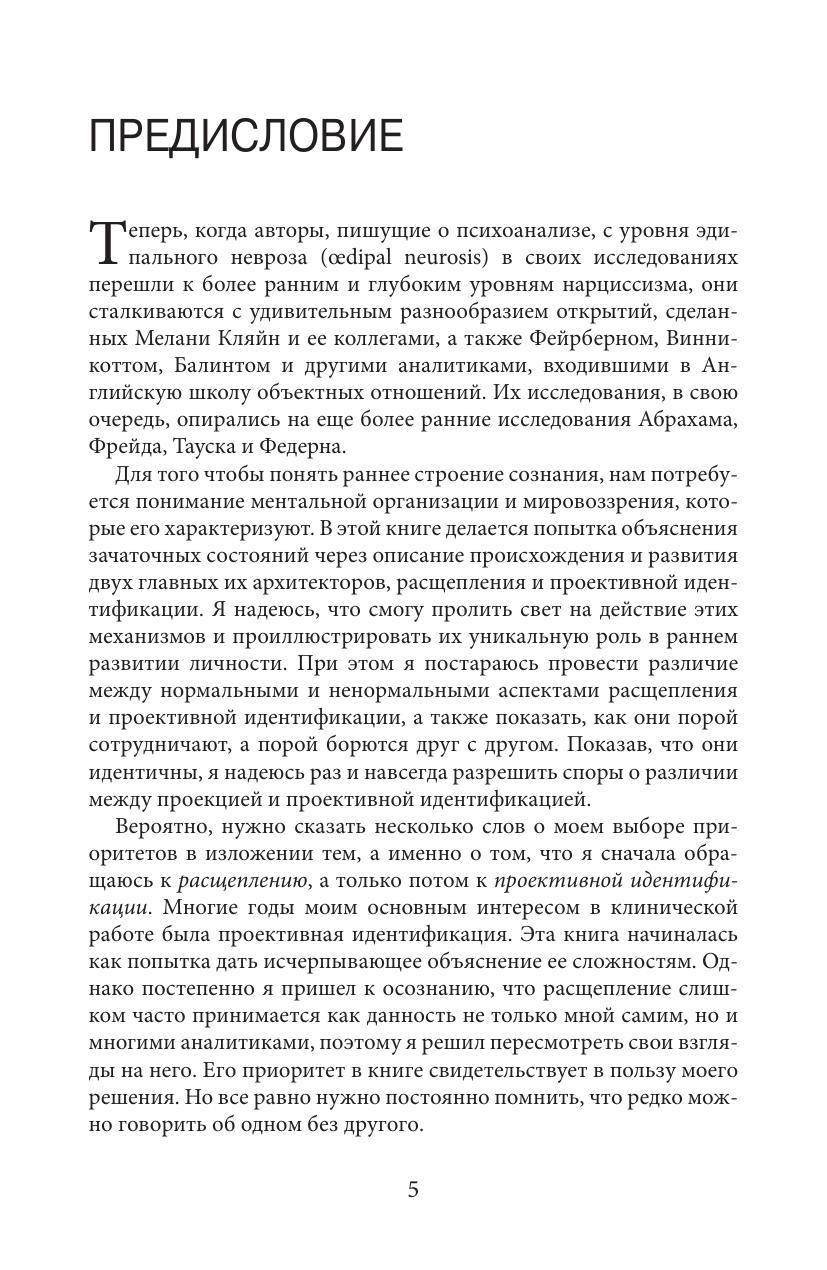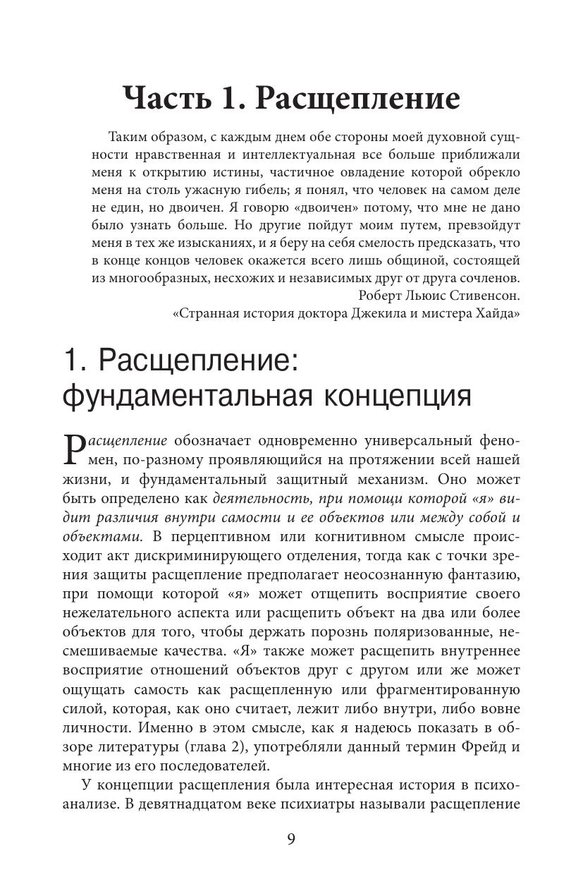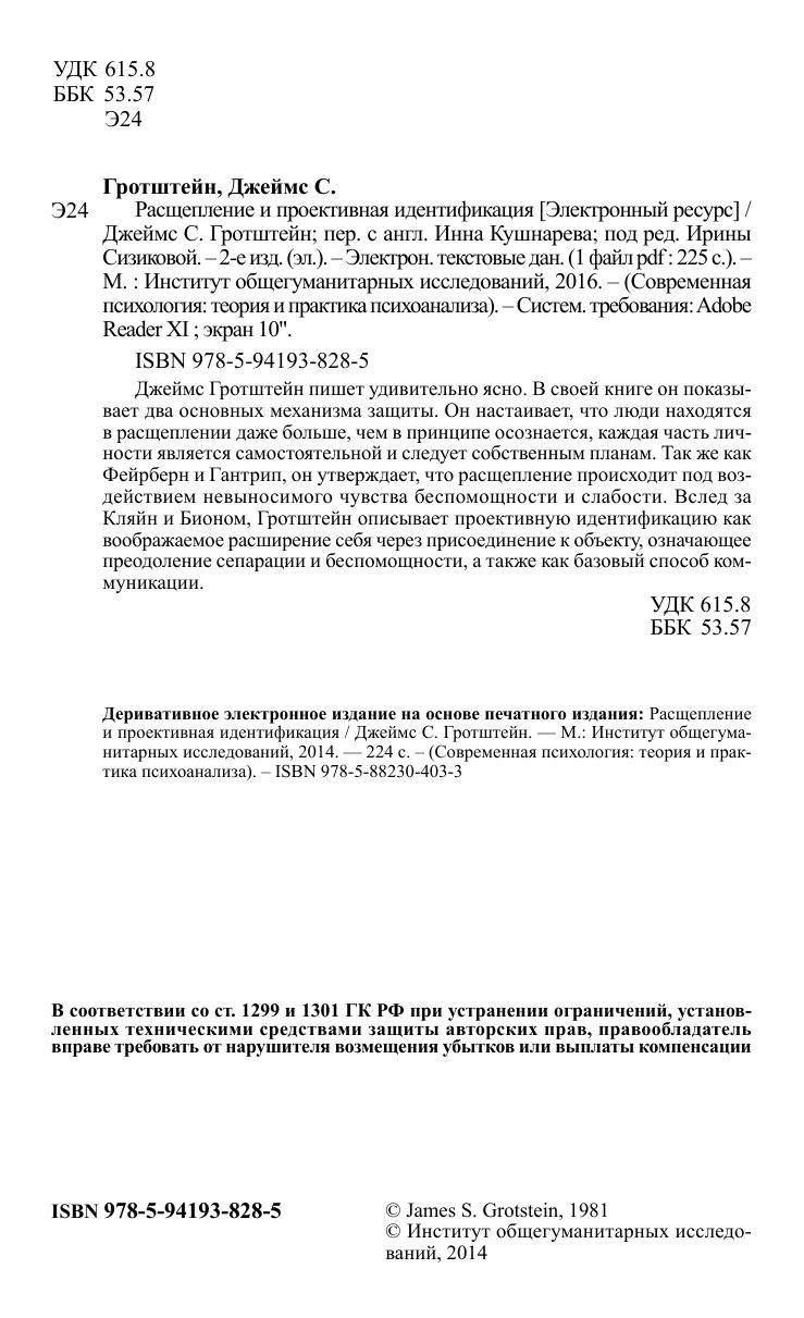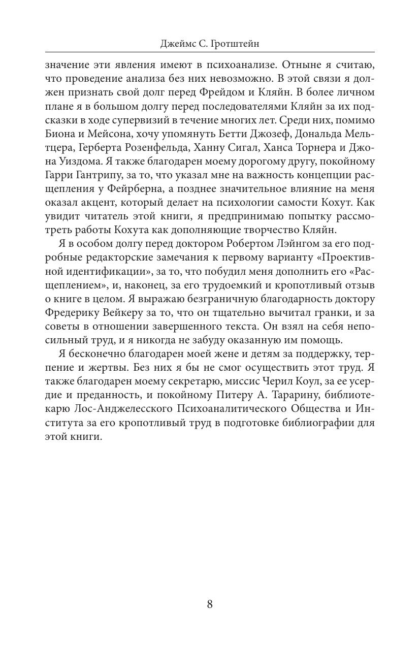 Джеймс Гротштейн пишет удивительно ясно. В своей книге он показывает два основных механизма защиты. Он настаивает, что люди находятся в расщеплении даже больше, чем в принципе осознается, каждая часть личности является самостоятельной и следует собственным планам. Так же как Фейрберн и Гантрип, он утверждает, что расщепление происходит под воздействием невыносимого чувства беспомощности и слабости. Вслед за Кляйн и Бионом, Гротштейн описывает проективную идентификацию как воображаемое расширение себя через присоединение к объекту, означающее преодоление сепарации и беспомощности, а также как базовый способ коммуникации.