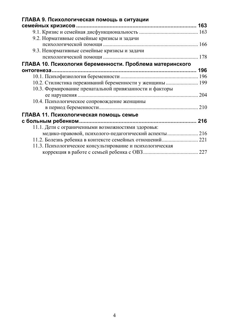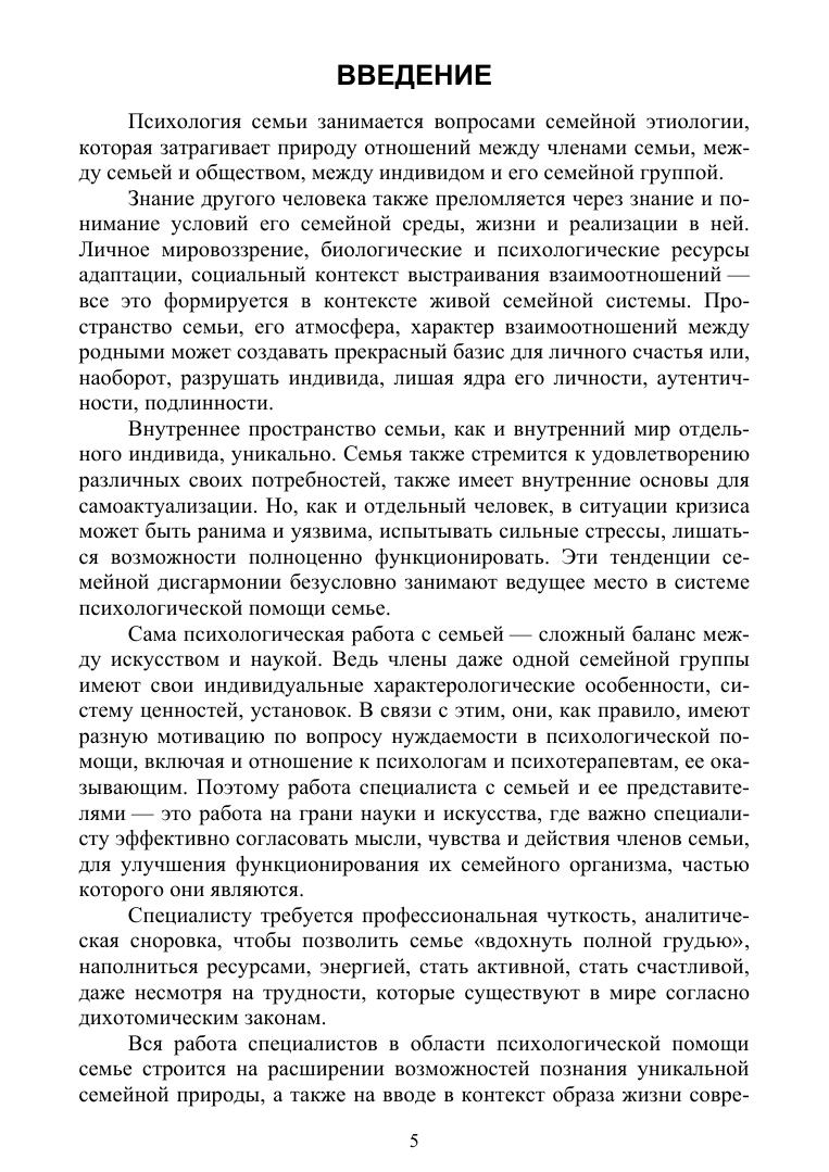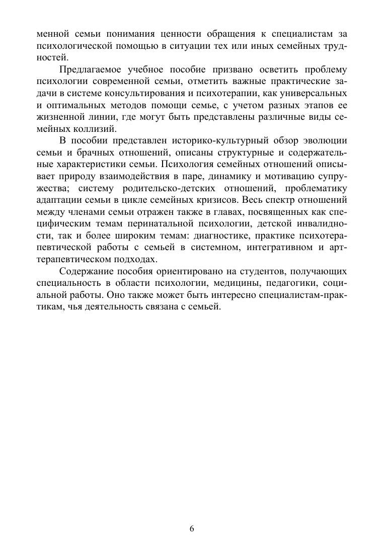 Предлагаемое учебное пособие призвано осветить психологические проблемы, часто возникающие у современной семьи. А также рассмотреть задачи и технологии в области консультирования и психотерапевтической работой с семьей на разных этапах ее жизненного цикла. Здесь представлен историко-культурный обзор эволюции семьи и брачных отношений, разобраны структурные и содержательные характеристики семьи с точки зрения системного подхода. В соответствующих главах описывается природа взаимодействия в паре, динамика и мотивация супружества, система детско-родительских отношений, проблематика проживания семьей периода семейных кризисов. Особый спектр отношений между членами семьи исследован в главах, посвященных теме перинатальной психологии, детской инвалидности, диагностике и практике психотерапевтической работы с семьей в различных терапевтических подходах. Содержание пособия ориентировано на студентов вузов, получающих специальность в области психологии, педагогики, медицины и социальной работы. Оно также может быть интересно специалистам-практикам, чья деятельность связана с вопросами семьи и семейной жизни.