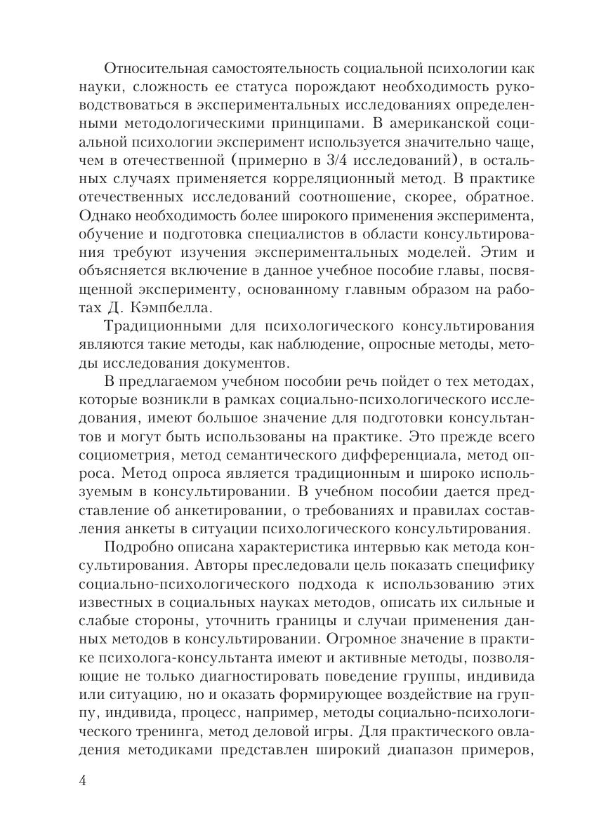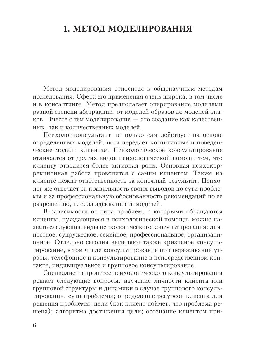 Анализируется ряд основных методов и методик социальной психологии, применяемых в индивидуальном и групповом консультировании, демонстрируются особенности применения методов опроса, интервью, деловых игр, тренинга и других с целью раскрытия проблем человека в консультировании. Обобщается опыт использования активных методов, оказывающих формирующее воздействие на поведение индивида и группы. В конце каждой темы приводятся задания для практической работы в целях закрепления материала и формирования навыков работы консультанта. Для студентов психологических и социологических факультетов вузов, преподавателей и научных работников в области психологии, социологии.