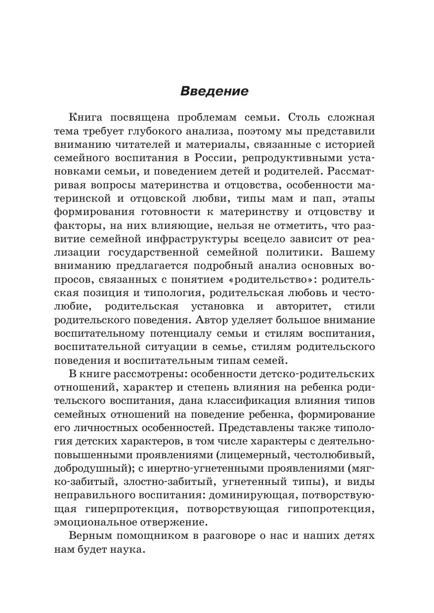 Представляем книгу, которая будет интересна не только профессионалам: методистам, педагогам и семейным психологам, но, без сомнения, поможет неравнодушнным родителям, серьезно от носящимся к многотрудному делу воспитания детей в семье. Пусть не пугает неискушенного читателя специфический язык изложения, изобилующий терминами, — все они заботливо рас толкованы автором. В книге, наряду с научными выкладками, много интересных примеров из жизни и из книг замечательных педагогов. Рекомендации Министерства образования России, а также выдержки из авторских статей ученых практиков по проблемам детско родительских отношений и развития семейного воспитания в нашей стране также могут быть очень полезны родителям, особенно родителям школьников.