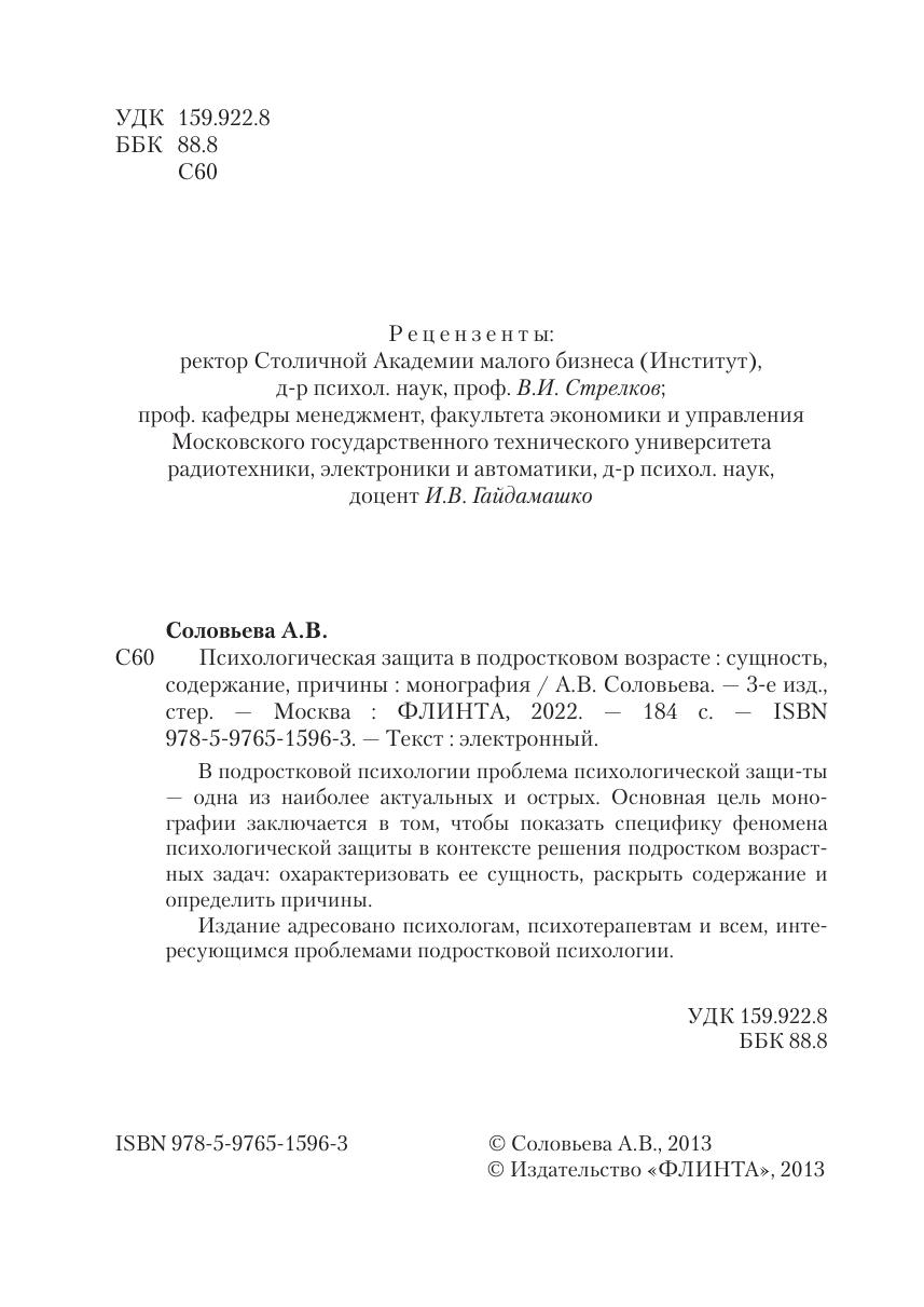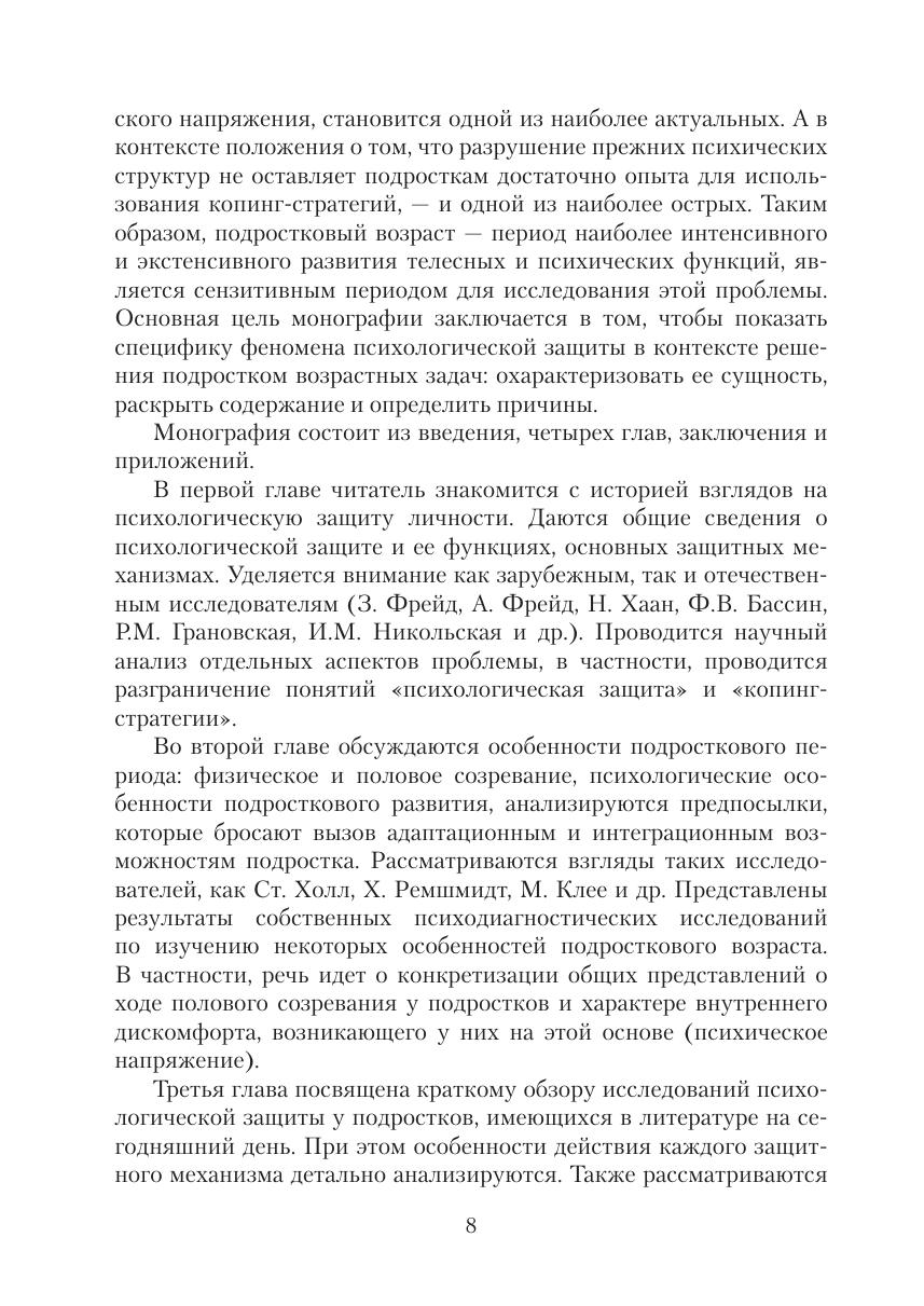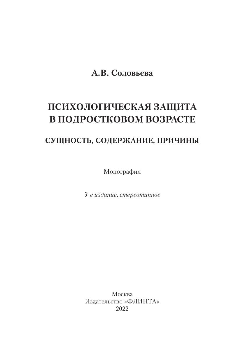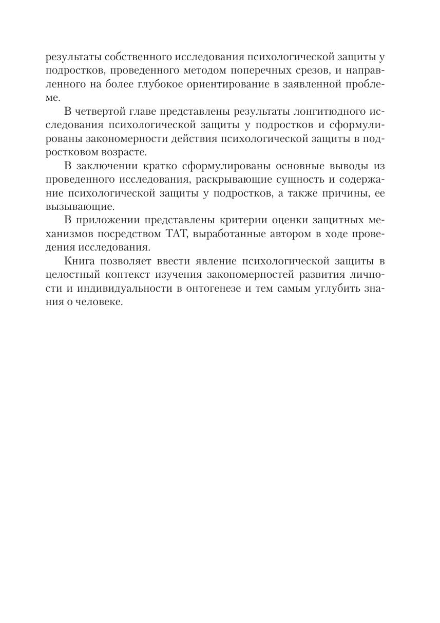 В подростковой психологии проблема психологической защиты — одна из наиболее актуальных и острых. Основная цель монографии заключается в том, чтобы показать специфику феномена психологической защиты в контексте решения подростком возрастных задач: охарактеризовать ее сущность, раскрыть содержание и определить причины.