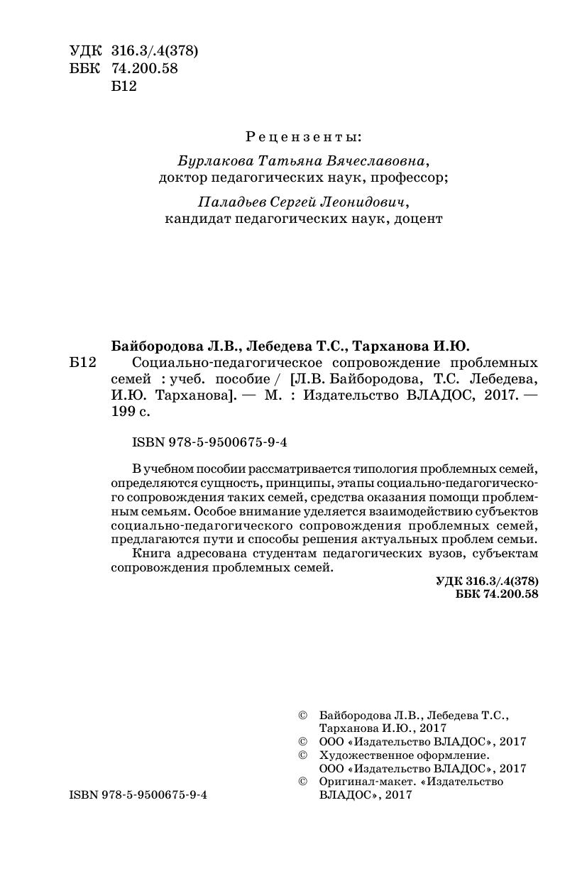 В учебном пособии рассматривается типология проблемных семей, определяются сущность, принципы, этапы социально-педагогического сопровождения таких семей, средства оказания помощи проблемным семьям. Особое внимание уделяется взаимодействию субъектов социально-педагогического сопровождения проблемных семей, предлагаются пути и способы решения актуальных проблем семьи.