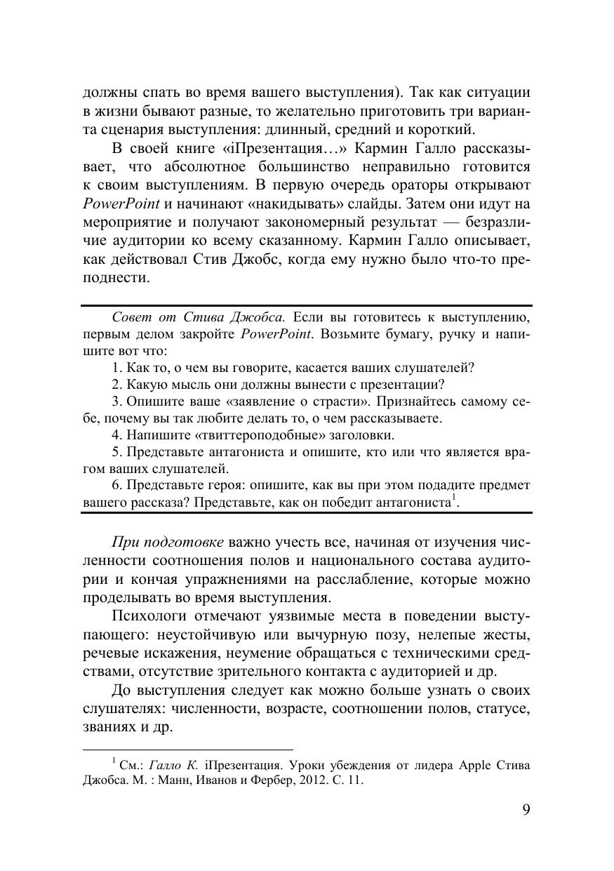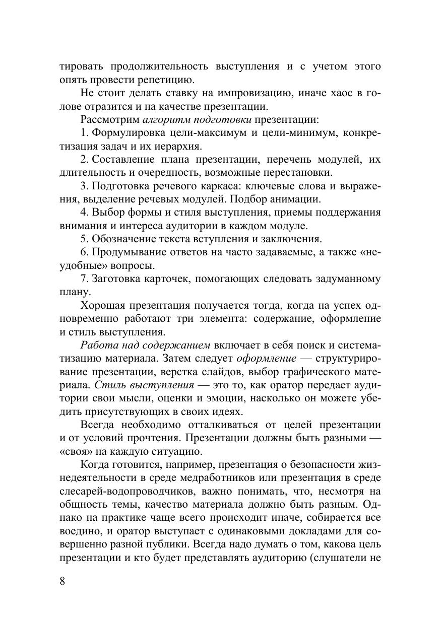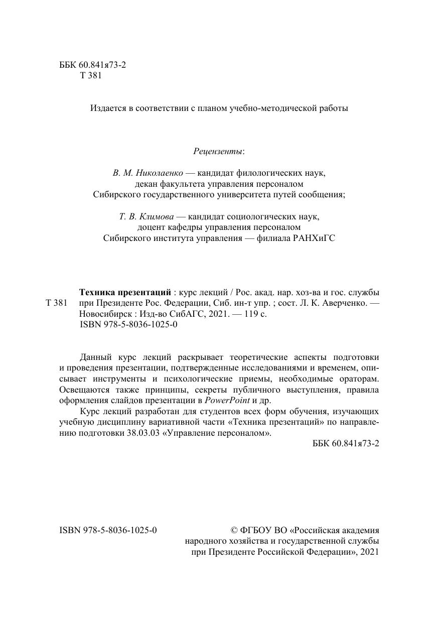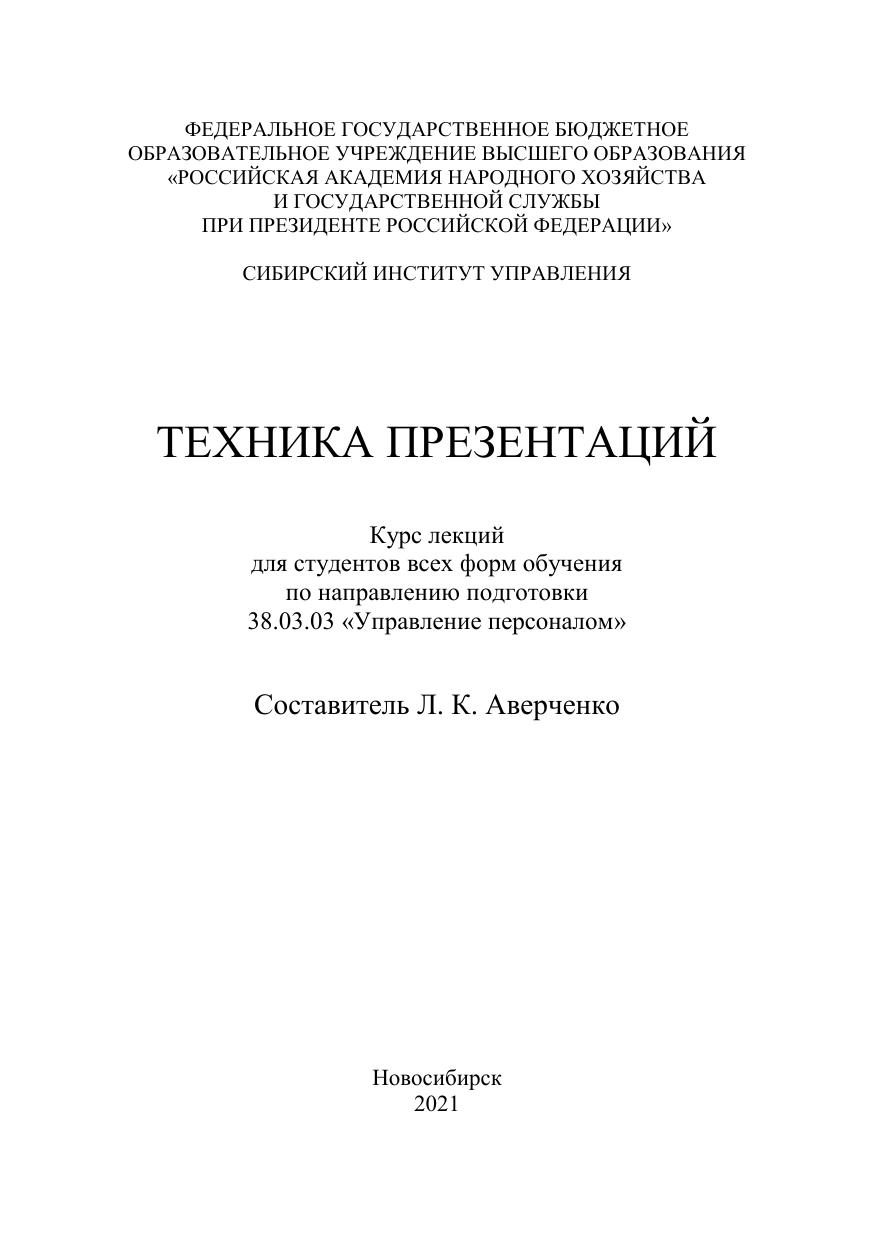 Данный курс лекций раскрывает теоретические аспекты подготовки и проведения презентации, подтвержденные исследованиями и временем, опи-сывает инструменты и психологические приемы, необходимые ораторам. Освещаются также принципы, секреты публичного выступления, правила оформления слайдов презентации в PowerPoint и др. Курс лекций разработан для студентов всех форм обучения, изучающих учебную дисциплину вариативной части «Техника презентаций» по направле-нию подготовки 38.03.03 «Управление персоналом».