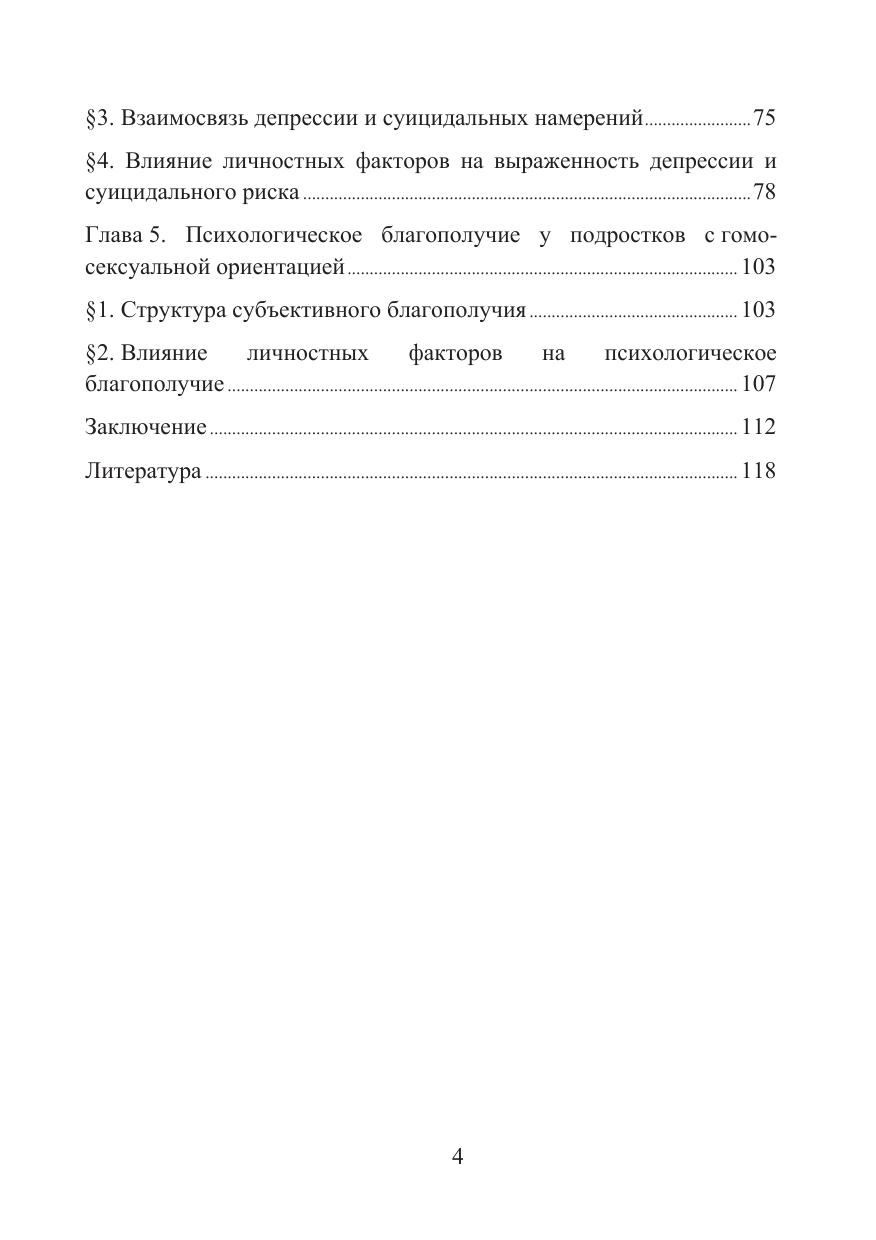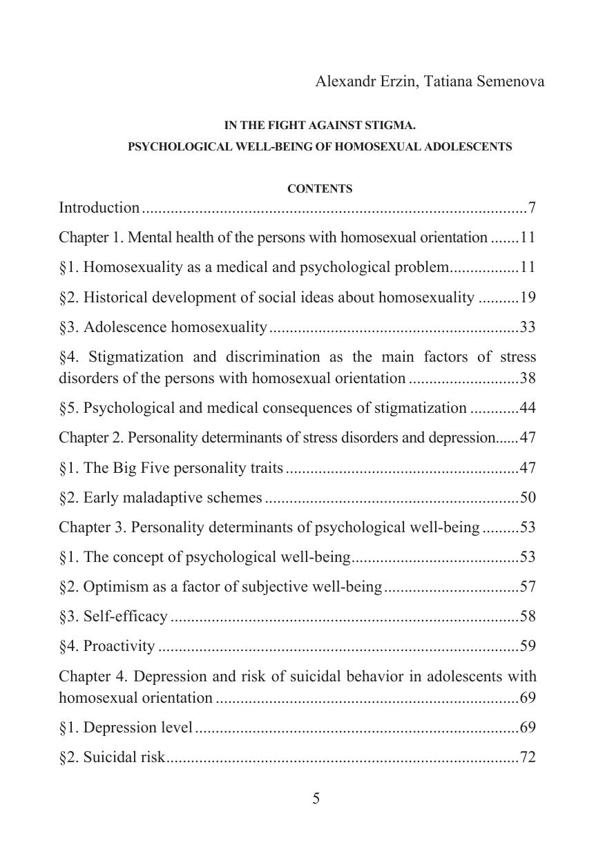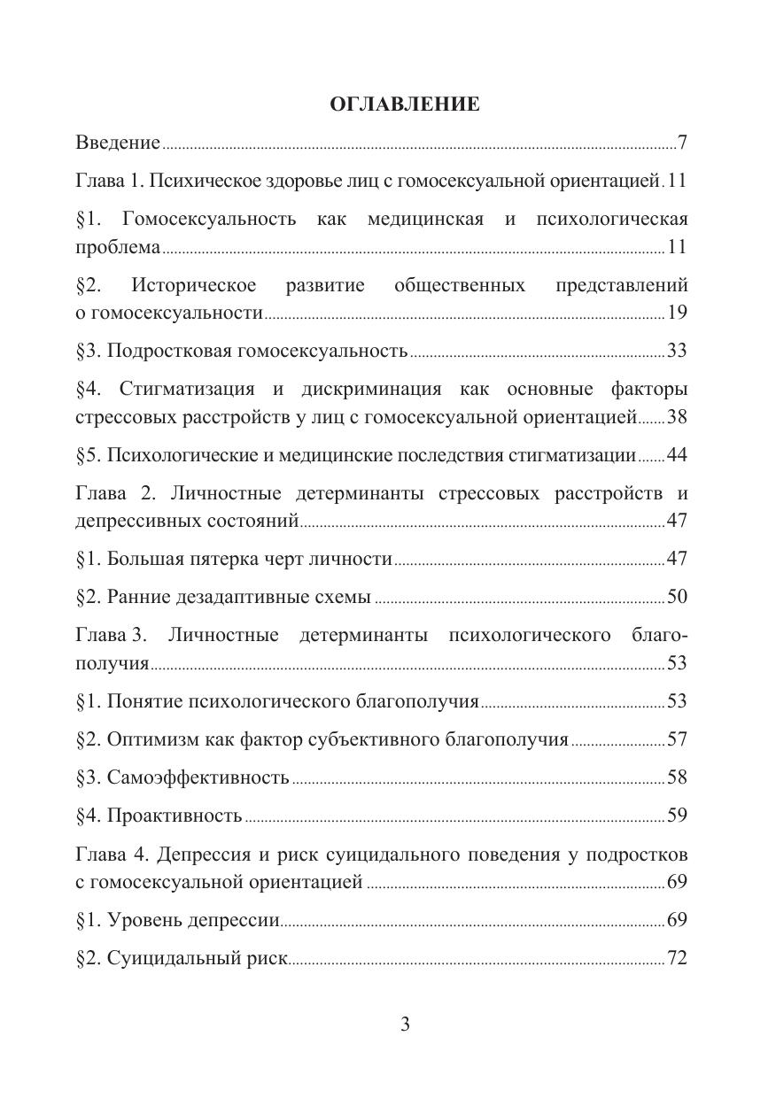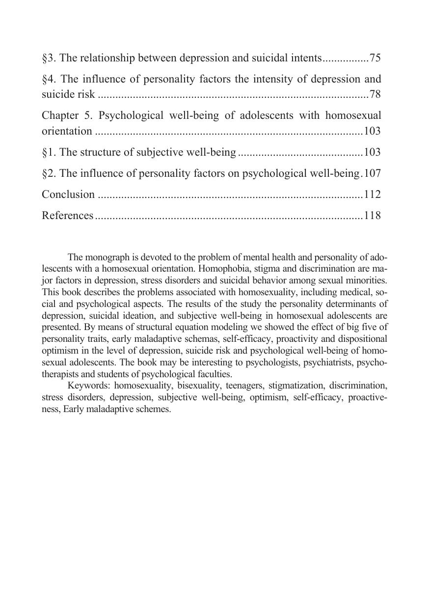 Монография посвящена проблеме психического здоровья и личности подростков с гомосексуальной ориентацией. Гомофобия, стигматизация и дискриминация являются ведущими факторами депрессивных состояний, стрессовых расстройств и суицидального поведения среди представителей сексуальных меньшинств. В данной работе подробно описаны проблемы, связанные с гомосексуальностью, в т.ч. в медицинском, социальном и психологическом аспектах. Представлены результаты исследования личностных детерминант депрессии, суицидальных намерений и субъективного благополучия у гомосексуальных подростков. С помощью математического моделирования показано влияние большой пятёрки черт личности, ранних дезадаптивных схем, самоэффективности, проактивности и диспозиционного оптимизма на уровень депрессии, суицидальный риск и психологическое благополучие подростков с проблемами сексуальной ориентации. Монография может представлять интерес для психологов, психиатров, психотерапевтов, студентов психологических факультетов.