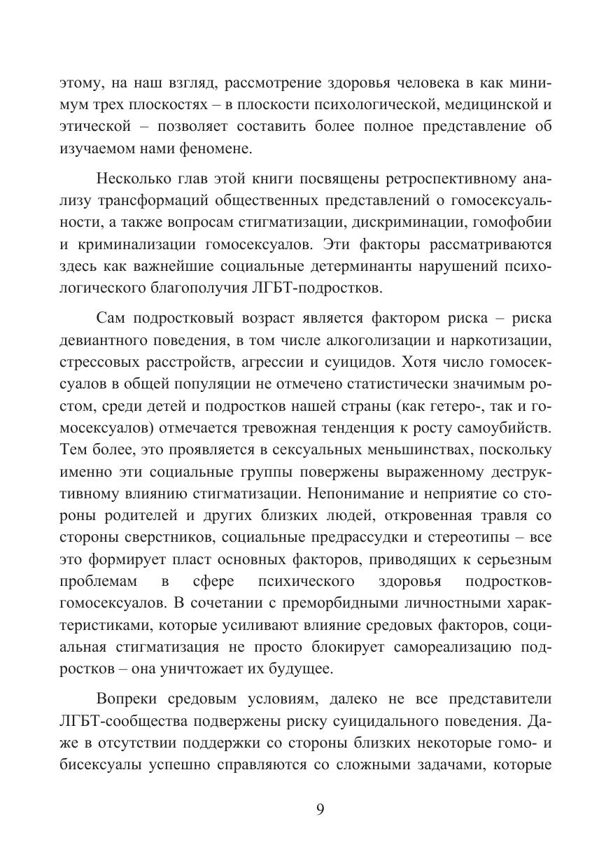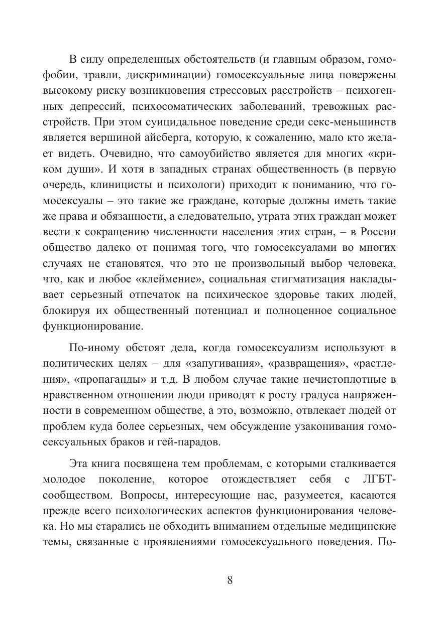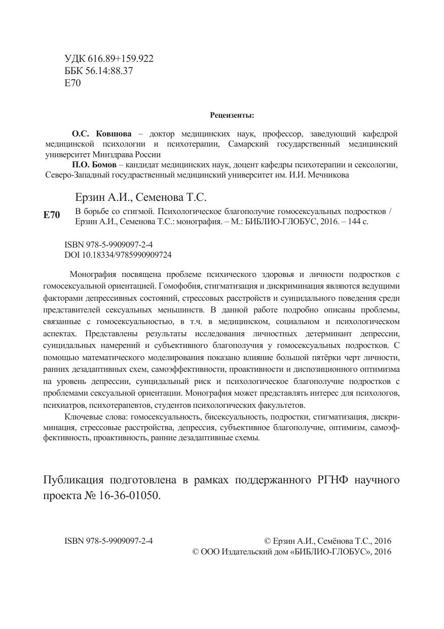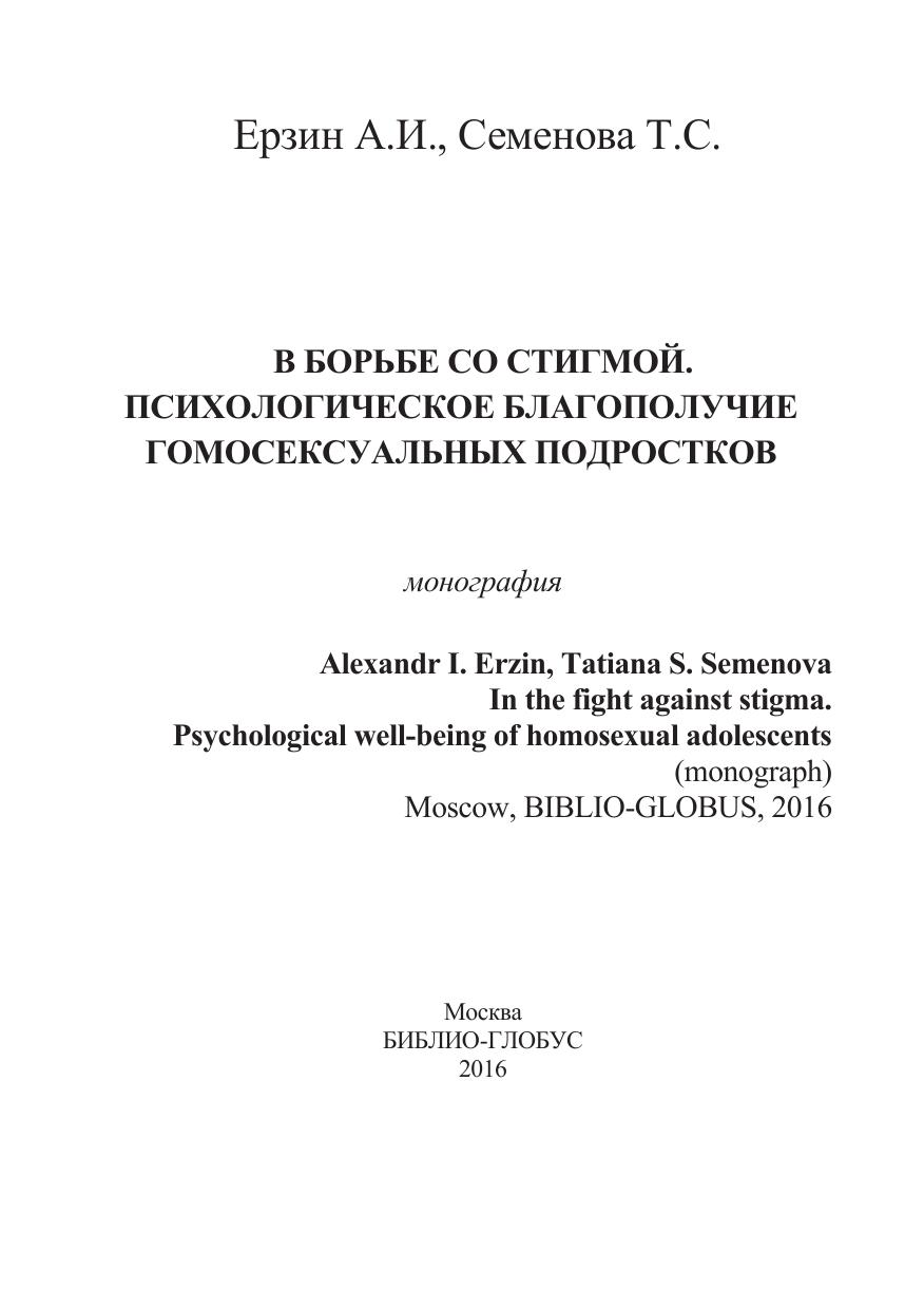 Монография посвящена проблеме психического здоровья и личности подростков с гомосексуальной ориентацией. Гомофобия, стигматизация и дискриминация являются ведущими факторами депрессивных состояний, стрессовых расстройств и суицидального поведения среди представителей сексуальных меньшинств. В данной работе подробно описаны проблемы, связанные с гомосексуальностью, в т.ч. в медицинском, социальном и психологическом аспектах. Представлены результаты исследования личностных детерминант депрессии, суицидальных намерений и субъективного благополучия у гомосексуальных подростков. С помощью математического моделирования показано влияние большой пятёрки черт личности, ранних дезадаптивных схем, самоэффективности, проактивности и диспозиционного оптимизма на уровень депрессии, суицидальный риск и психологическое благополучие подростков с проблемами сексуальной ориентации. Монография может представлять интерес для психологов, психиатров, психотерапевтов, студентов психологических факультетов.