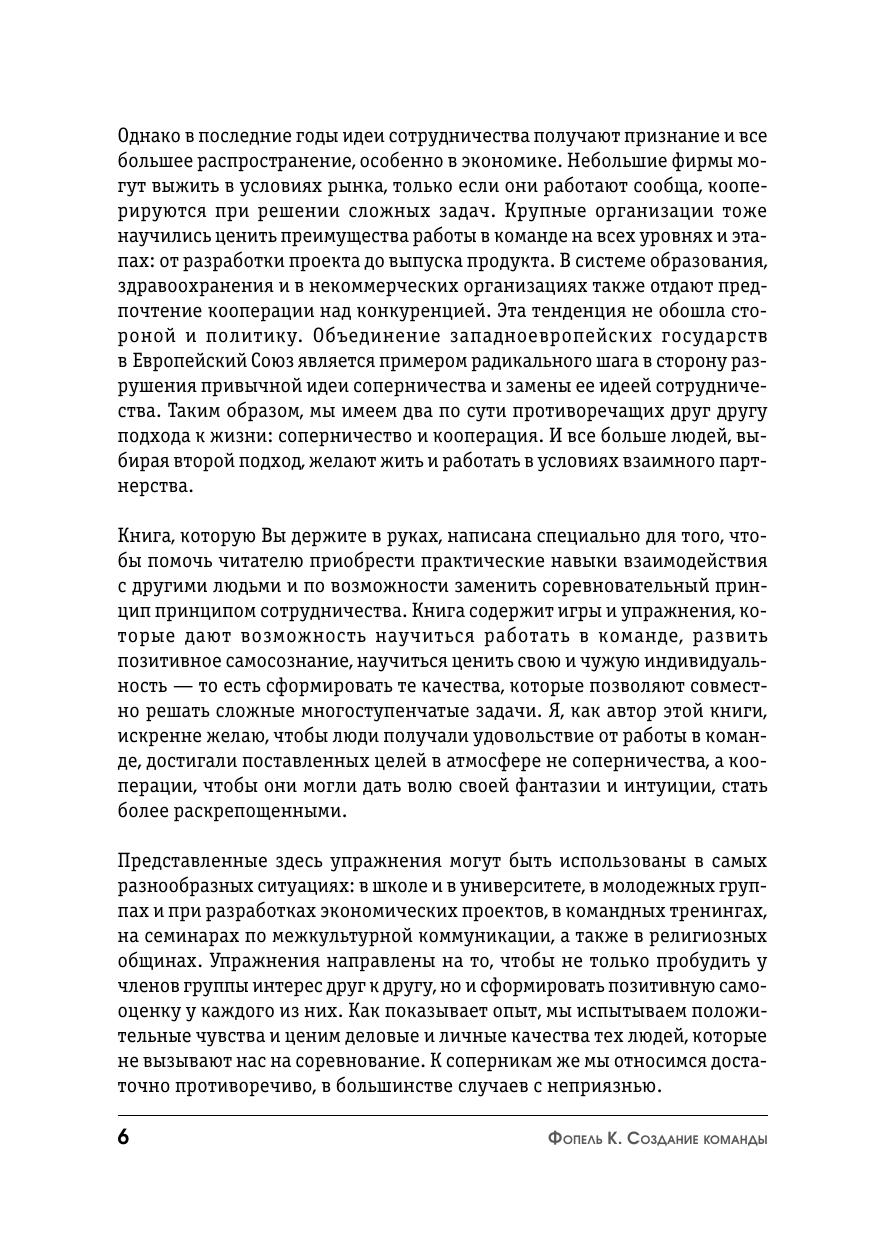 В современном мире способность действовать в команде является одним из наиболее востребованных личных и профессиональных качеств. В книге «Создание команды» представлены психологические игры и упражнения, направленные на обучение сотрудничеству и кооперации. Руководители групп смогут применять процедуры, представленные в сборнике, в самых разных ситуациях: в школах и в организациях, в командных тренингах и в тренингах общения. Секрет их в том, что они раскрывают потенциал человека, способствуют росту самоуважения, учат ценить свою и чужую индивидуальность.