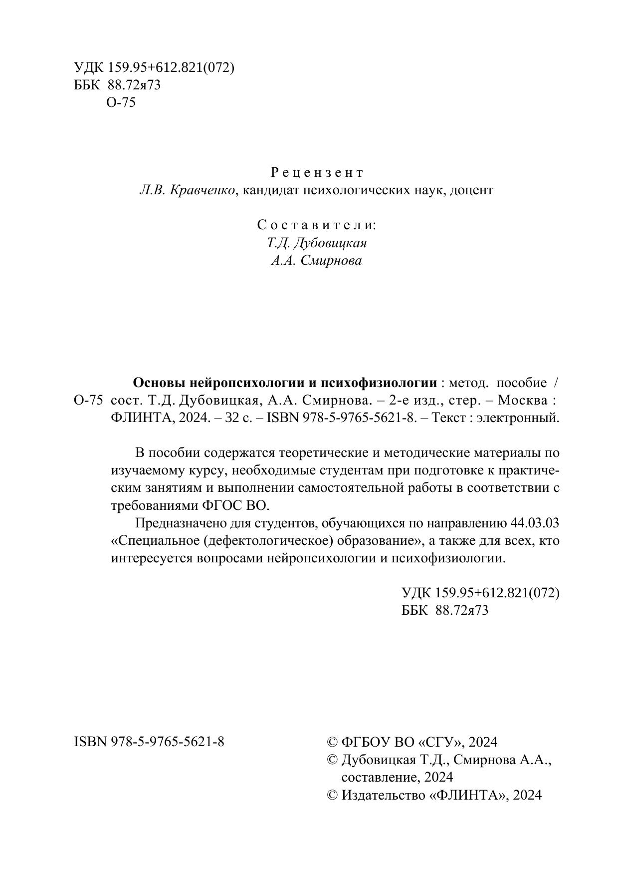 В пособии содержатся теоретические и методические материалы по изучаемому курсу, необходимые студентам при подготовке к практическим занятиям и выполнении самостоятельной работы в соответствии с требованиями ФГОС ВО. Предназначено для студентов, обучающихся по направлению 44.03.03 «Специальное (дефектологическое) образование», а также для всех, кто интересуется вопросами нейропсихологии и психофизиологии.