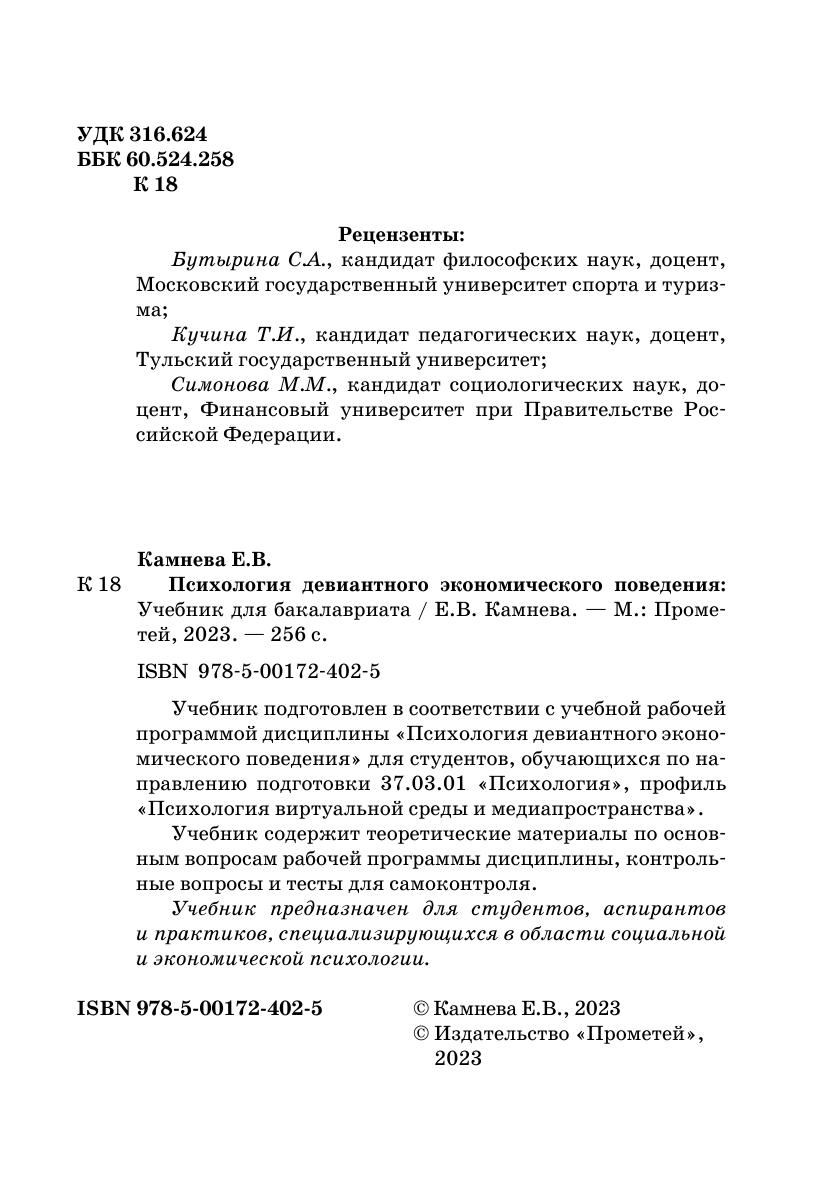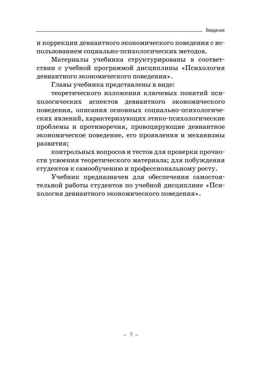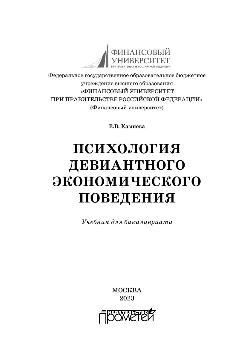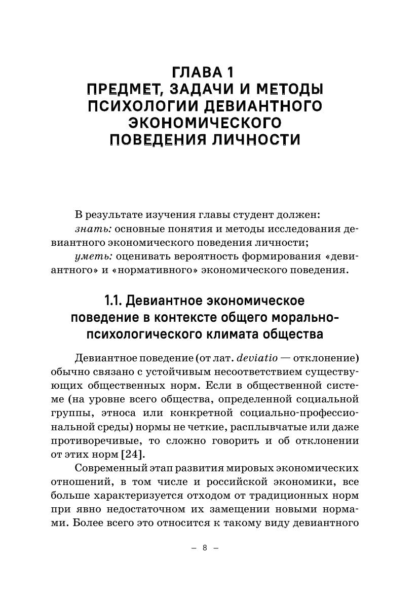 Учебник подготовлен в соответствии с учебной рабочей программой дисциплины «Психология девиантного экономического поведения» для студентов, обучающихся по направлению подготовки 37.03.01 «Психология», профиль «Психология виртуальной среды и медиапространства». Учебник содержит теоретические материалы по основным вопросам рабочей программы дисциплины, контрольные вопросы и тесты для самоконтроля. Учебник предназначен для студентов, аспирантов и практиков, специализирующихся в области социальной и экономической психологии.