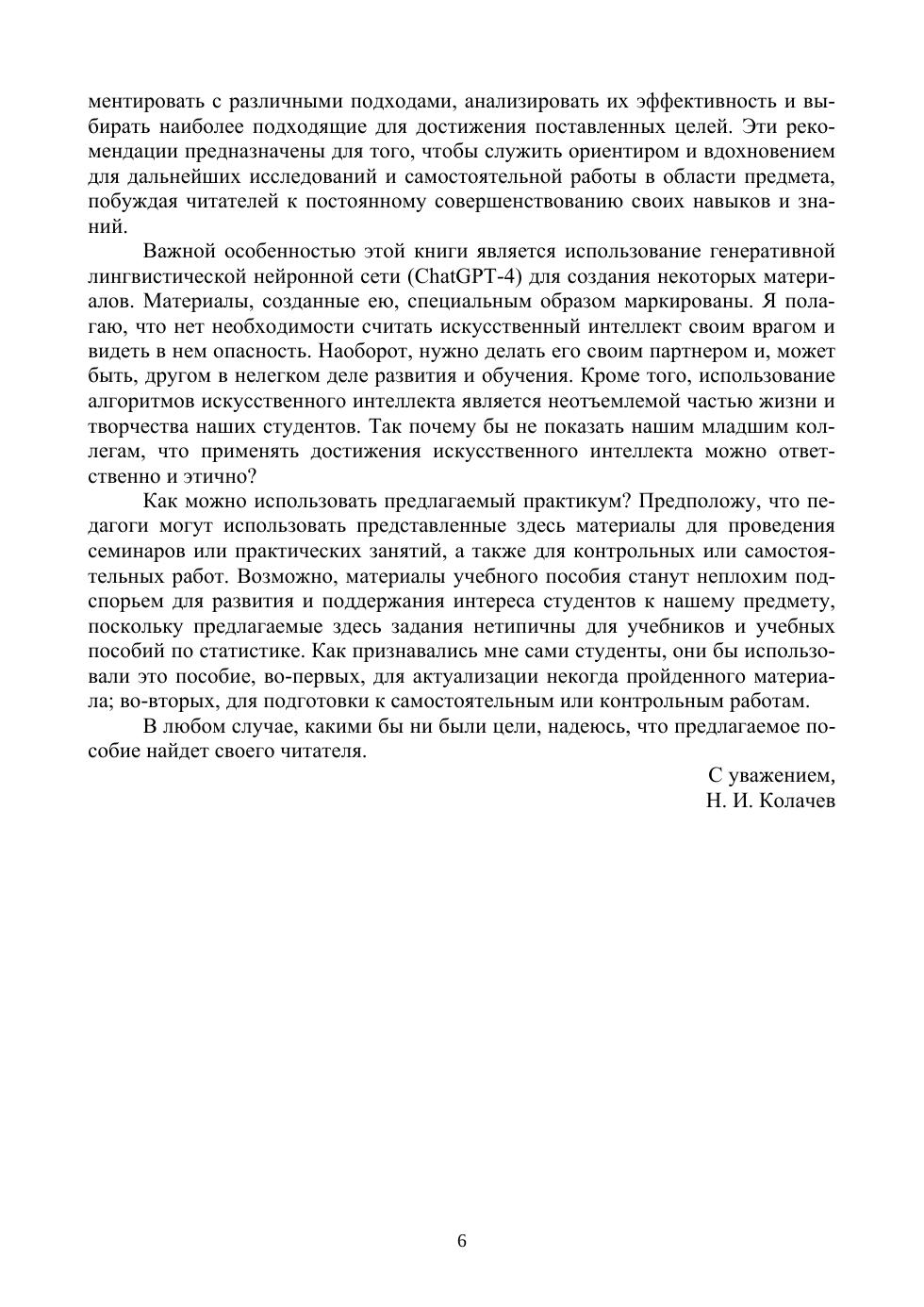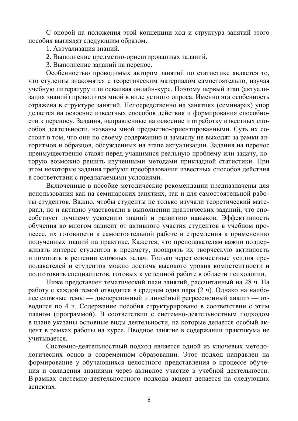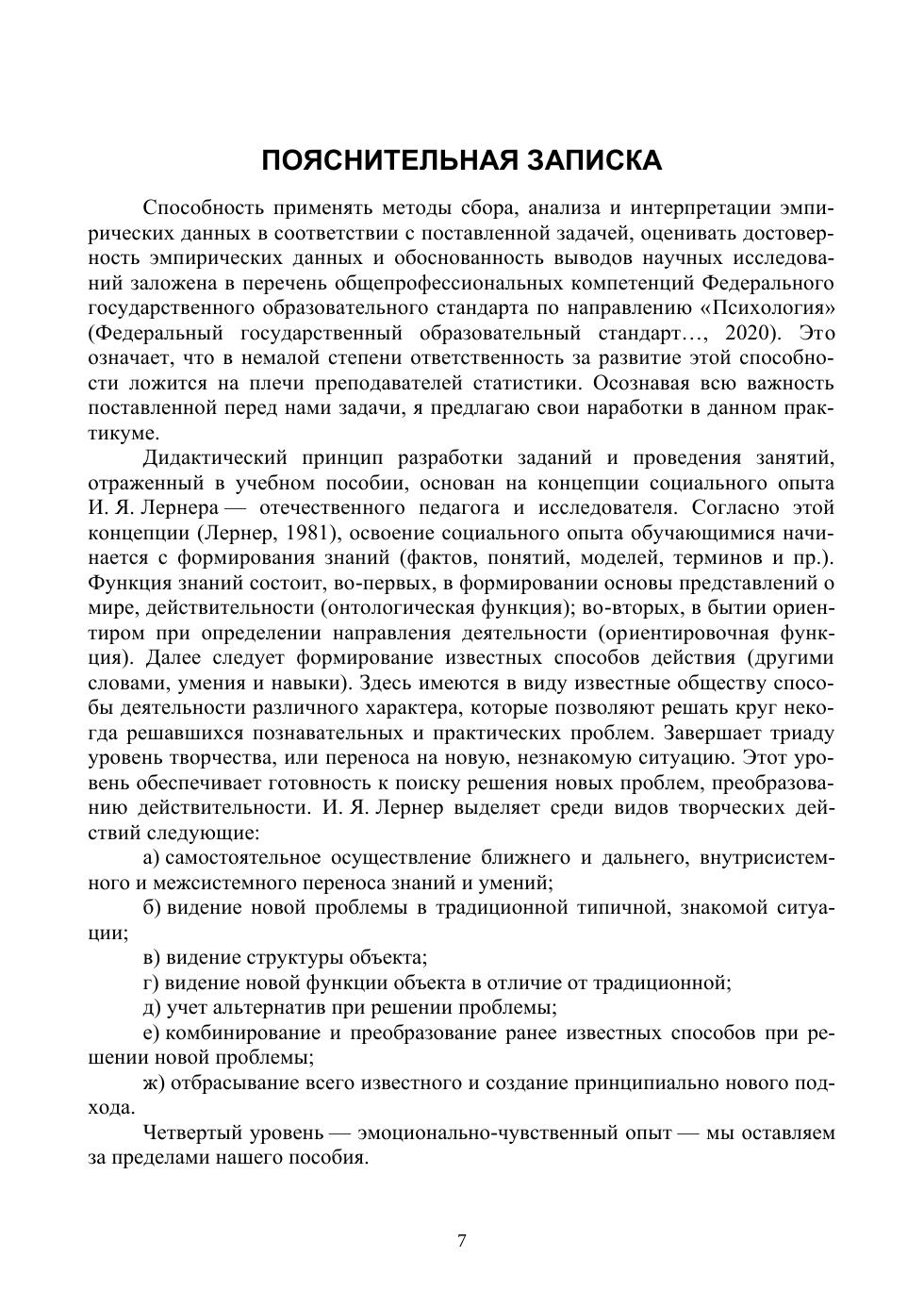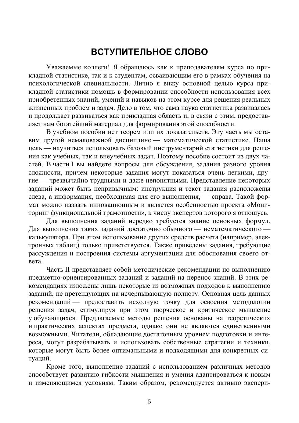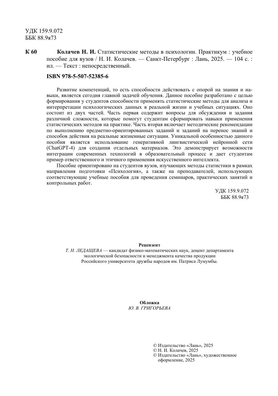 Развитие компетенций, то есть способности действовать с опорой на знания и навыки, является сегодня главной задачей обучения. Данное пособие разработано с целью формирования у студентов способности применять статистические методы для анализа и интерпретации психологических данных в реальной жизни и учебных ситуациях. Оно состоит из двух частей. Часть первая содержит вопросы для обсуждения и задания различной сложности, которые помогут студентам сформировать навыки применения статистических методов на практике. Часть вторая включает методические рекомендации по выполнению предметно-ориентированных заданий и заданий на перенос знаний и способов действия на реальные жизненные ситуации. Уникальной особенностью данного пособия является использование генеративной лингвистической нейронной сети (ChatGPT-4) для создания отдельных материалов. Это демонстрирует возможности интеграции современных технологий в образовательный процесс и дает студентам пример ответственного и этичного применения искусственного интеллекта. Пособие ориентировано на студентов вузов, изучающих методы статистики в рамках направления подготовки «Психология», а также на преподавателей, использующих соответствующие учебные пособия для проведения семинаров, практических занятий и контрольных работ.