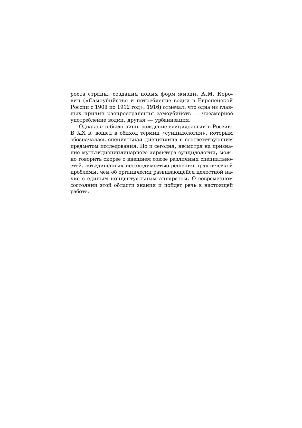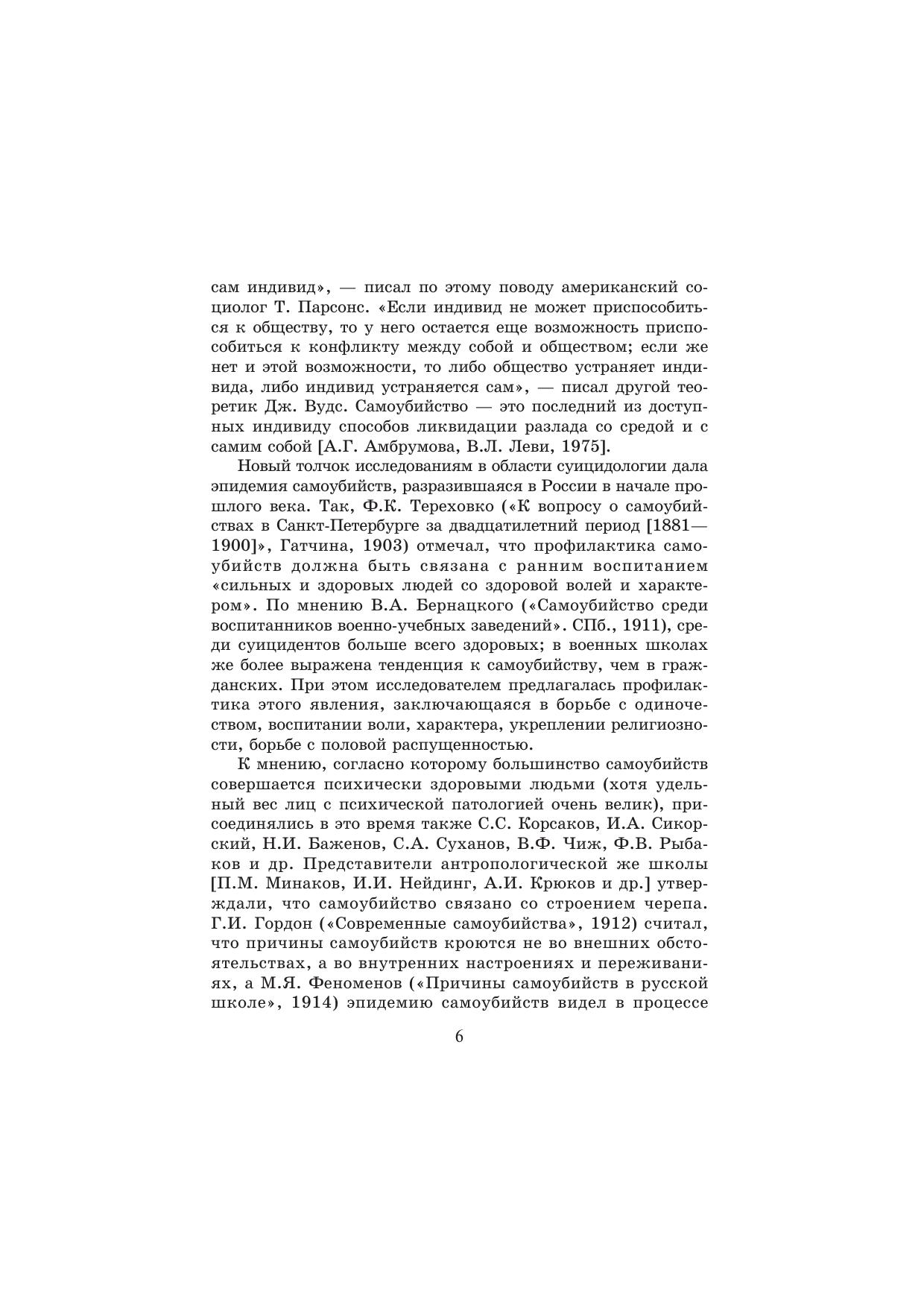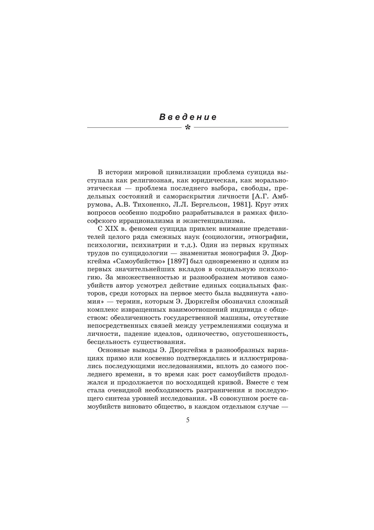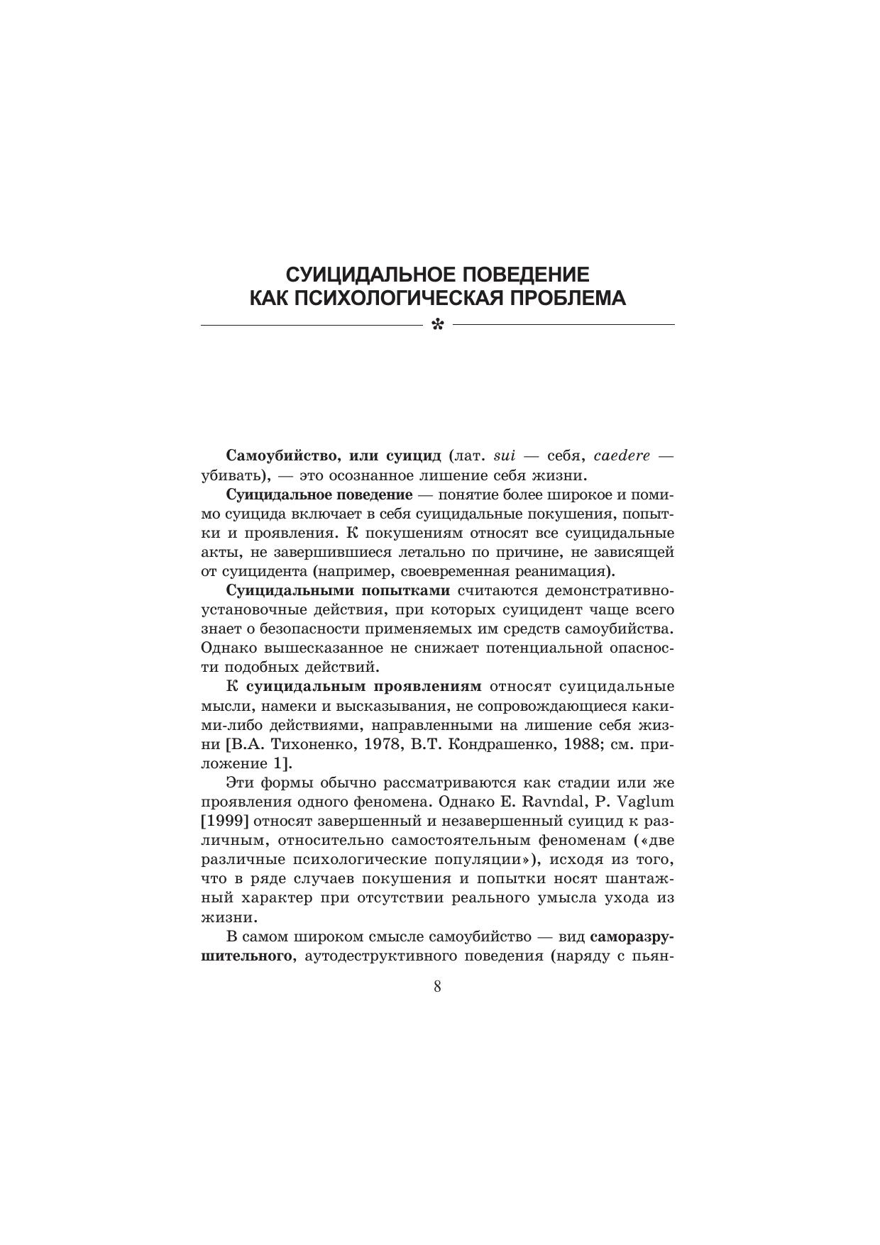 Автор, ученый и психотерапевт, суммирует и излагает в книге свой опыт работы с людьми, находящимися в ситуации суицидоопасного кризиса. Анализируется история развития и современное состояние суицидологии, а также рассматриваются психологические проблемы самоубийств с позиций современных достижений этой науки. Раскрывается феномен социально-психологической дезадаптации и анализируется его роль в генезисе суицидального поведения. Изложен ряд методик психологической диагностики суицидального риска. Особое внимание уделяется вопросам психопрофилактики и психотерапии в условиях психологического кризиса. Для студентов, аспирантов и преподавателей психологических факультетов вузов.