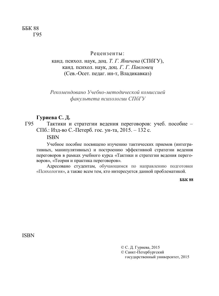 Учебное пособие посвящено изучению тактических приемов (интегративных, манипулятивных) и построению эффективной стратегии ведения переговоров в рамках учебного курса «Тактики и стратегии ведения переговоров», «Теория и практика переговоров». Адресовано студентам, обучающимся по направлению подготовки «Психология», а также всем тем, кто интересуется данной проблематикой.