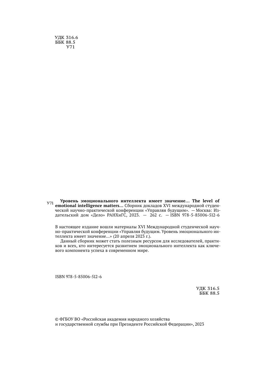 В настоящее издание вошли материалы XVI Международной студенческой научно-практической конференции «Управляя будущим. Уровень эмоционального интеллекта имеет значение…» (20 апреля 2023 г.). Данный сборник может стать полезным ресурсом для исследователей, практиков и всех, кто интересуется развитием эмоционального интеллекта как ключевого компонента успеха в современном мире.