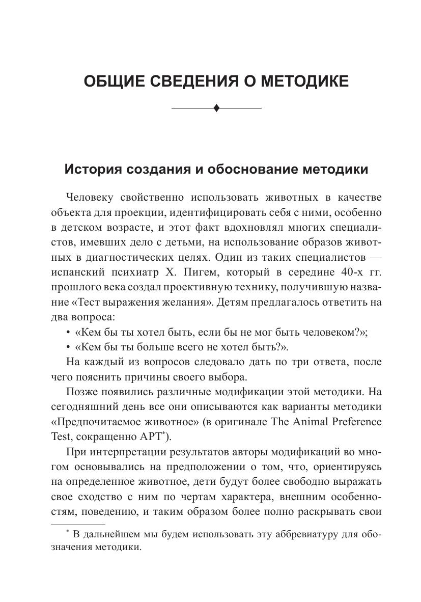 Пособие поможет специалистам научиться грамотно применять проективную методику «Предпочитаемое животное» (АРТ) в работе с детьми и подростками. Эта компактная методика позволяет получить важнейшую диагностическую информацию об особенностях личности человека.