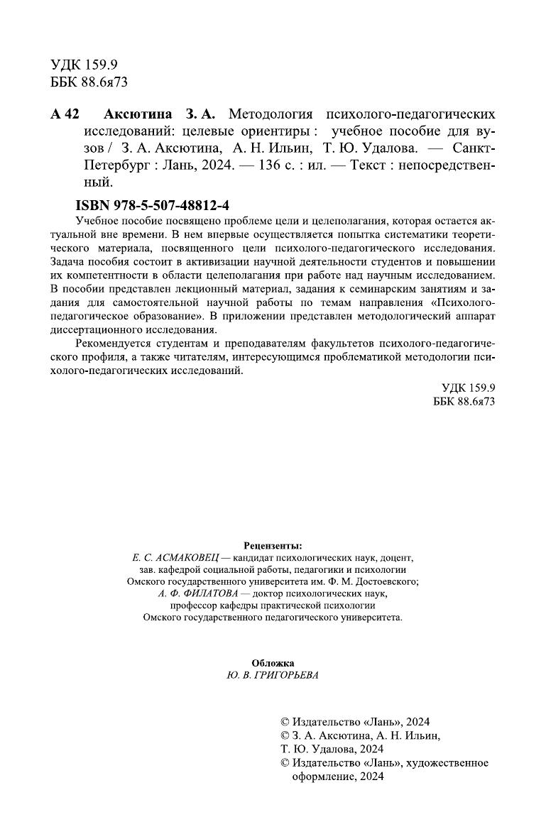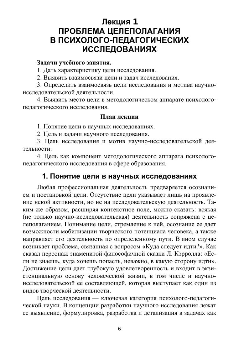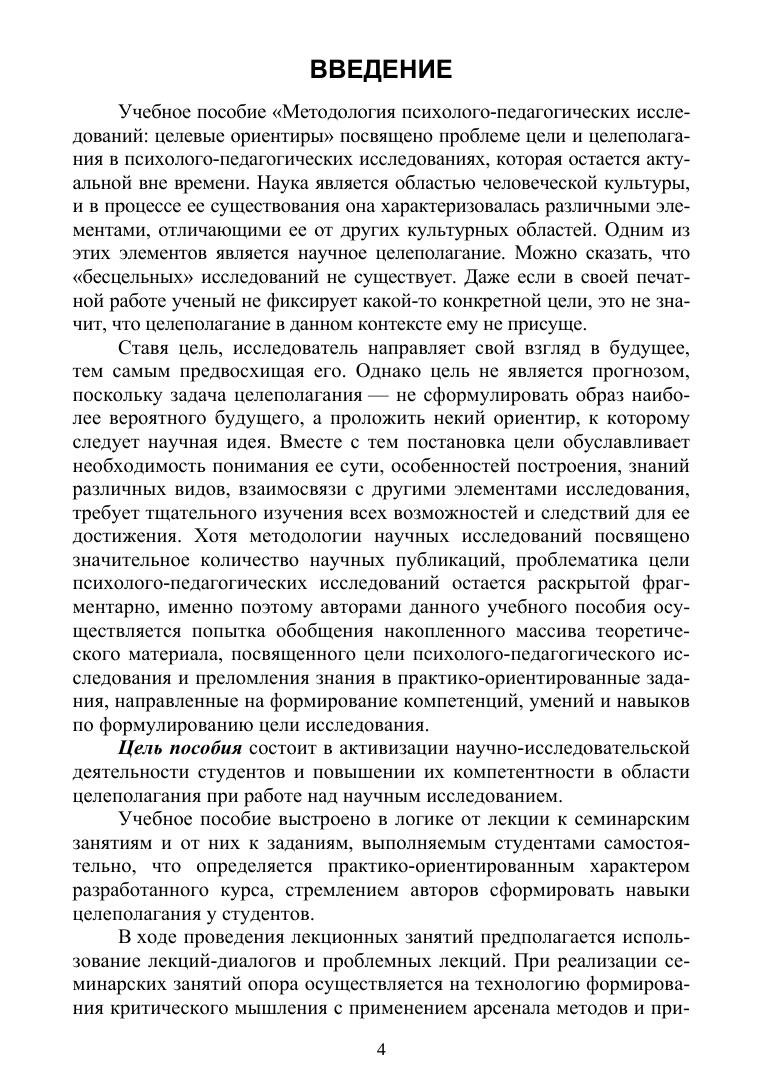 Учебное пособие посвящено проблеме цели и целеполагания, которая оста-ется актуальной вне времени. В нем впервые осуществляется попытка системати-ки теоретического материала, посвященного цели психолого-педагогического исследования. Задача пособия состоит в активизации научной деятельности сту-дентов и повышении их компетентности в области целеполагания при работе над научным исследованием. В пособии представлен лекционный материал, задания к семинарским занятиям и задания для самостоятельной научной работы по темам направления «Психолого-педагогическое образование». В приложении представ-лен методологический аппарат диссертационного исследования. Рекомендуется студентам и преподавателям факультетов психолого-педагогиче-ского профиля, а также читателям, интересующимся проблематикой методологии психолого-педагогических исследований.