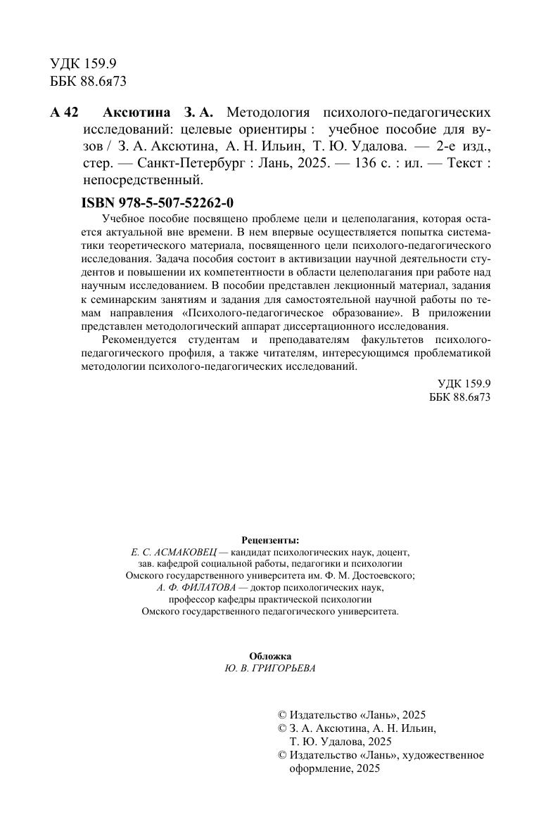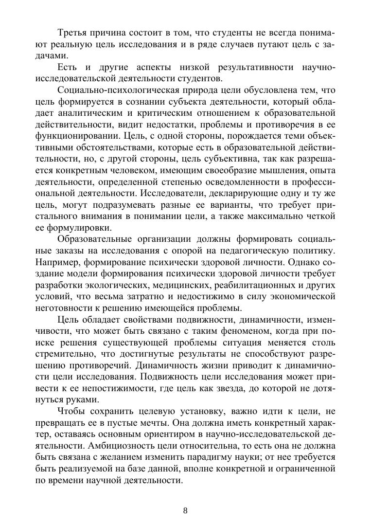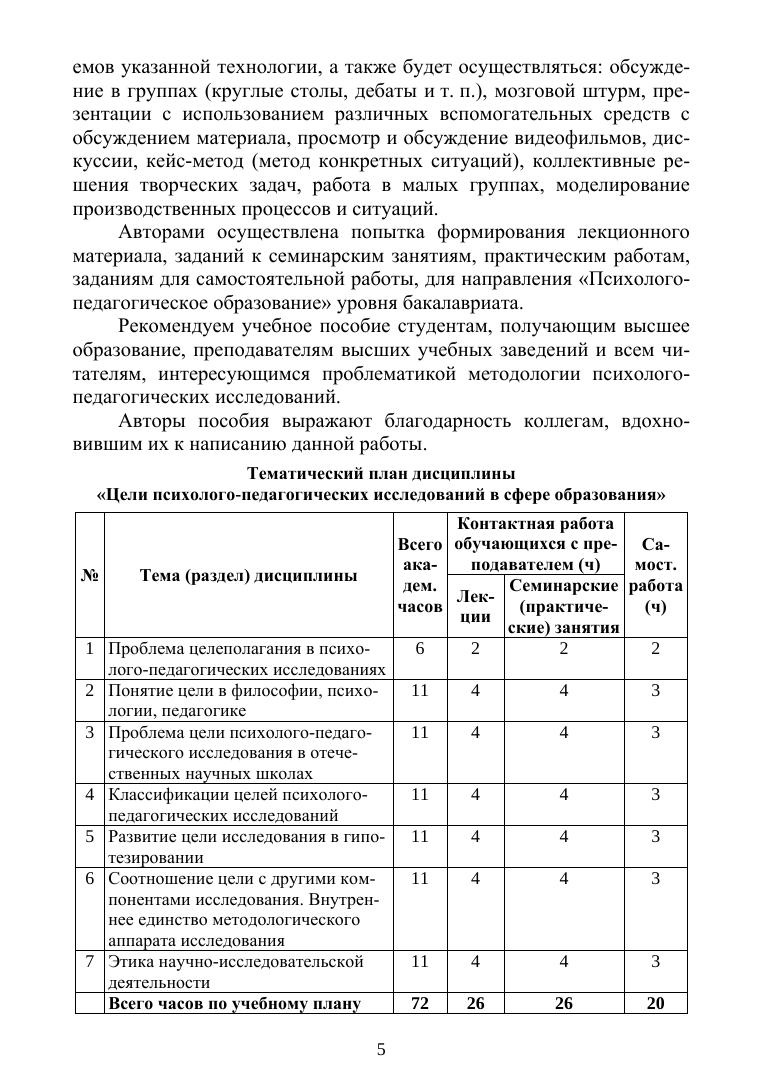 Учебное пособие посвящено проблеме цели и целеполагания, которая оста-ется актуальной вне времени. В нем впервые осуществляется попытка системати-ки теоретического материала, посвященного цели психолого-педагогического исследования. Задача пособия состоит в активизации научной деятельности сту-дентов и повышении их компетентности в области целеполагания при работе над научным исследованием. В пособии представлен лекционный материал, задания к семинарским занятиям и задания для самостоятельной научной работы по темам направления «Психолого-педагогическое образование». В приложении представ-лен методологический аппарат диссертационного исследования. Рекомендуется студентам и преподавателям факультетов психолого-педагогиче-ского профиля, а также читателям, интересующимся проблематикой методологии психолого-педагогических исследований.