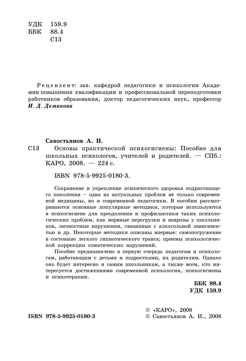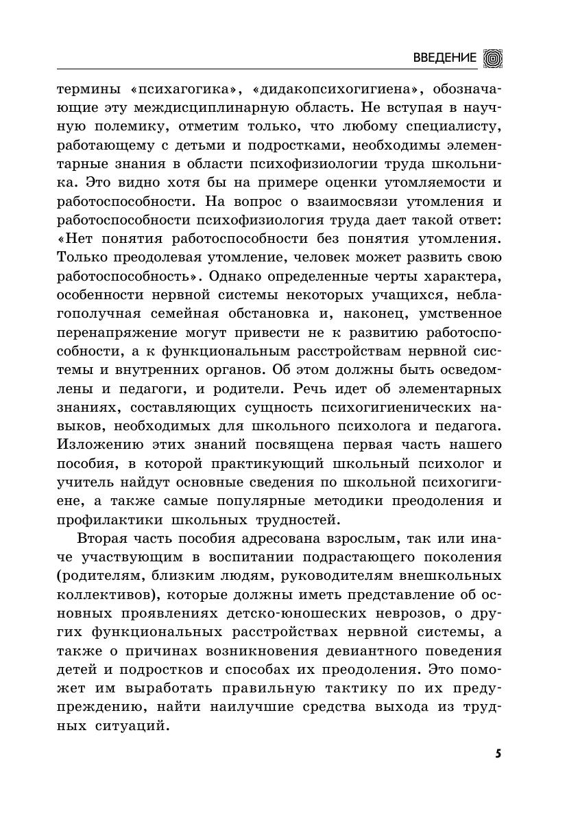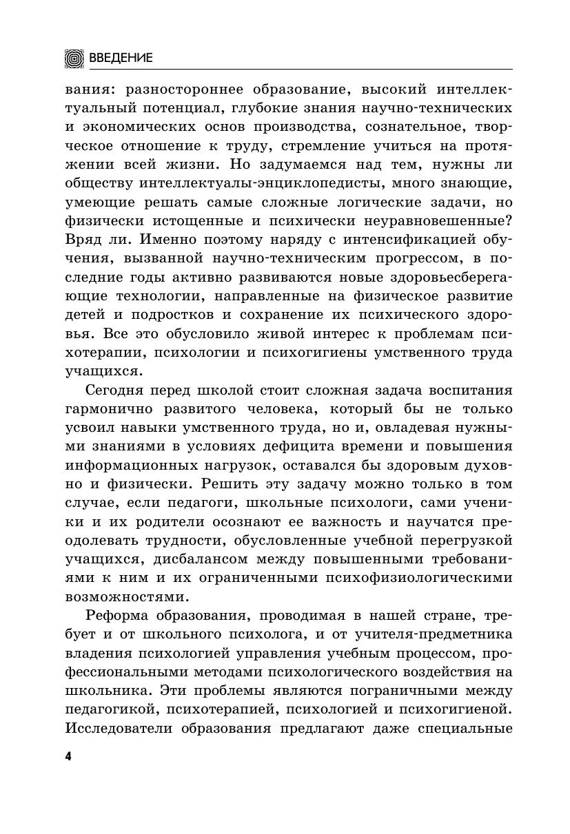 Сохранение и укрепление психического здоровья подрастающего поколения – одна из актуальных проблем не только современной медицины, но и современной педагогики. В пособии рассматриваются основные популярные методики, которые используются в психогигиене для преодоления и профилактики таких психологических проблем, как нервные перегрузки и неврозы у школьников, личностные нарушения, связанные с алкогольной зависимостью и др. Некоторые методики описаны впервые: самопогружение в состояние легкого гипнотического транса приемы психологической коррекции соматических нарушений. Пособие предназначено в первую очередь педагогам и психологам, работающим с детьми и подростками, их родителям. Однако оно будет интересно и самим школьникам, а также всем, кто интересуется достижениями современной психологии, психогигиены и психотерапии.
