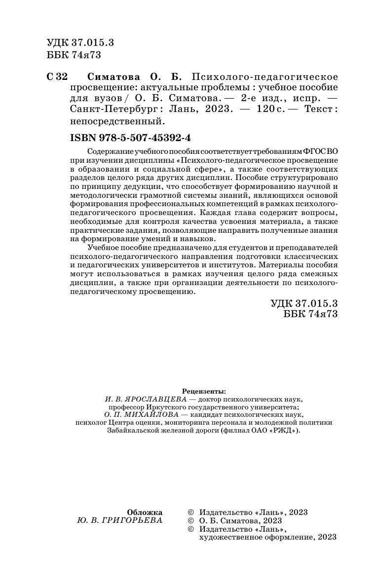 Содержание учебного пособия соответствует требованиям ФГОС ВО при изучении дисциплины «Психолого-педагогическое просвещение в образовании и социальной сфере», а также соответствующих разделов целого ряда других дисциплин. Пособие структурировано по принципу дедукции, что способствует формированию научной и методологически грамотной системы знаний, являющихся основой формирования профессиональных компетенций в рамках психолого-педагогического просвещения. Каждая глава содержит вопросы, необходимые для контроля качества усвоения материала, а также — практические задания, позволяющие направить полученные знания на формирование умений и навыков. Учебное пособие предназначено для студентов и преподавателей психолого-педагогического направления подготовки классических и педагогических университетов и институтов. Материалы пособия могут использоваться в рамках изучения целого ряда смежных дисциплин, а также при организации деятельности по психолого-педагогическому просвещению.