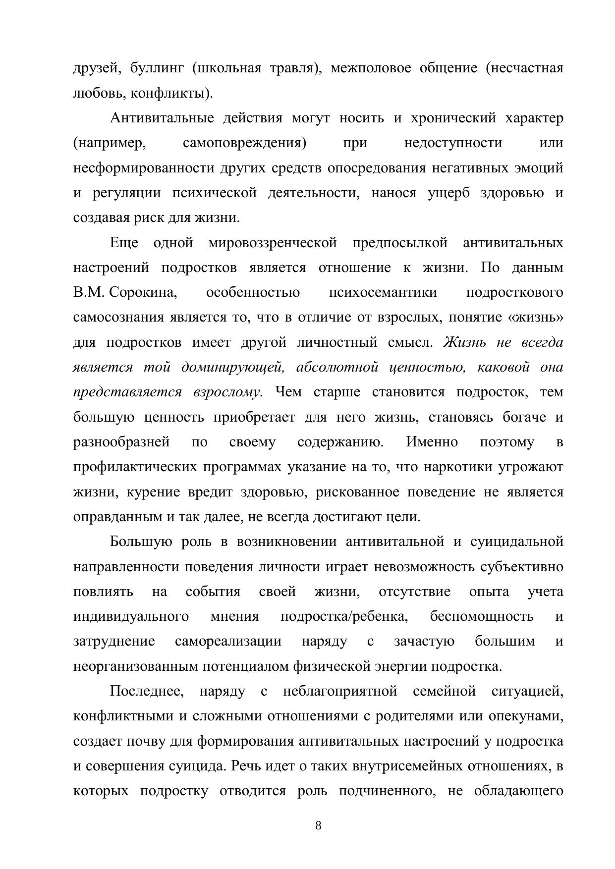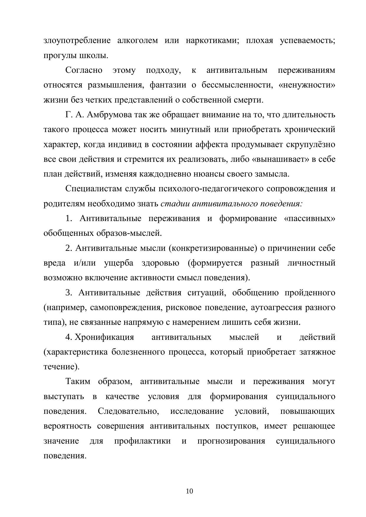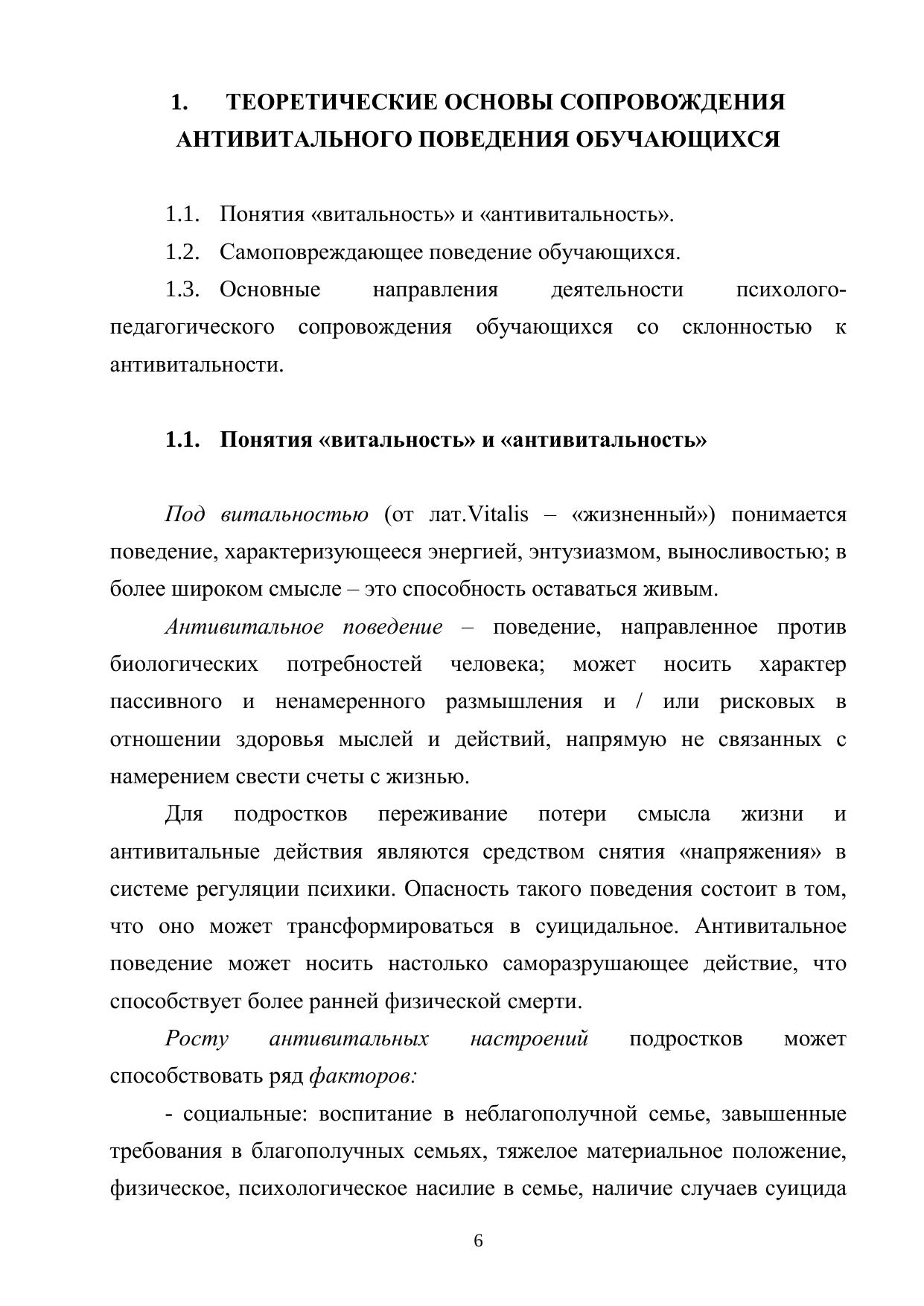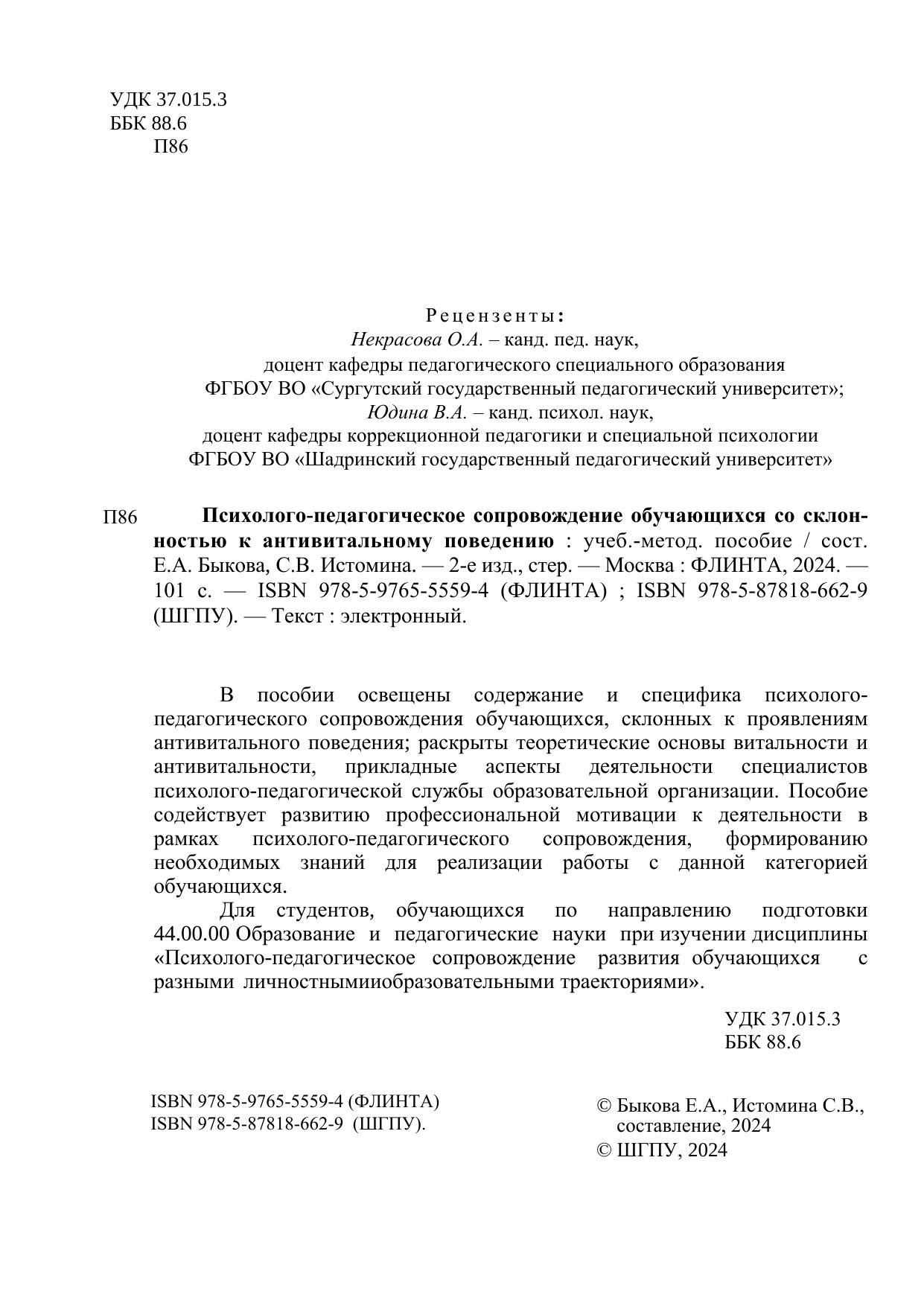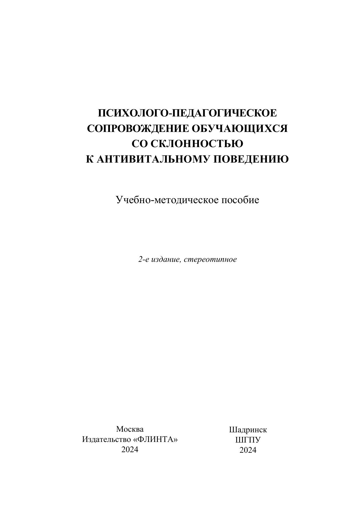 В пособии освещены содержание и специфика психолого-педагогического сопровождения обучающихся, склонных к проявлениям антивитального поведения; раскрыты теоретические основы витальности и антивитальности, прикладные аспекты деятельности специалистов психолого-педагогической службы образовательной организации. Пособие содействует развитию профессиональной мотивации к деятельности в рамках психолого-педагогического сопровождения, формированию необходимых знаний для реализации работы с данной категорией обучающихся.