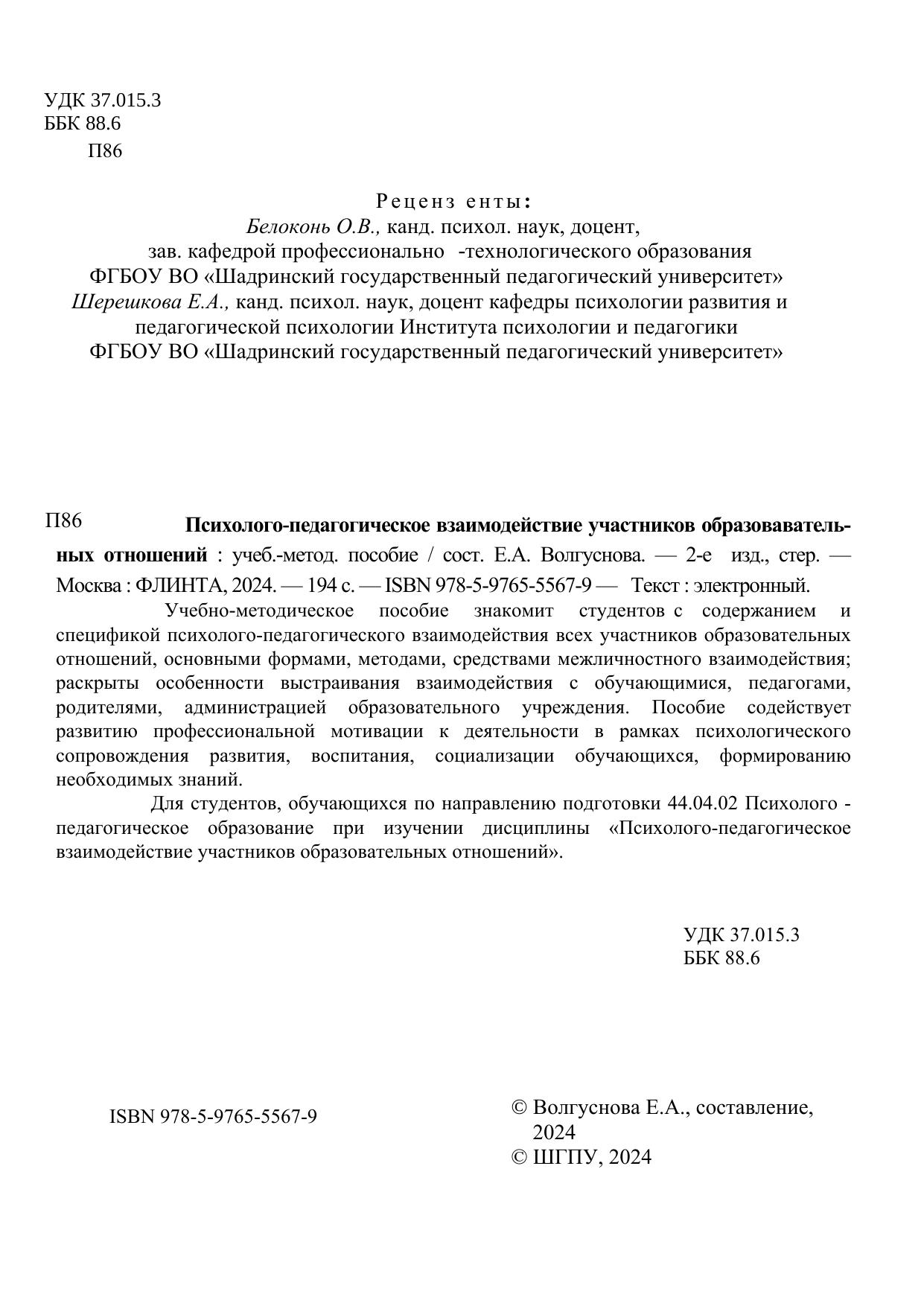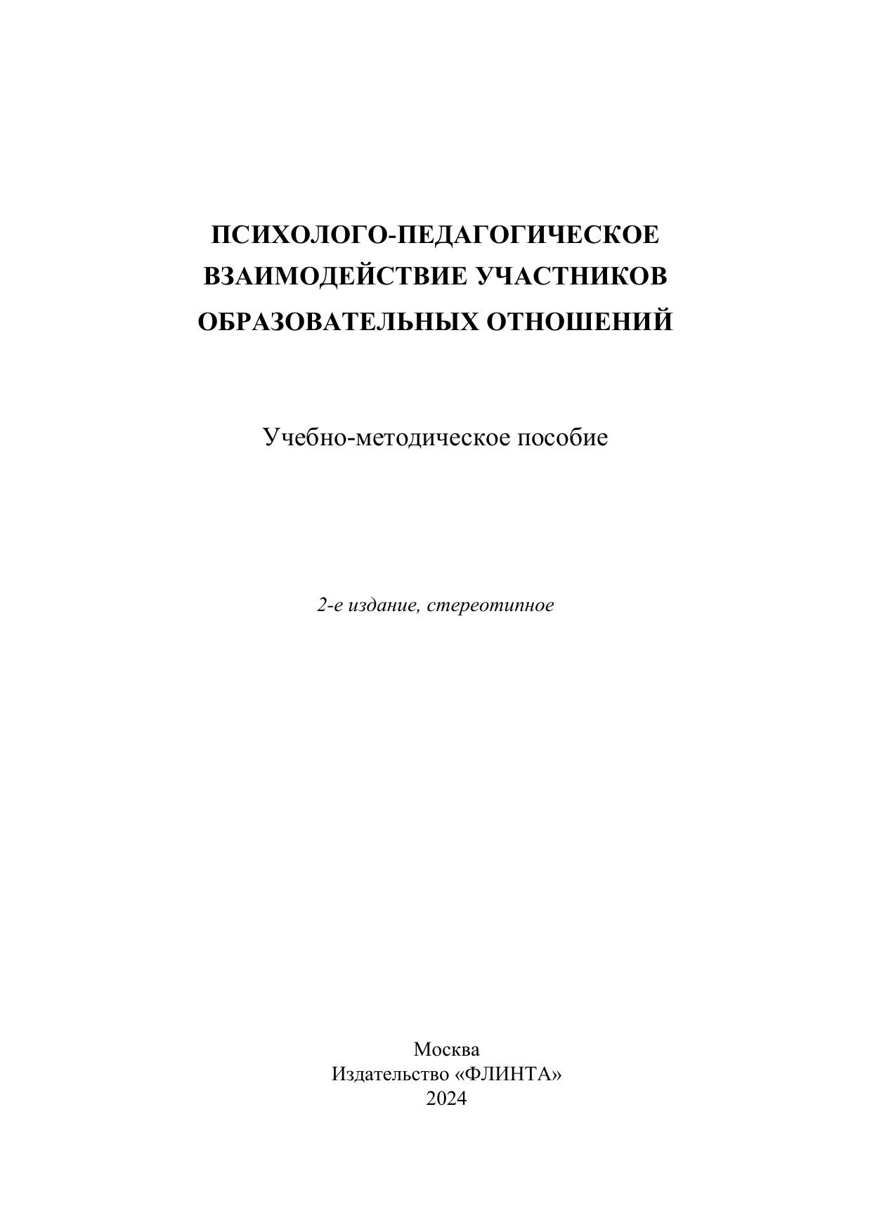 Для студентов, обучающихся по направлению подготовки 44.04.02 Психолого - педагогическое образование при изучении дисциплины «Психолого-педагогическое взаимодействие участников образовательных отношений».